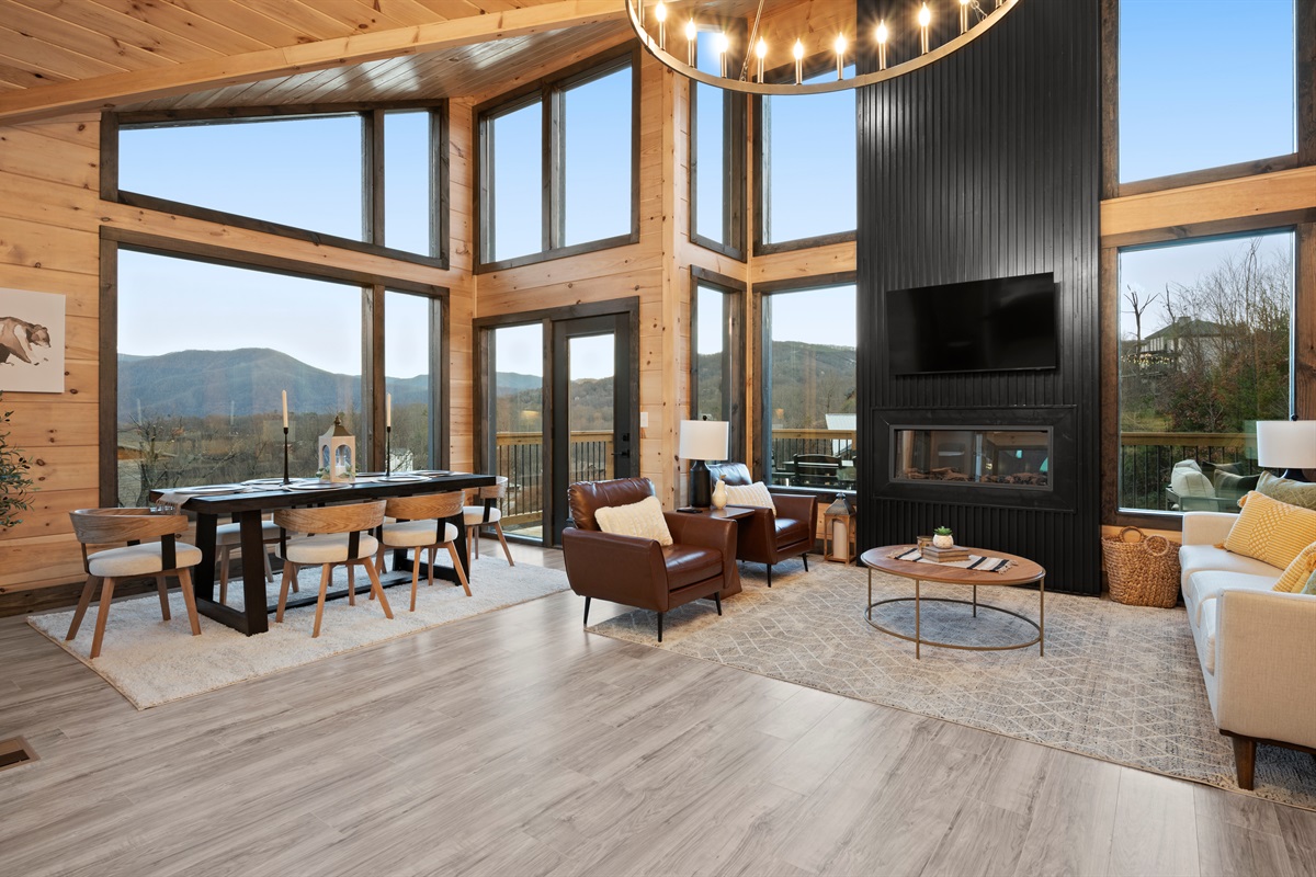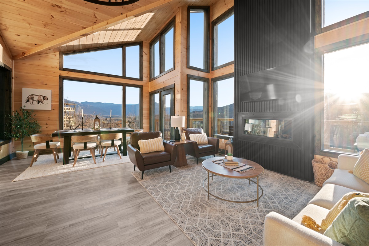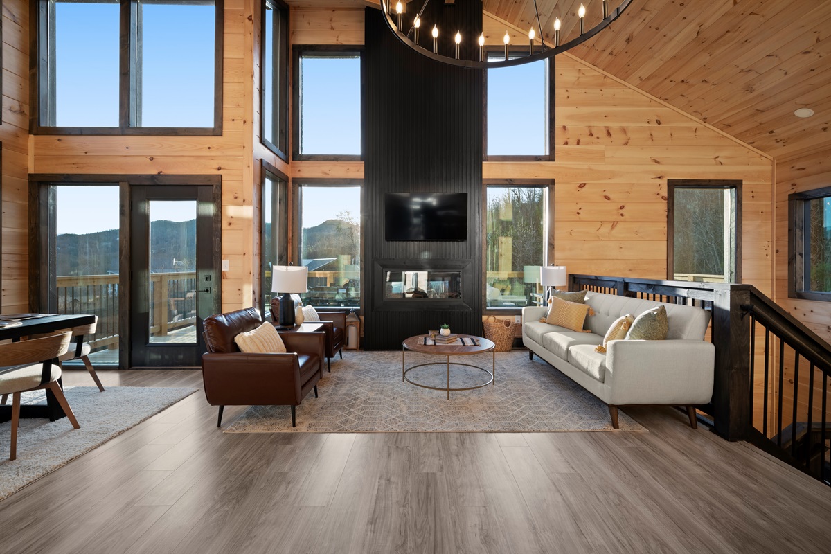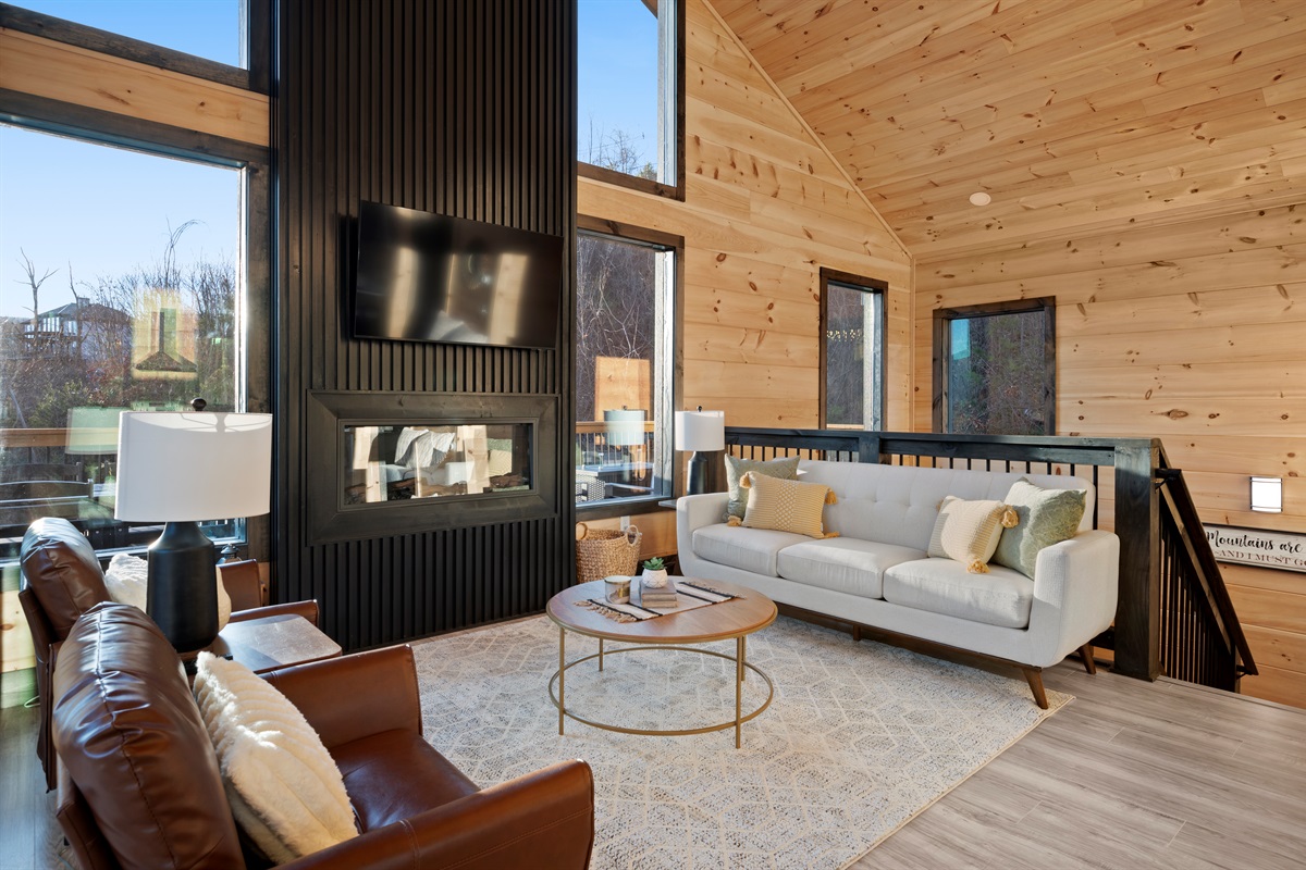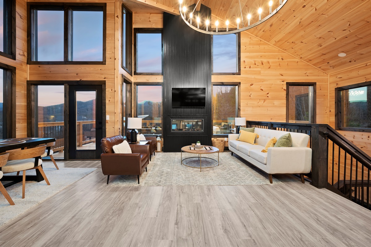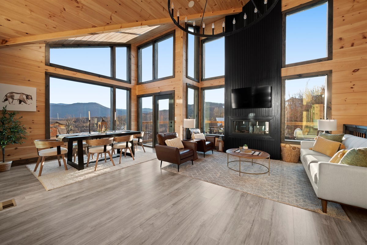 This newly built, two-level cabin was designed around the view. Massive windows flood the space with natural light, framing the Smokies from nearly every angle. Inside, clean modern finishes meet warm wood tones, creating a space that feels elevated, cozy, and effortless the moment you walk in.