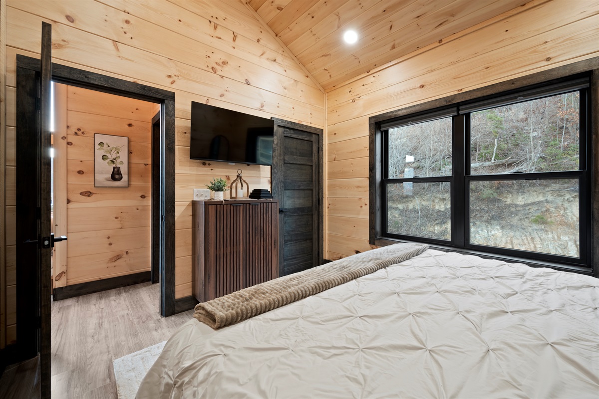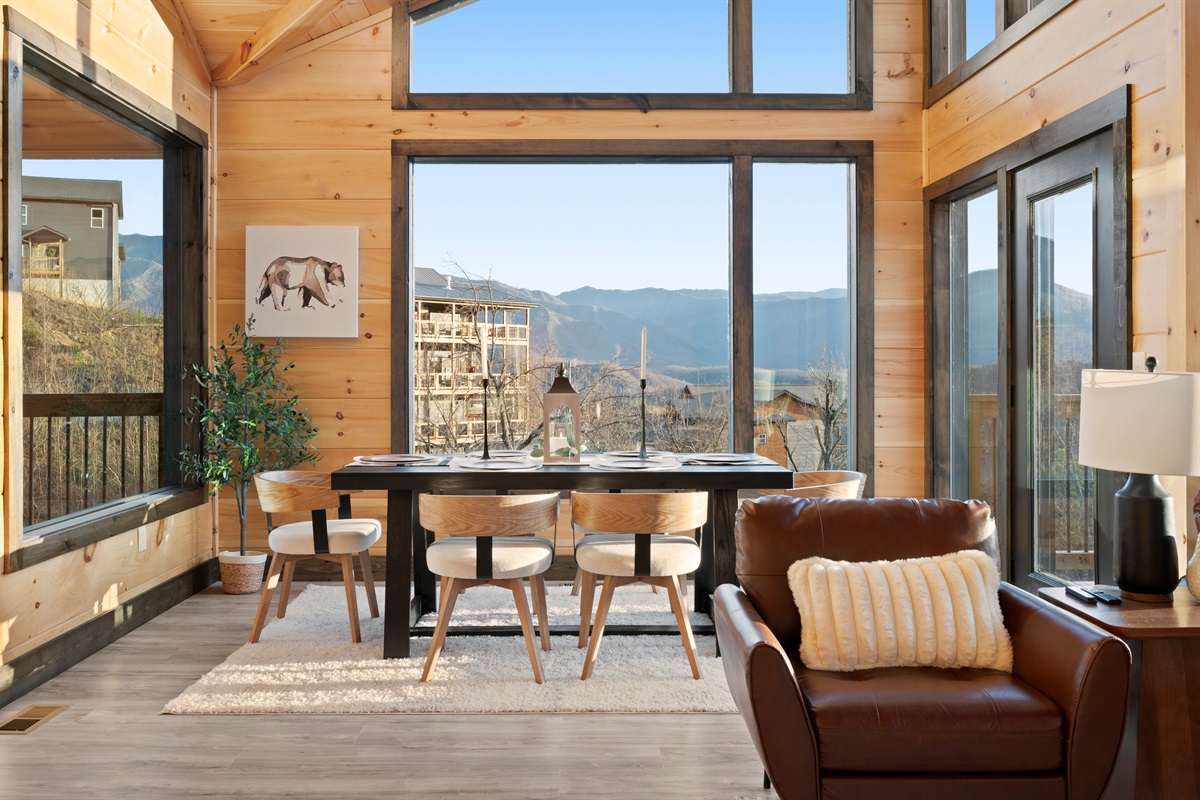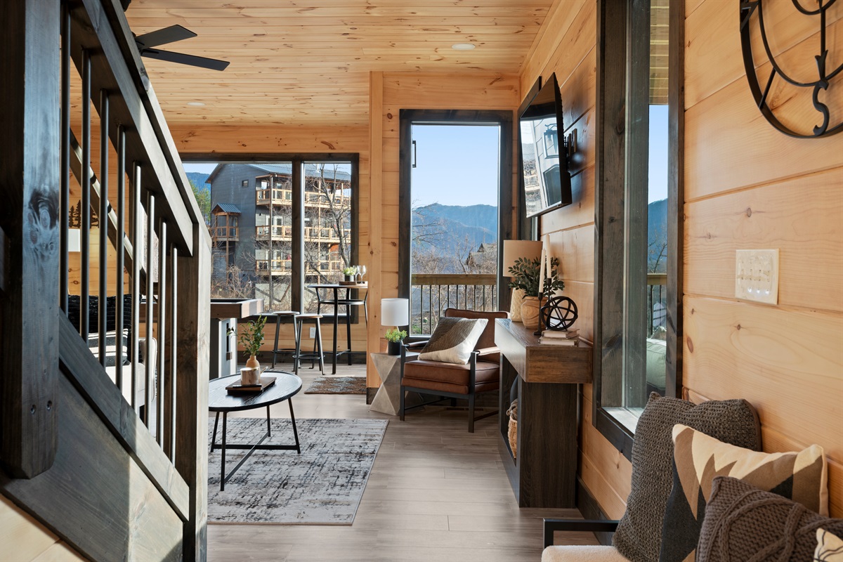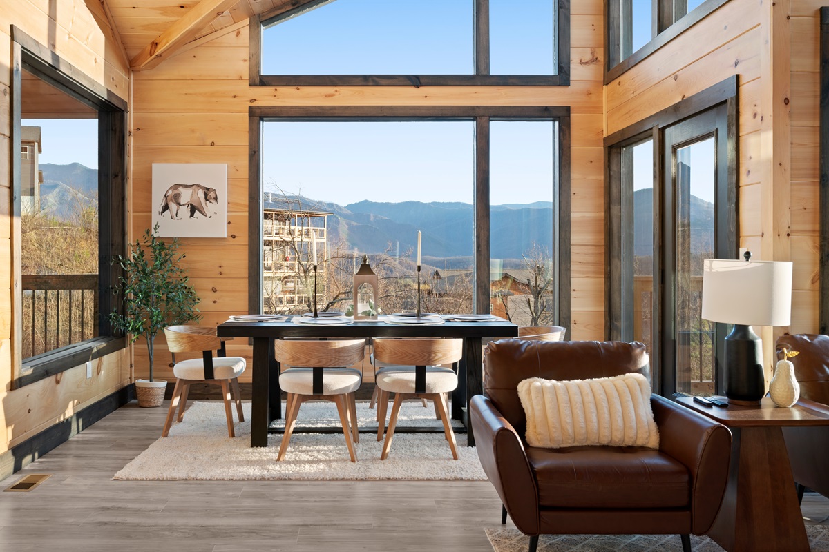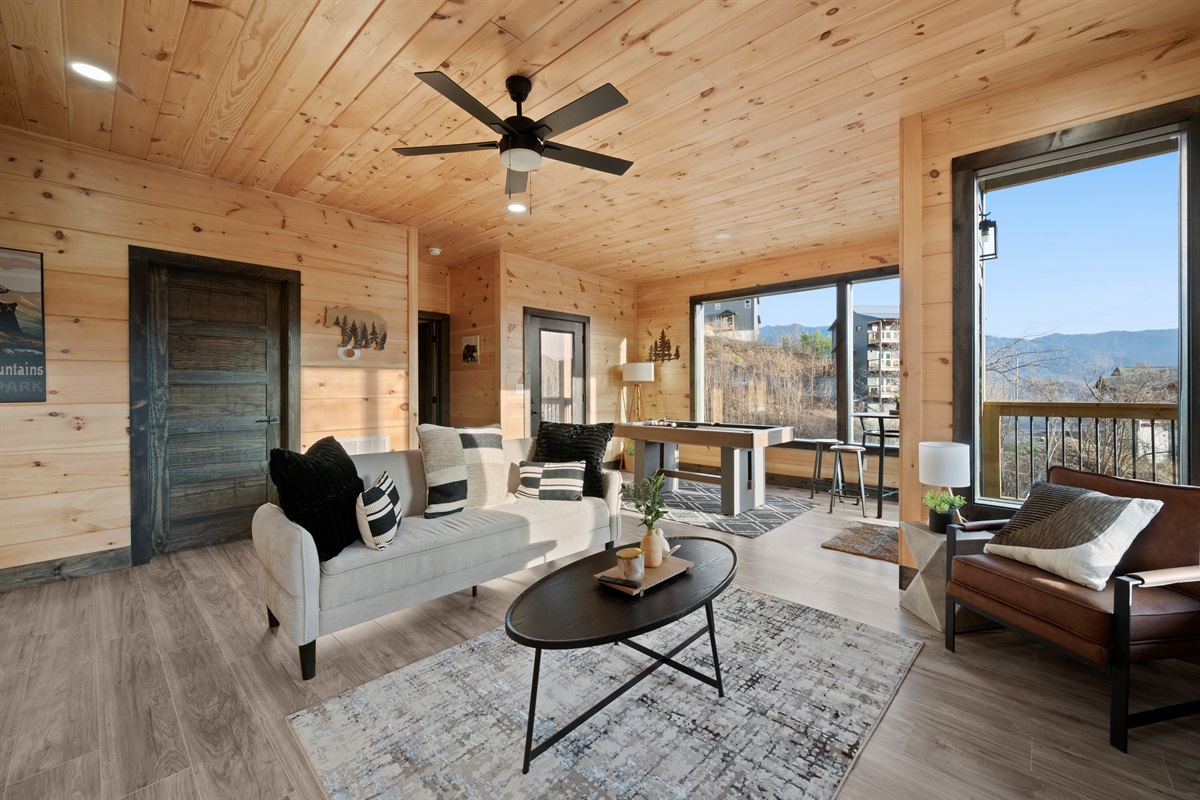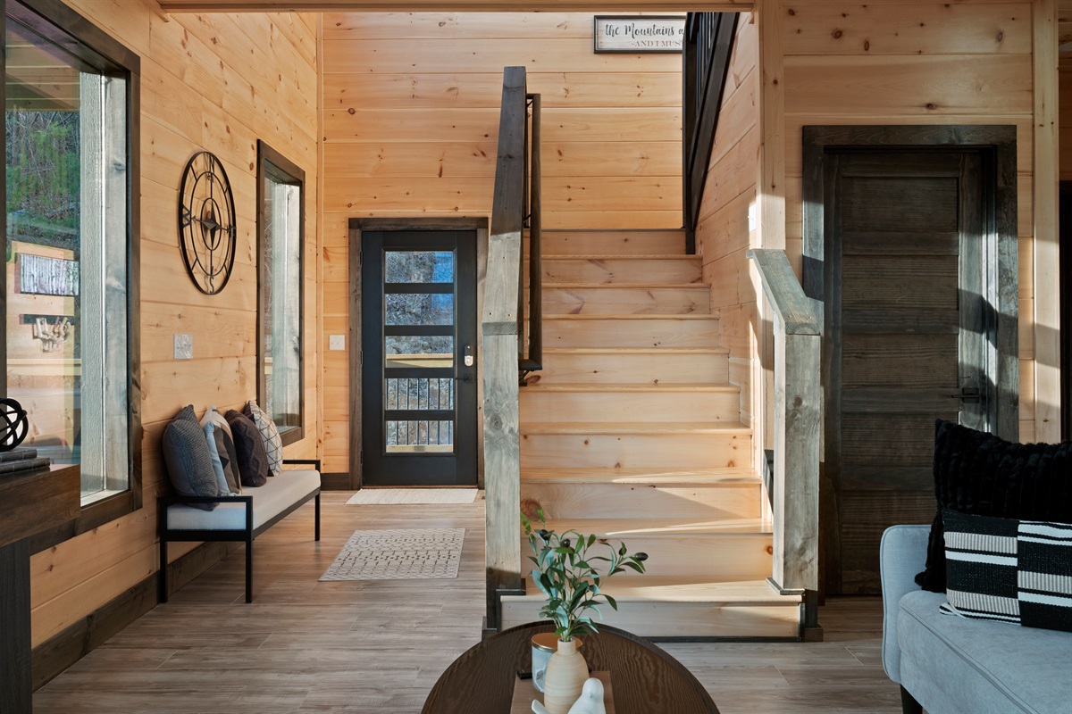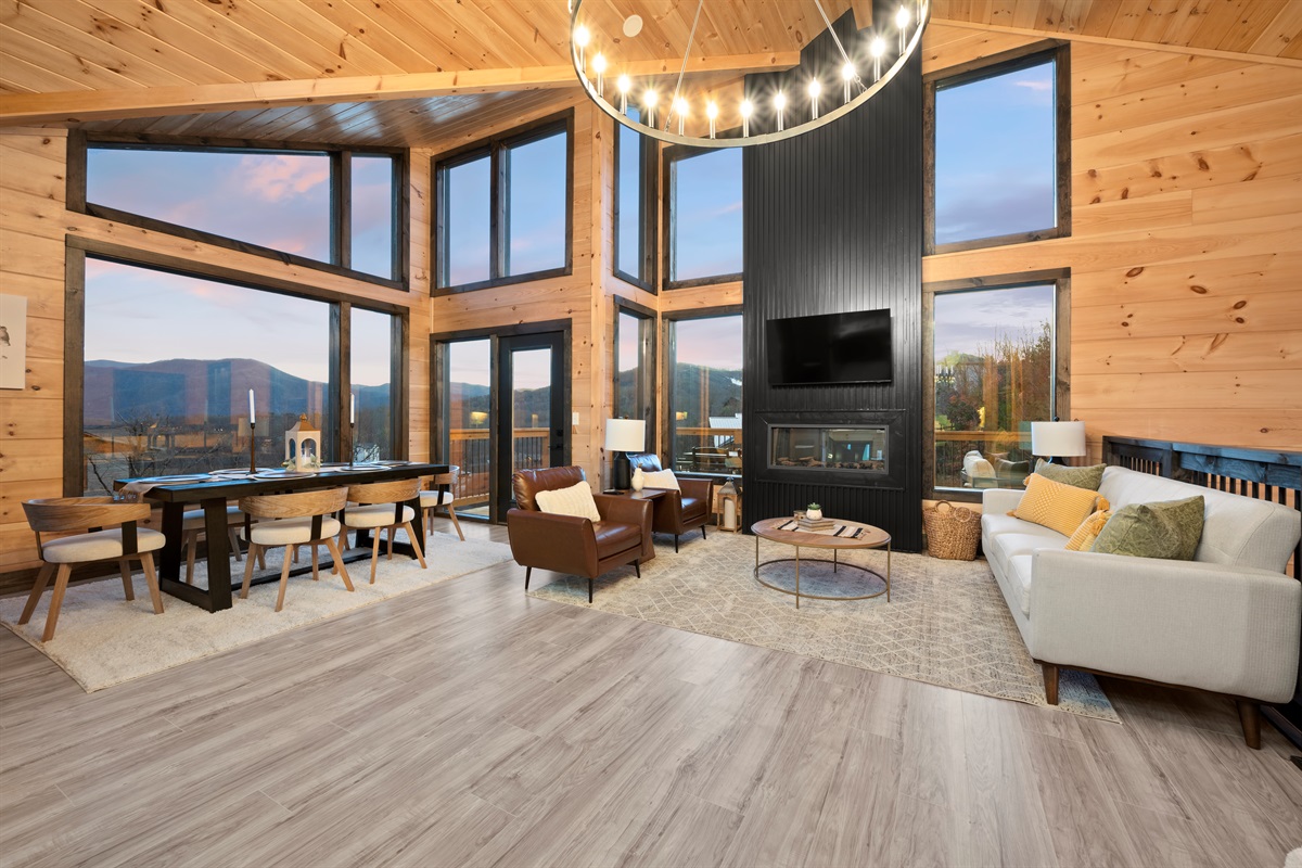 This newly built, two-level cabin was designed around the view. Massive windows flood the space with natural light, framing the Smokies from nearly every angle. Inside, clean modern finishes meet warm wood tones, creating a space that feels elevated, cozy, and effortless the moment you walk in.