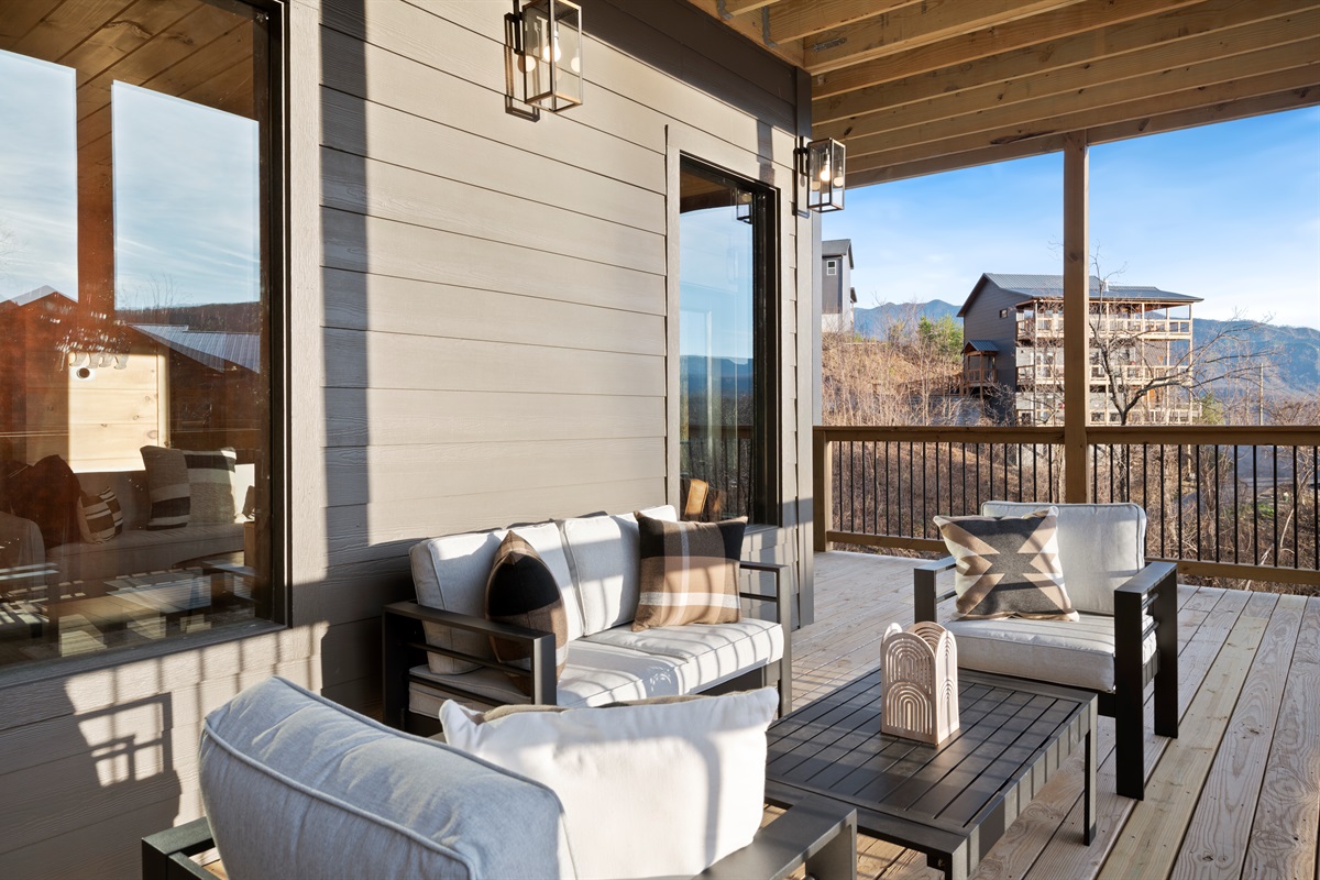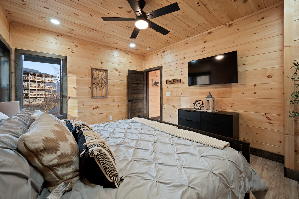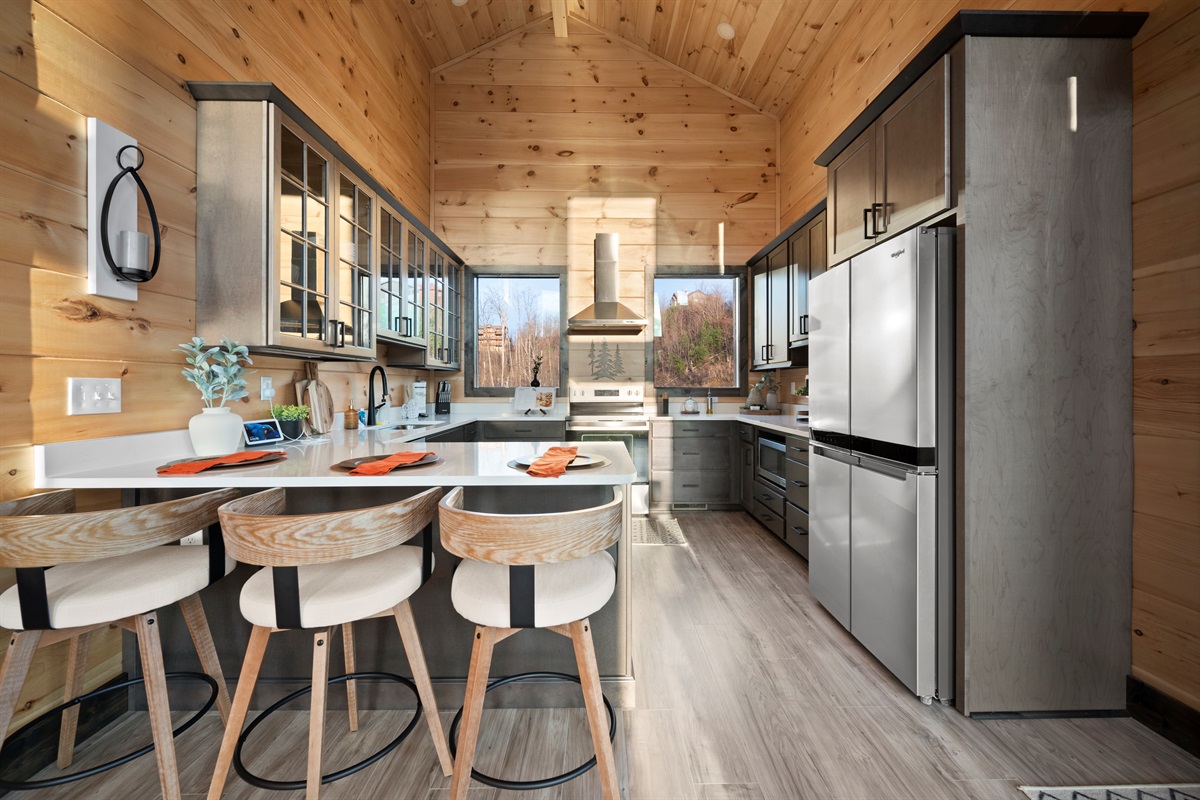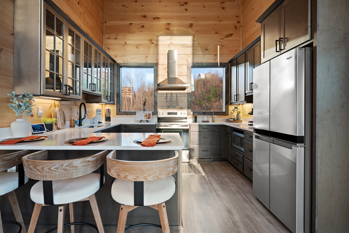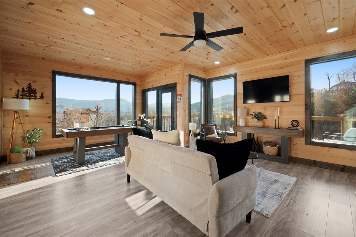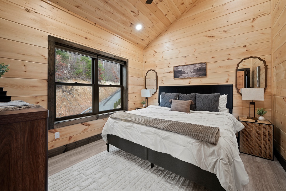 This newly built, two-level cabin was designed around the view. Massive windows flood the space with natural light, framing the Smokies from nearly every angle. Inside, clean modern finishes meet warm wood tones, creating a space that feels elevated, cozy, and effortless the moment you walk in.