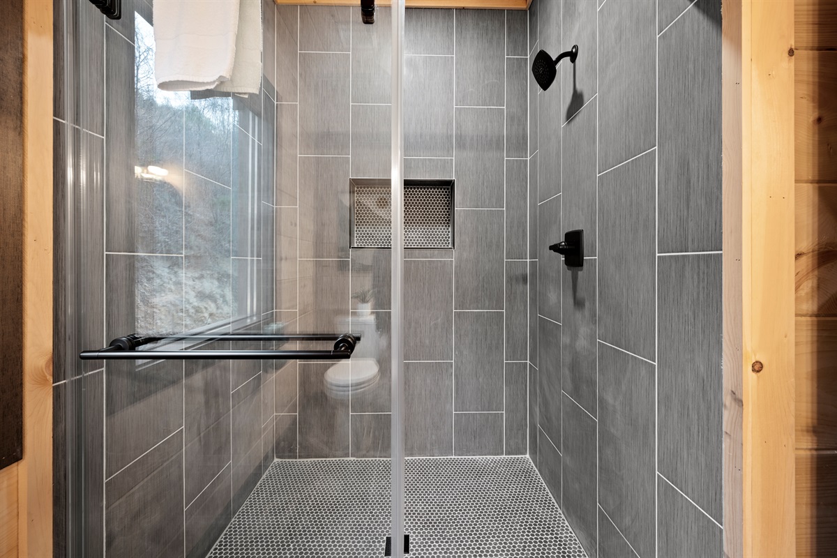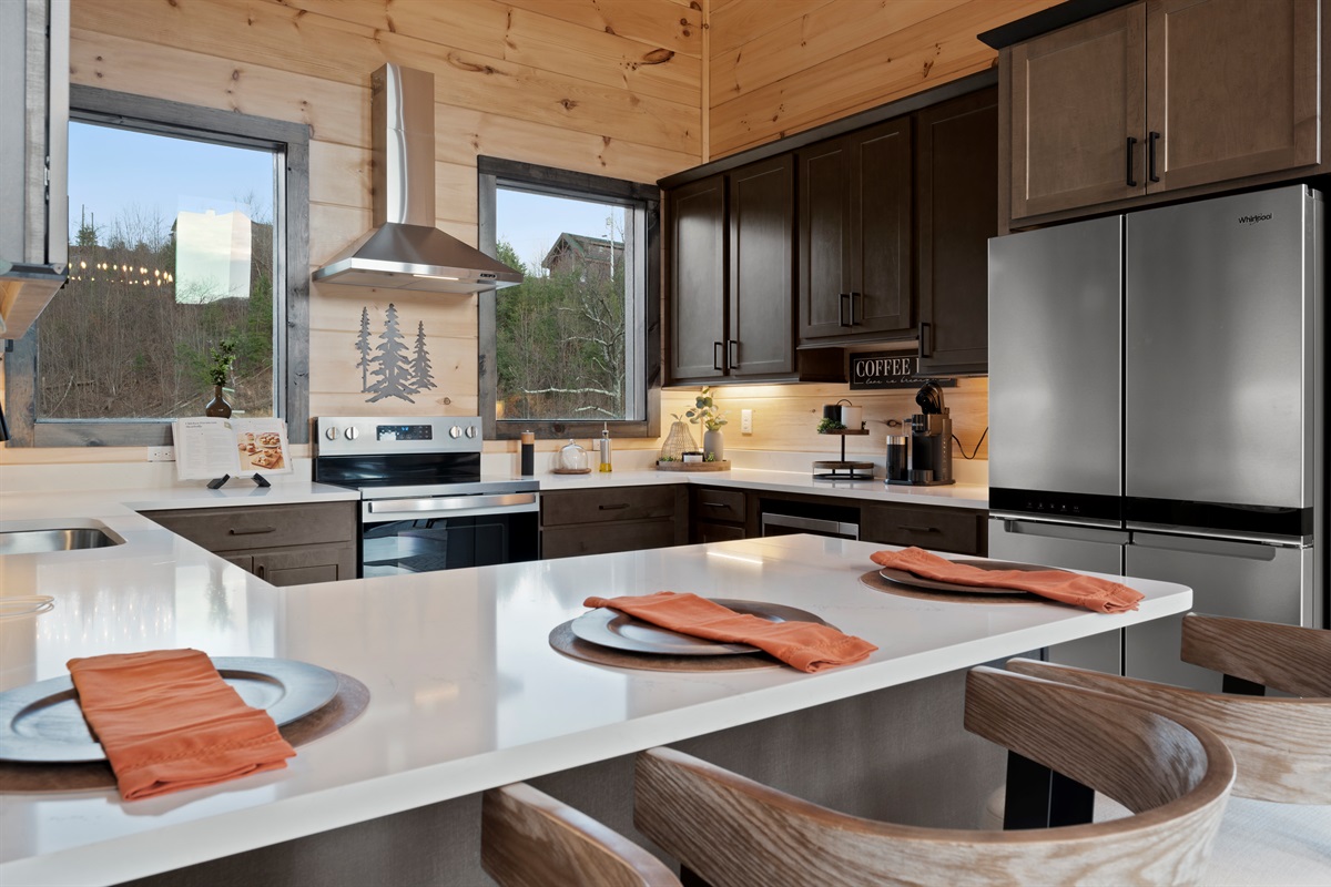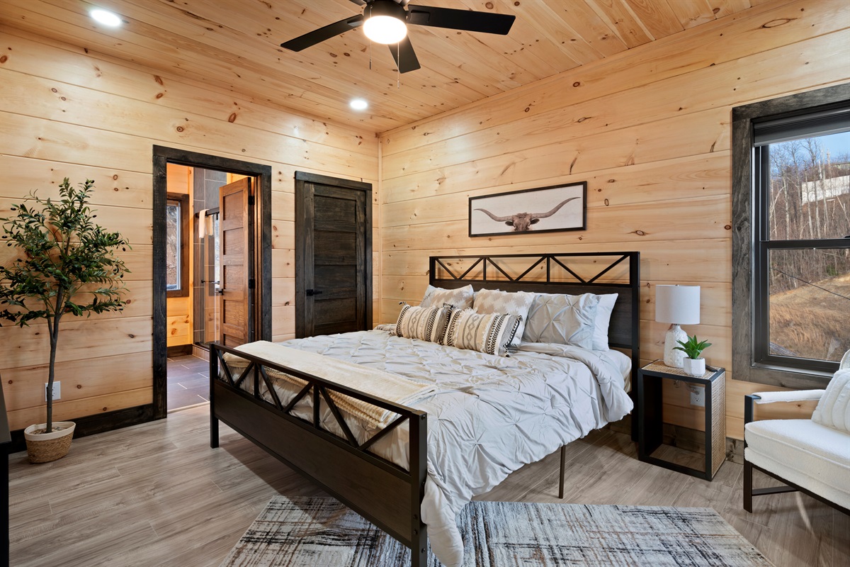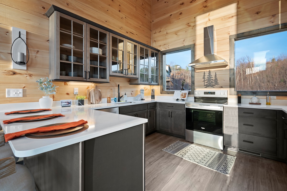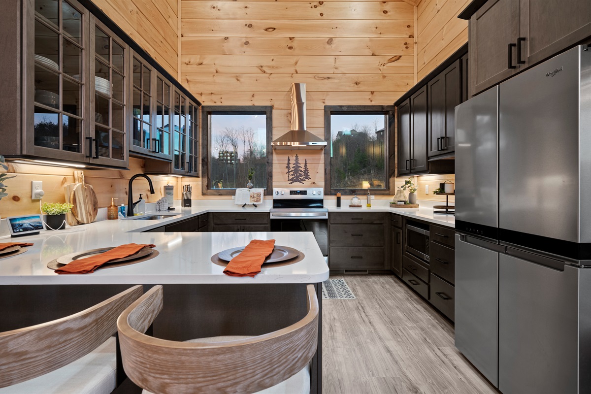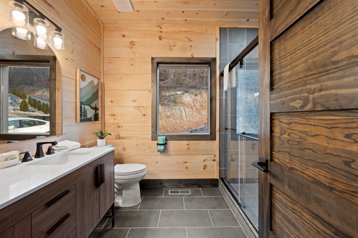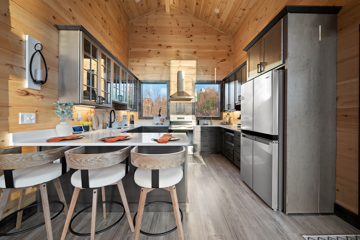 This newly built, two-level cabin was designed around the view. Massive windows flood the space with natural light, framing the Smokies from nearly every angle. Inside, clean modern finishes meet warm wood tones, creating a space that feels elevated, cozy, and effortless the moment you walk in.