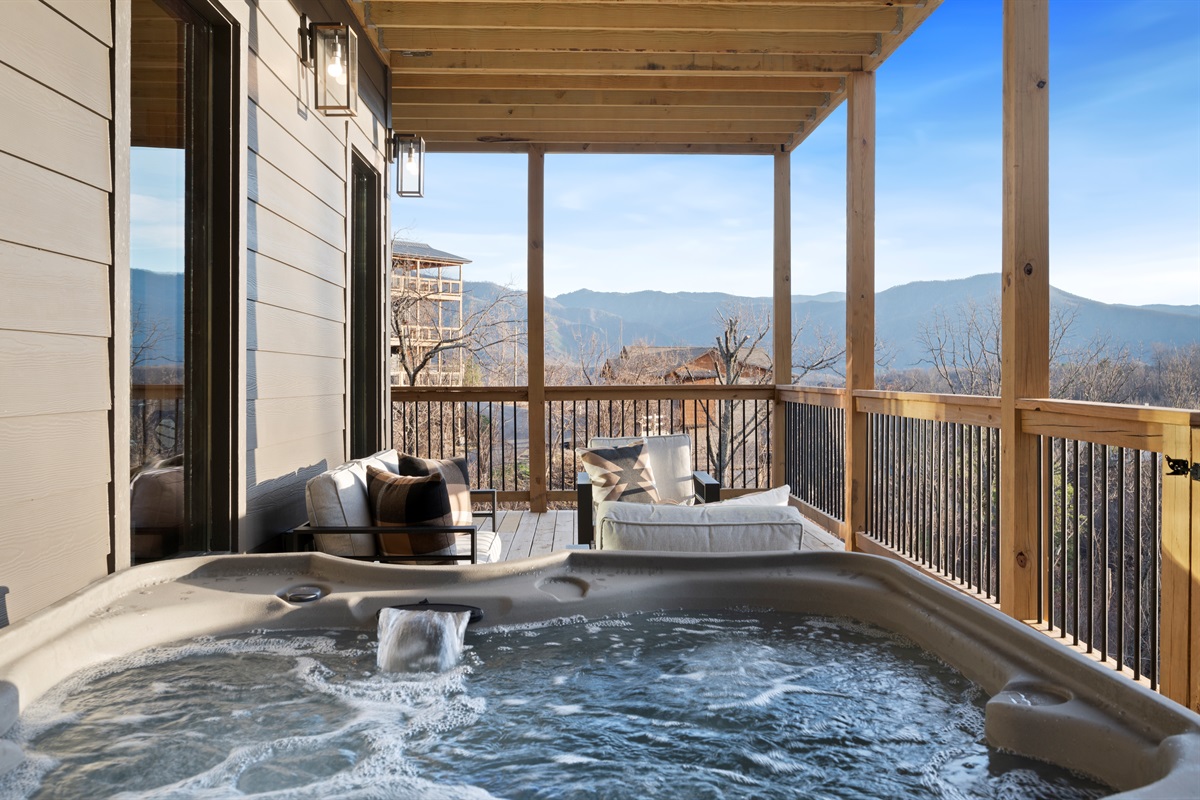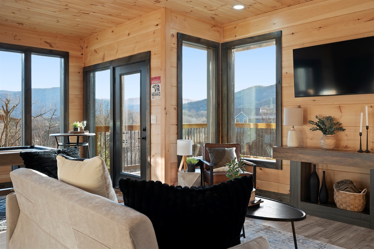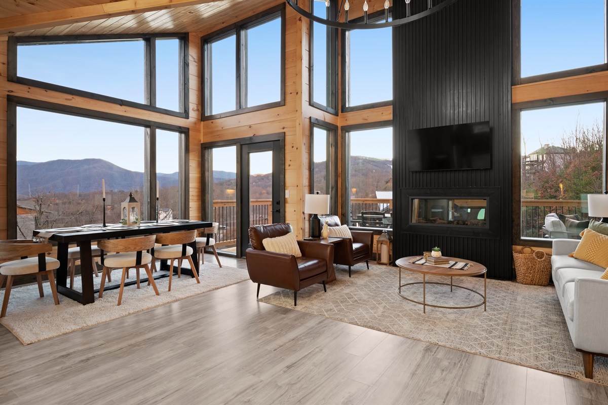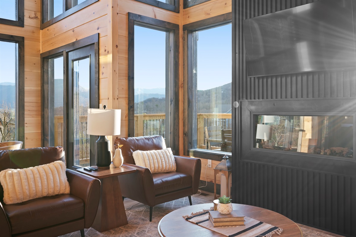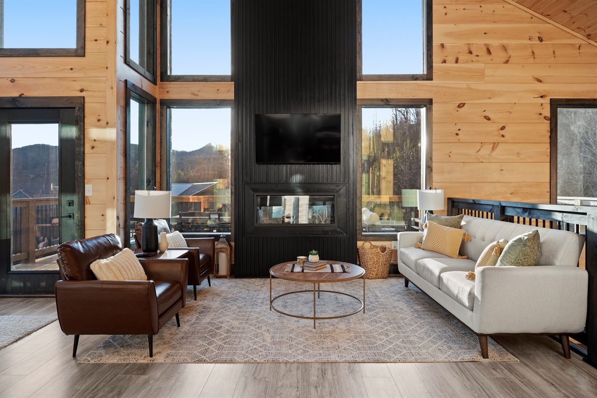 Spend your evenings gathered around the electric fireplace upstairs, then step outside to the deck where a private hot tub, fire table, and outdoor seating let you soak in the mountain air. Mornings are best with coffee in hand, watching the mountains wake up through walls of glass.