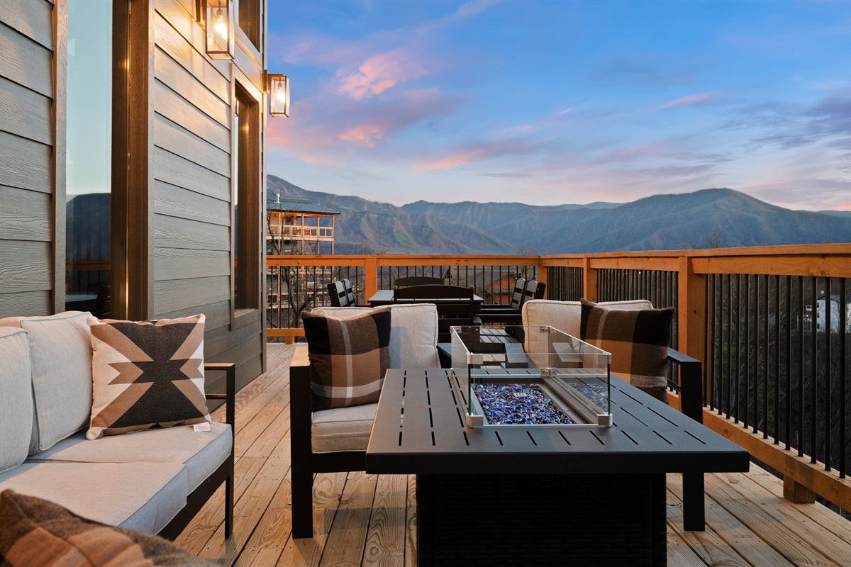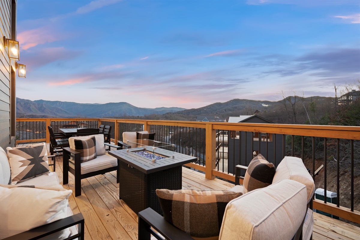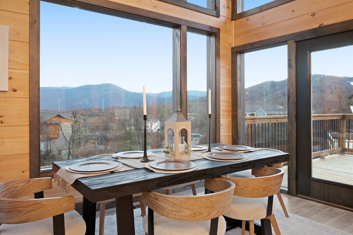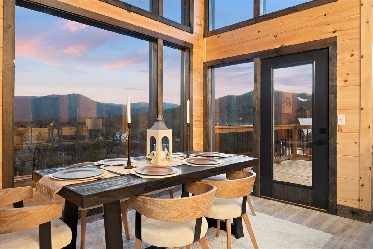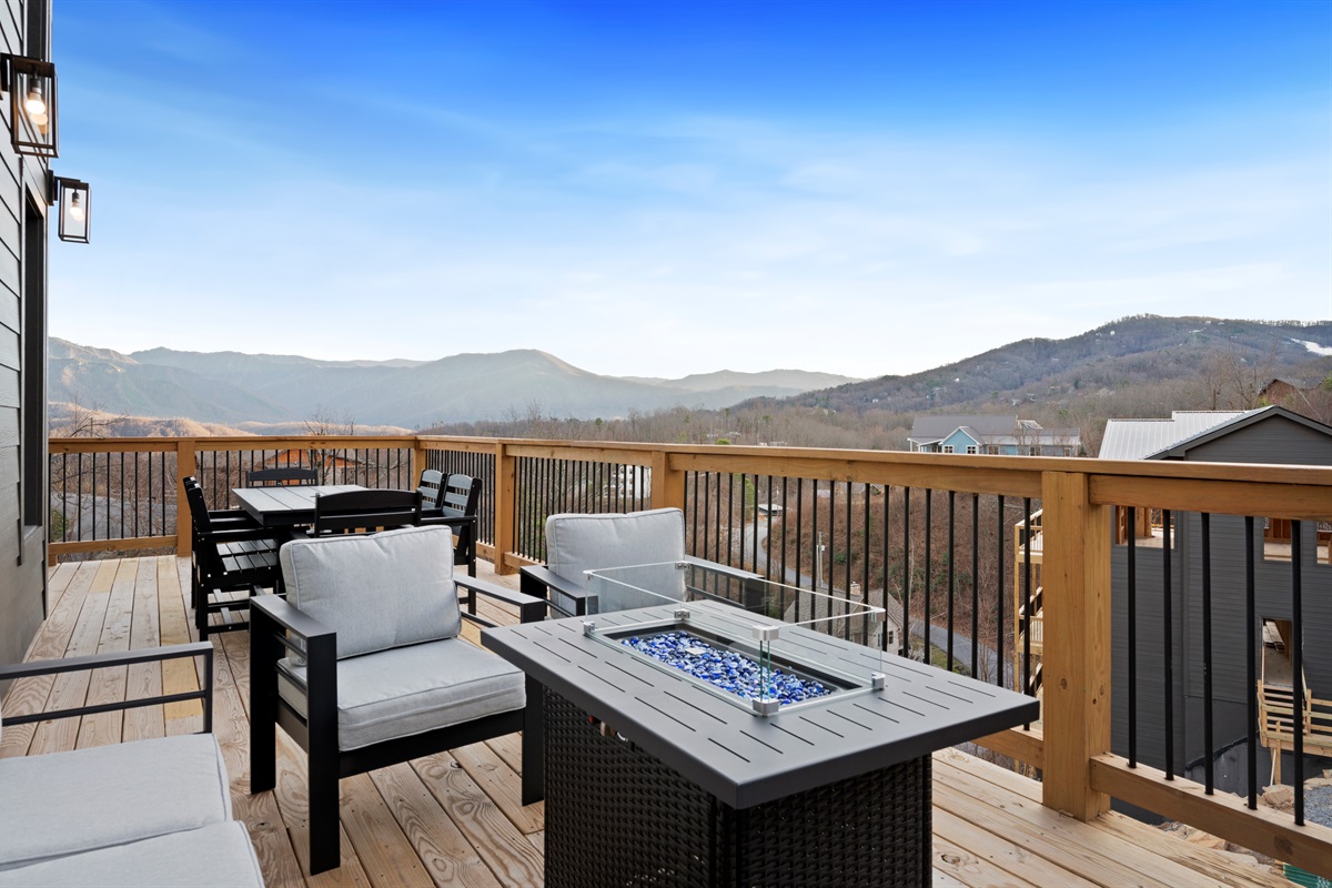 Spend your evenings gathered around the electric fireplace upstairs, then step outside to the deck where a private hot tub, fire table, and outdoor seating let you soak in the mountain air. Mornings are best with coffee in hand, watching the mountains wake up through walls of glass.