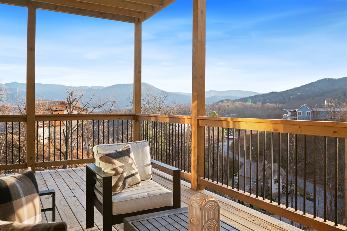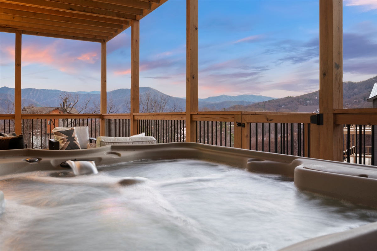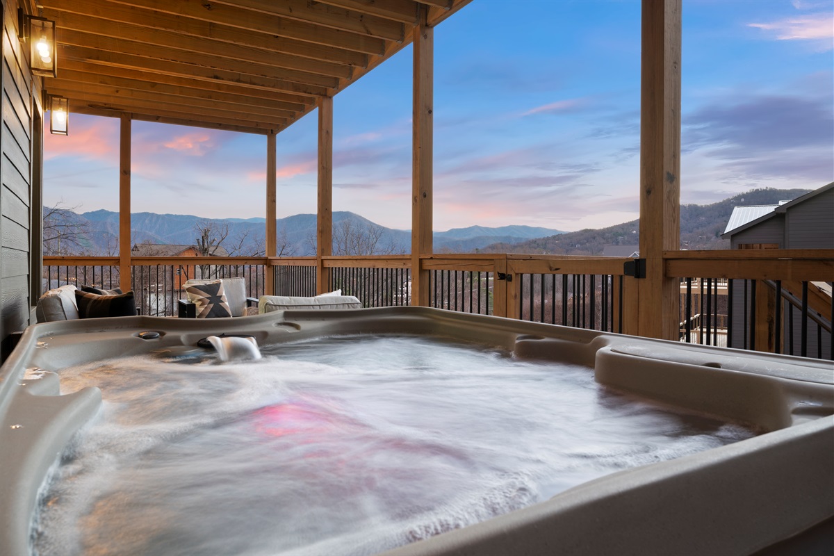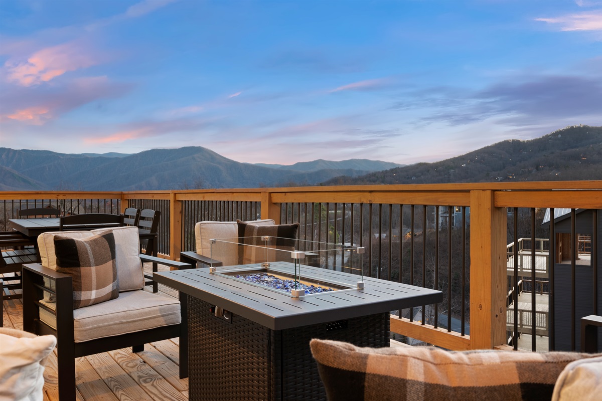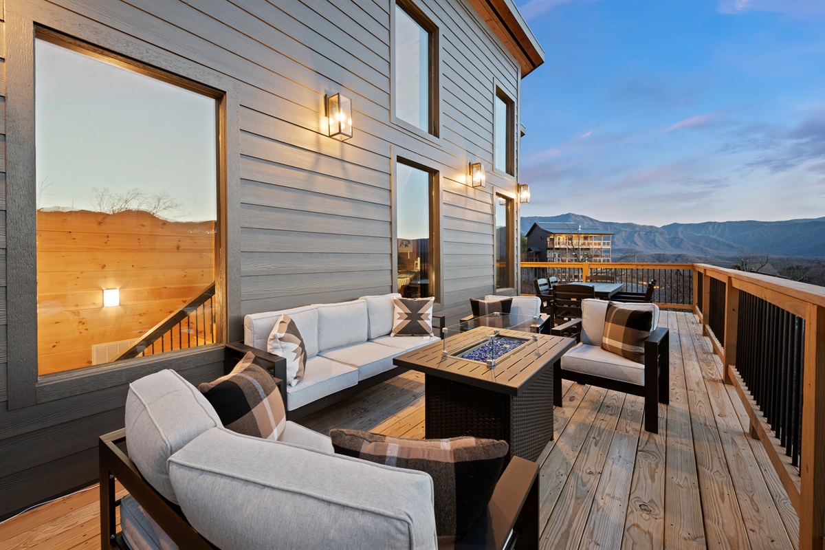 Spend your evenings gathered around the electric fireplace upstairs, then step outside to the deck where a private hot tub, fire table, and outdoor seating let you soak in the mountain air. Mornings are best with coffee in hand, watching the mountains wake up through walls of glass.