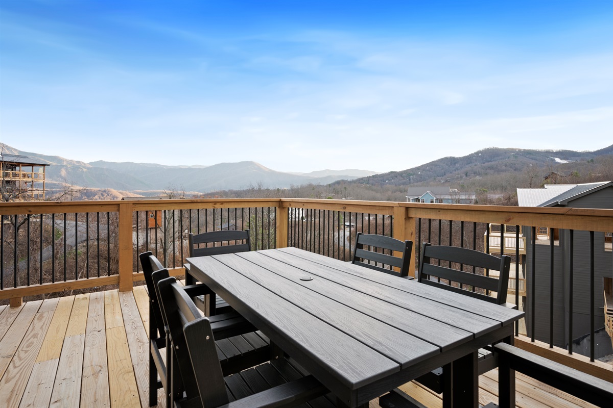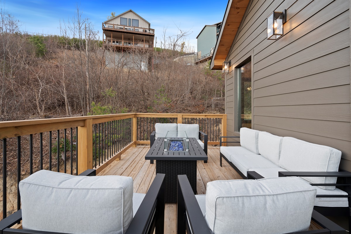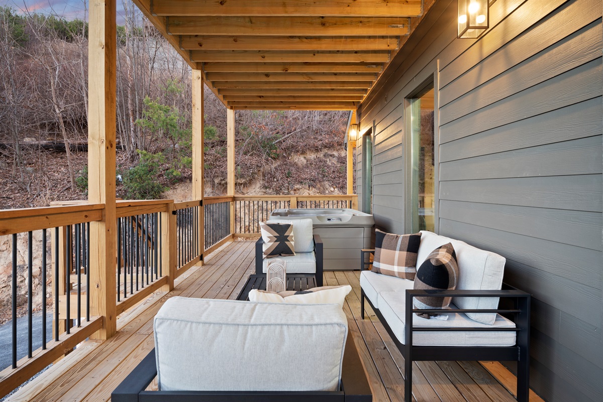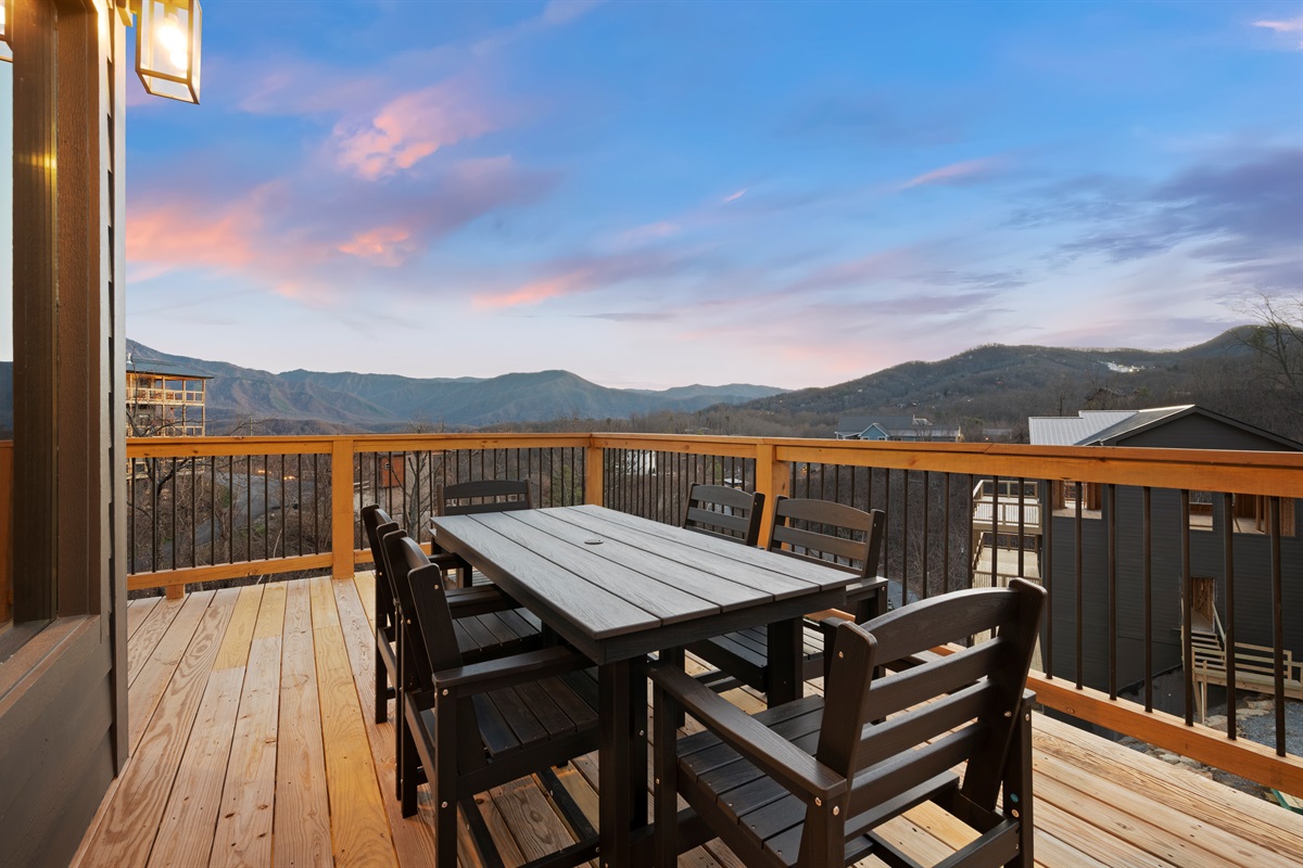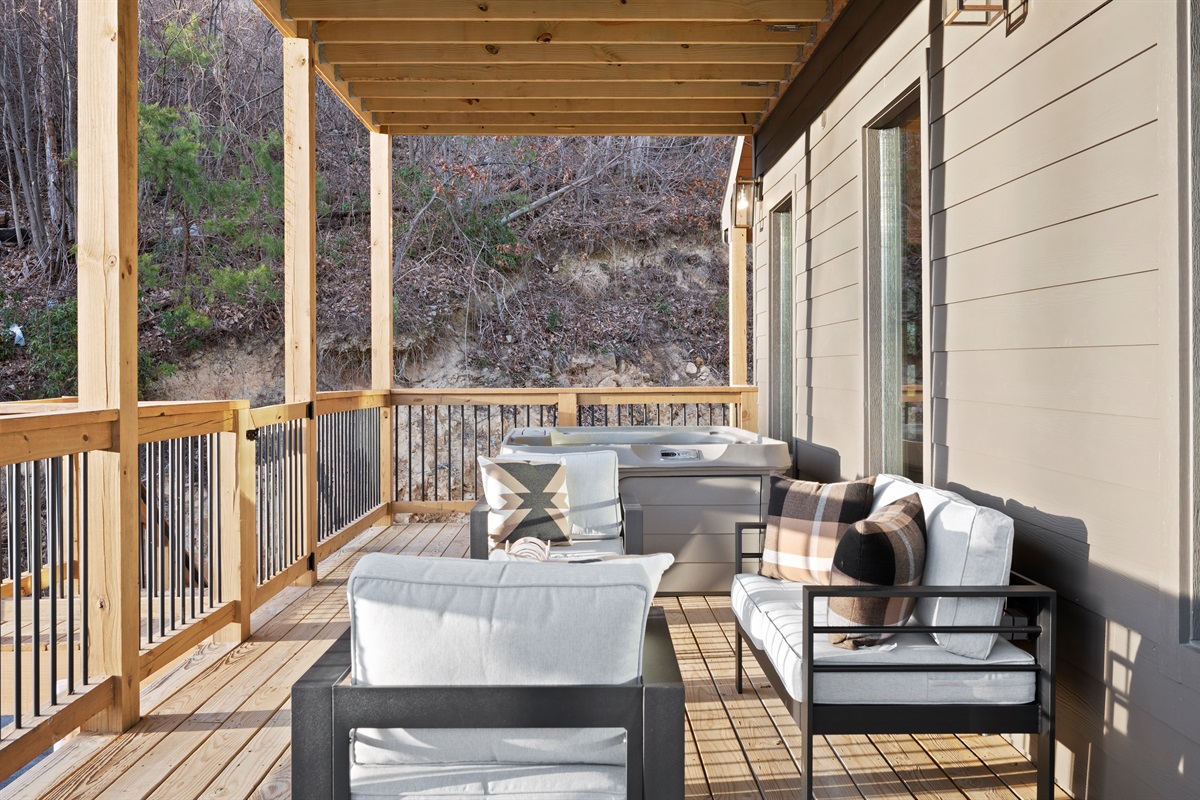 Spend your evenings gathered around the electric fireplace upstairs, then step outside to the deck where a private hot tub, fire table, and outdoor seating let you soak in the mountain air. Mornings are best with coffee in hand, watching the mountains wake up through walls of glass.