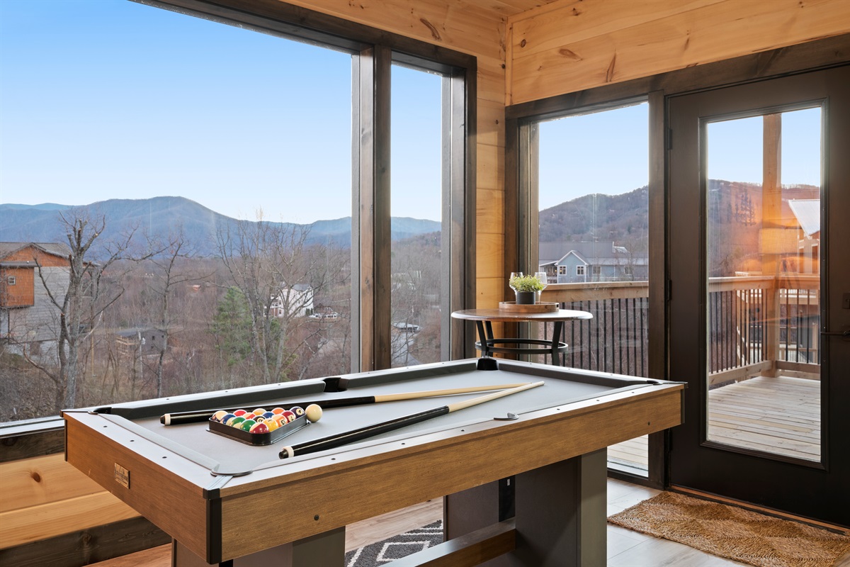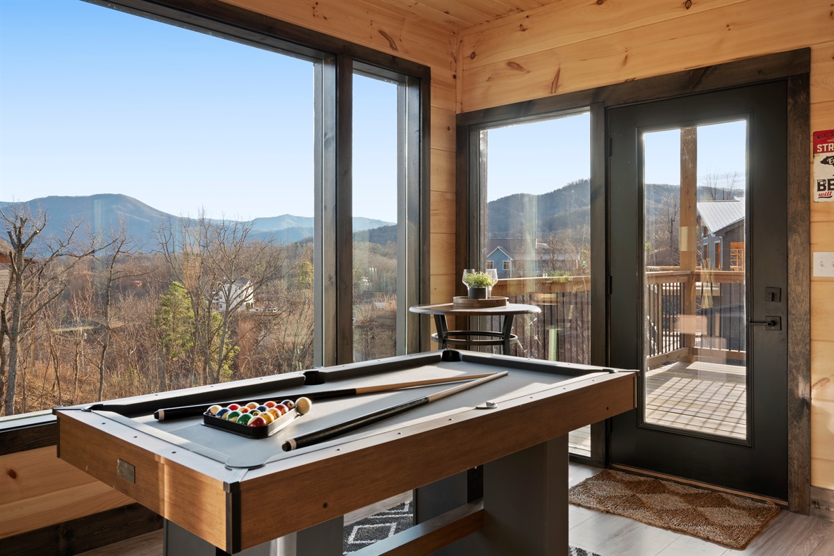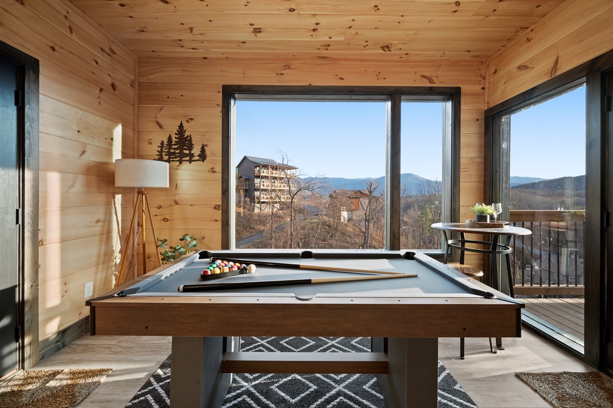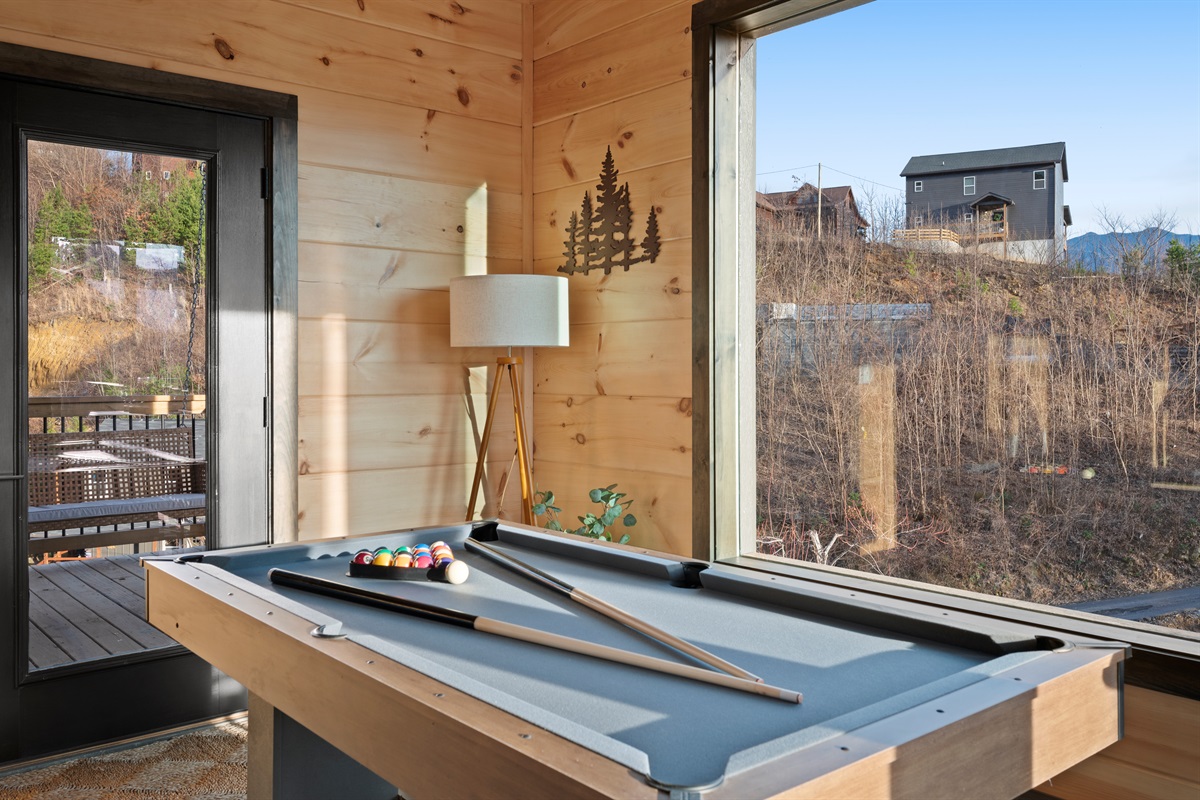 Downstairs, the game room offers a pool table and another comfortable space to unwind, with direct access to the lower level. With two king bedrooms, two full bathrooms plus a half bath, and thoughtful separation across levels, the cabin is perfectly sized for couples, friends, or a small family.