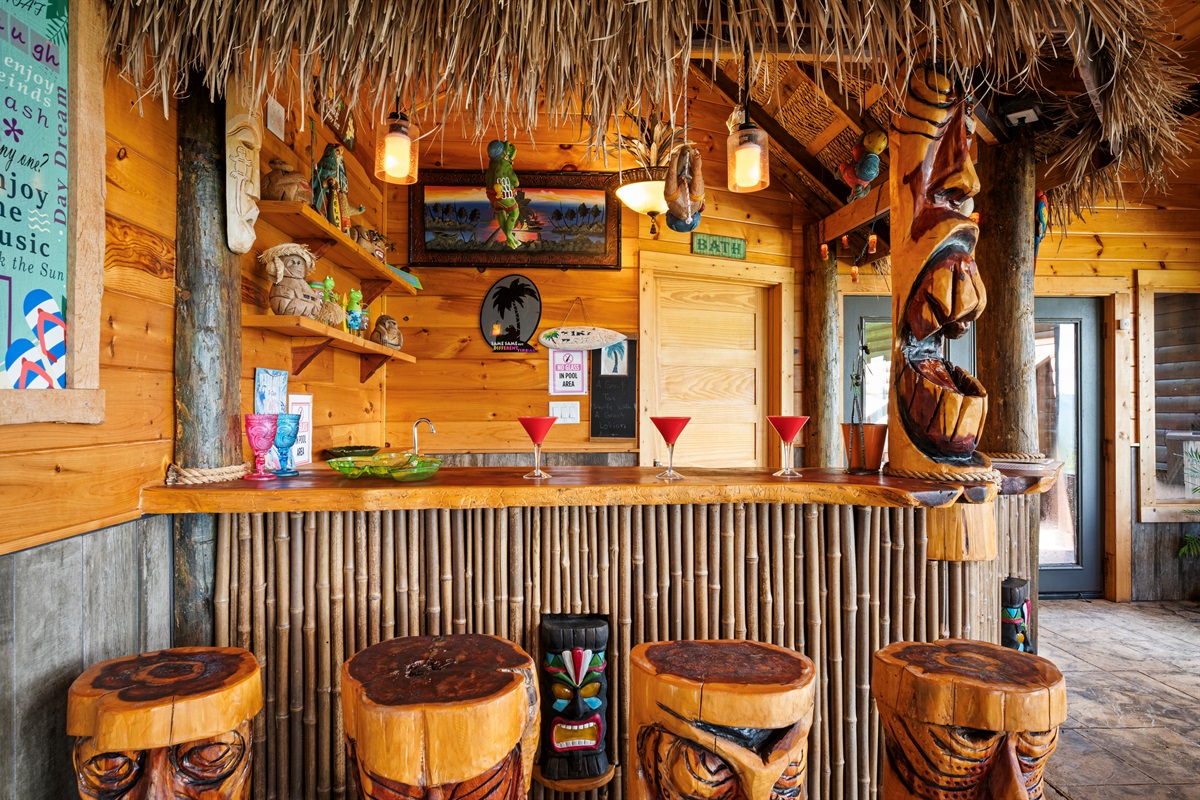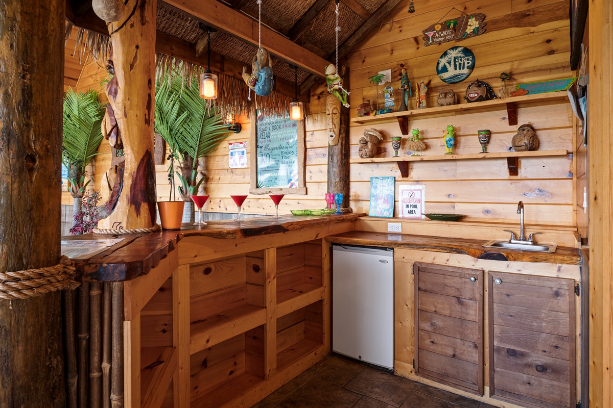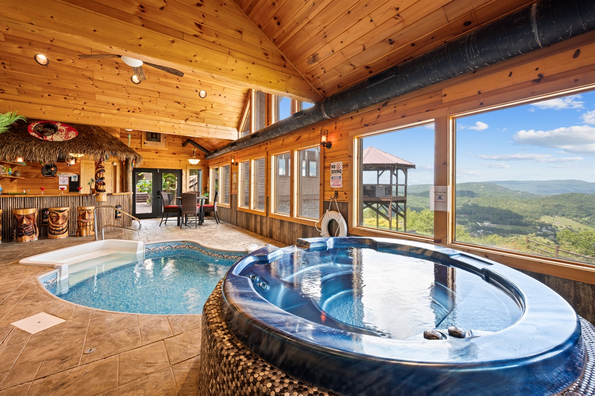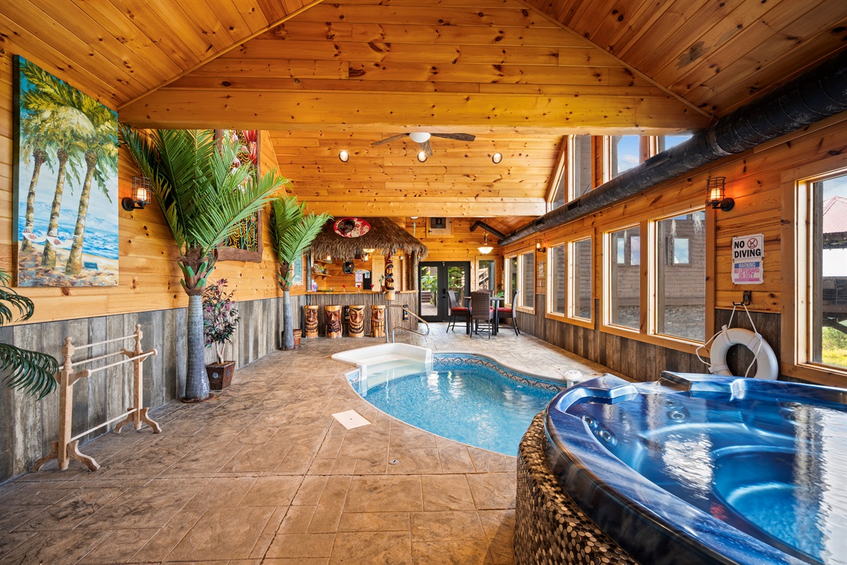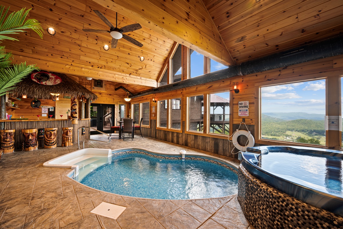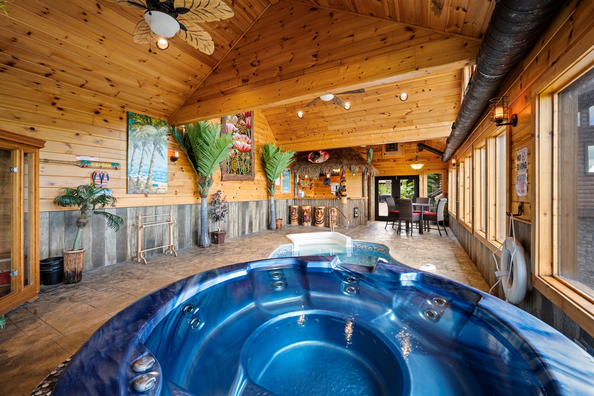 The back door from the main level takes you to a large sun deck and indoor pool. This tropically appointed pool house is uniquely situated to overlook Wears Valley and offers incredible views from its wall of windows. Inside is climate controlled with a heated indoor swimming pool, floor deck jets, and spillover 6 person spa. There is also a 4person sauna with the MP3 player inside. Also, a changing room / full bathroom, and a tiki bar, proudly called the “Same, Same, but Different Tiki Bar”. The "Same, Same, but Different Tiki Bar" is a traditional island-style, bamboo-clad, and thatched Tiki shack where shoes and shirts are definitely not required. The difference is that this Tiki Bar is located on a mountain ridge, immediately adjacent to the Great Smoky Mountains National Park! The Tiki Bar is ornated with hand-carved Tiki poles and bar stools, surfboards, friendly animals, and other tropical decors.