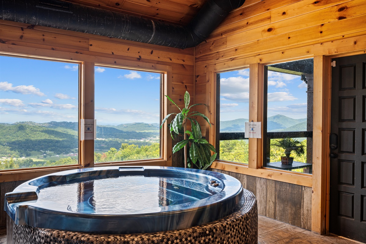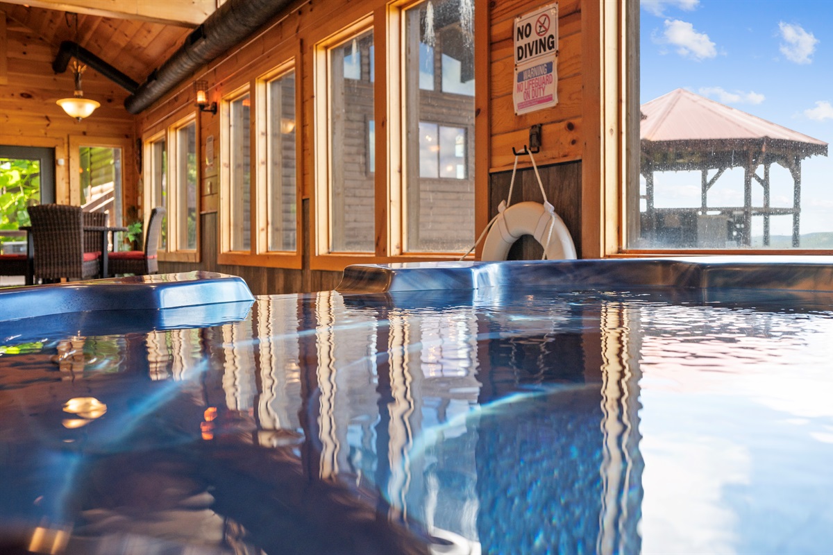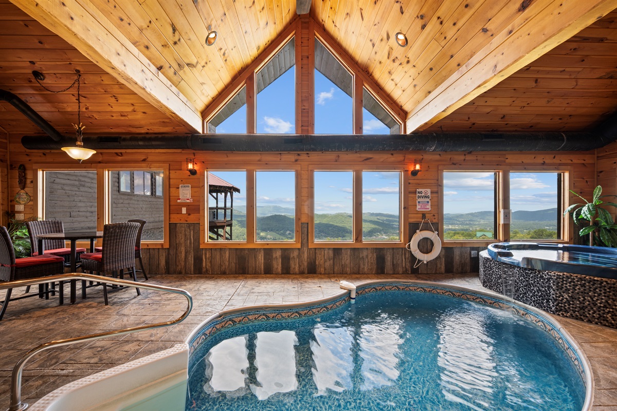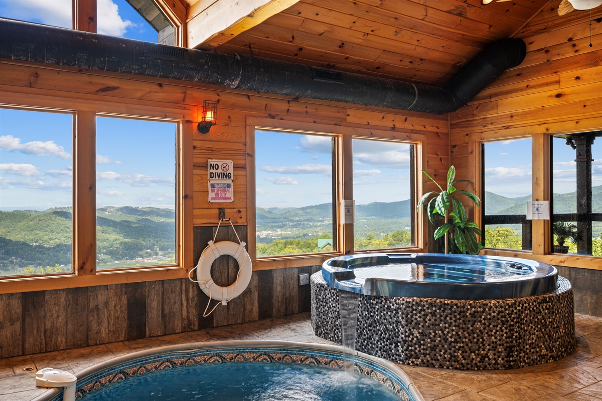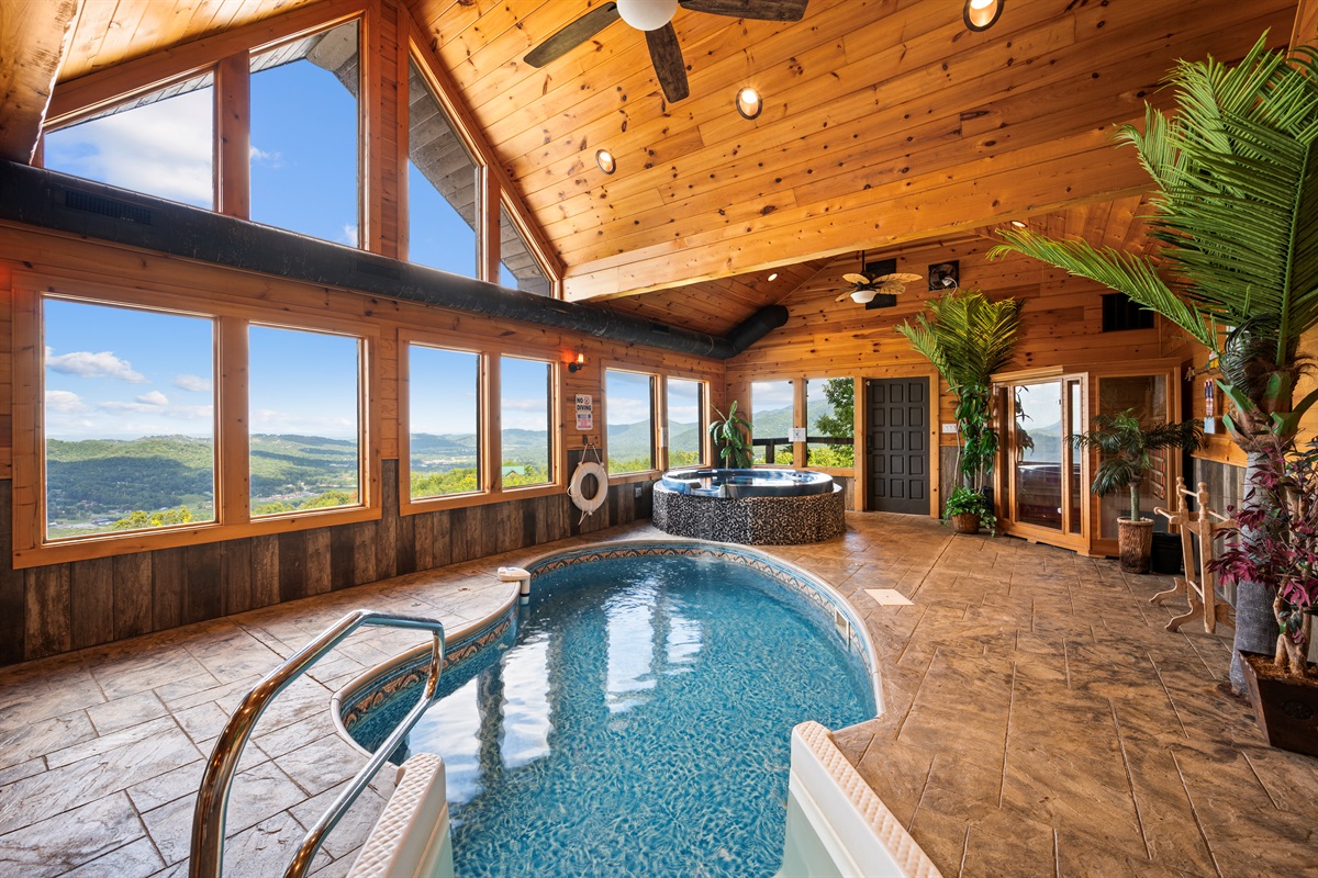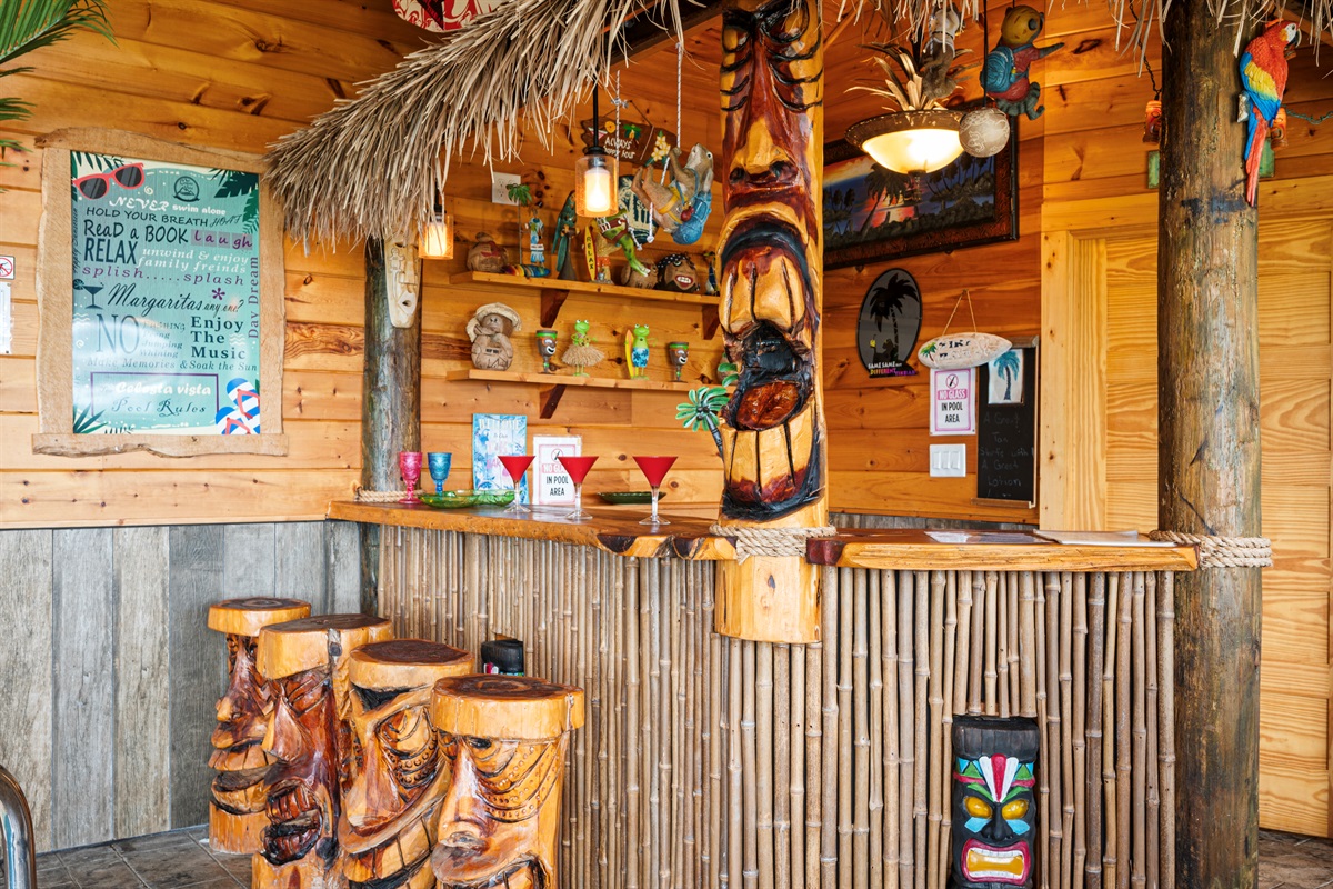 The back door from the main level takes you to a large sun deck and indoor pool. This tropically appointed pool house is uniquely situated to overlook Wears Valley and offers incredible views from its wall of windows. Inside is climate controlled with a heated indoor swimming pool, floor deck jets, and spillover 6 person spa. There is also a 4person sauna with the MP3 player inside. Also, a changing room / full bathroom, and a tiki bar, proudly called the “Same, Same, but Different Tiki Bar”. The "Same, Same, but Different Tiki Bar" is a traditional island-style, bamboo-clad, and thatched Tiki shack where shoes and shirts are definitely not required. The difference is that this Tiki Bar is located on a mountain ridge, immediately adjacent to the Great Smoky Mountains National Park! The Tiki Bar is ornated with hand-carved Tiki poles and bar stools, surfboards, friendly animals, and other tropical decors.