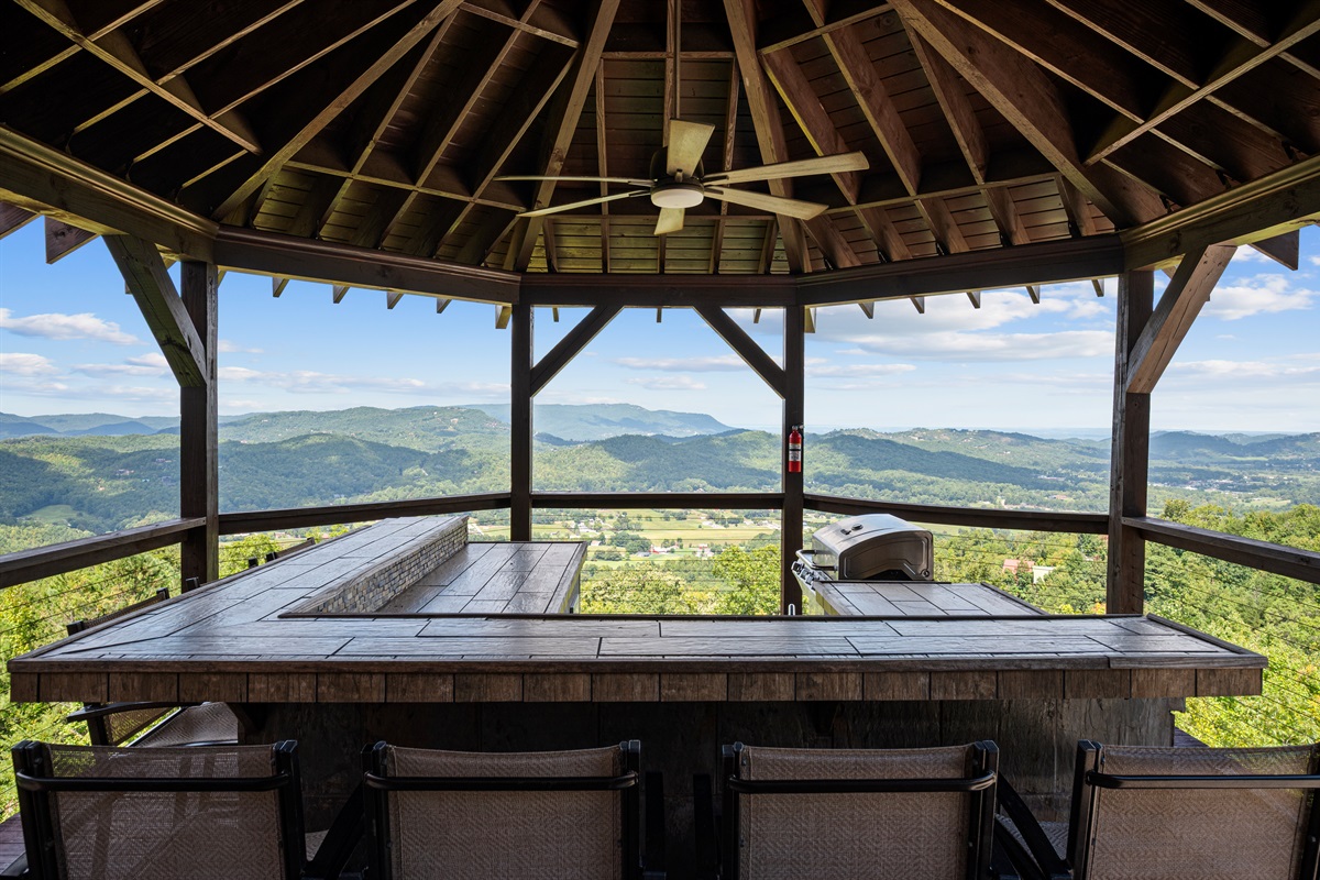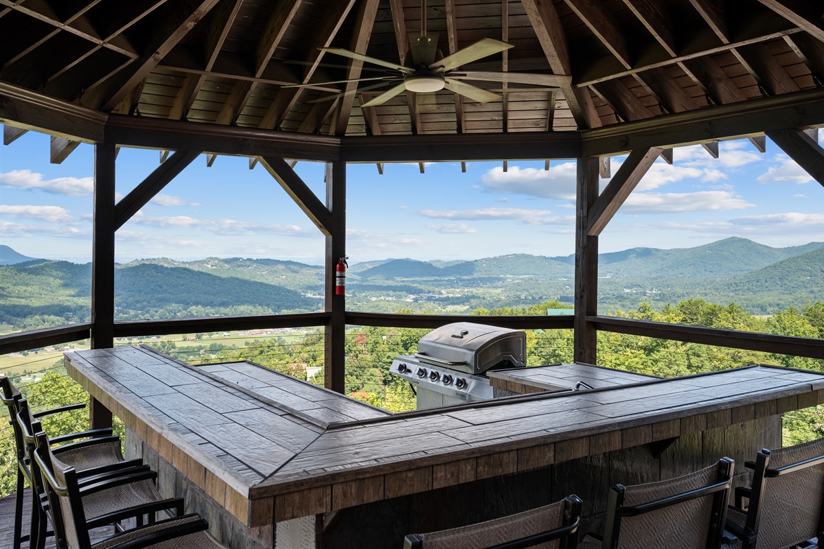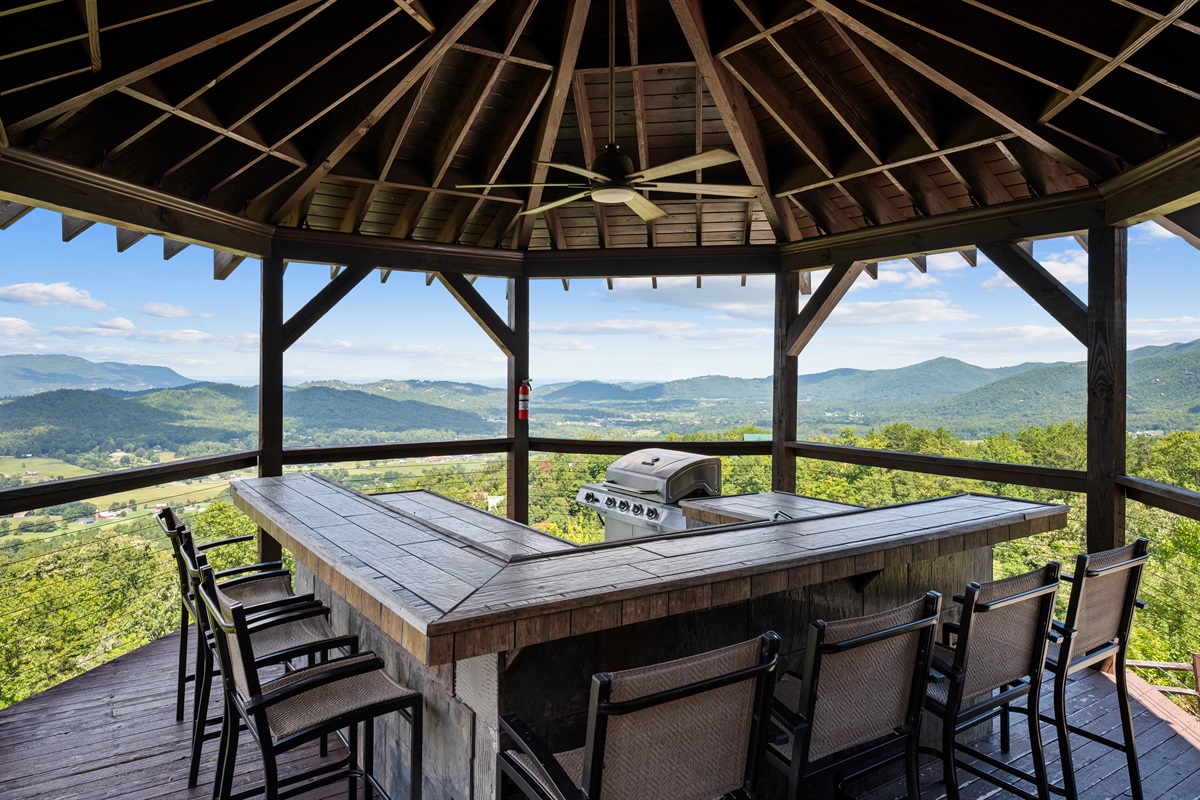 OUTDOOR AREA -The front of Celesta Vista Lodge features a large two-story gazebo who's entrance is connected to the main level deck adjacent to the dining room. The upper level of the gazebo has a fully fitted outdoor kitchen featuring a gas grill, sink and refrigerator. The kitchen has an elevated bar area that will comfortably seat 8 or more. With the valley and mountains stretched below the area, it promises to be the ultimate grilling experience and visiting area in the Smokies!
