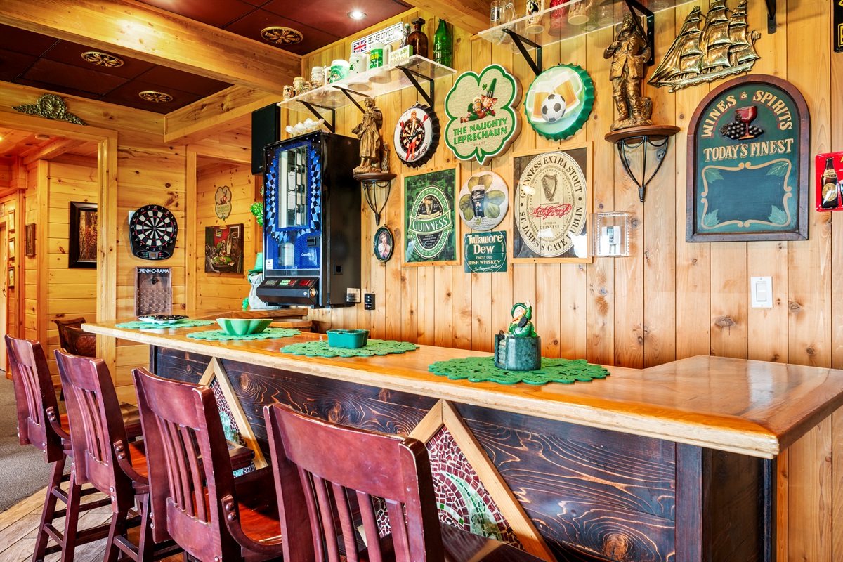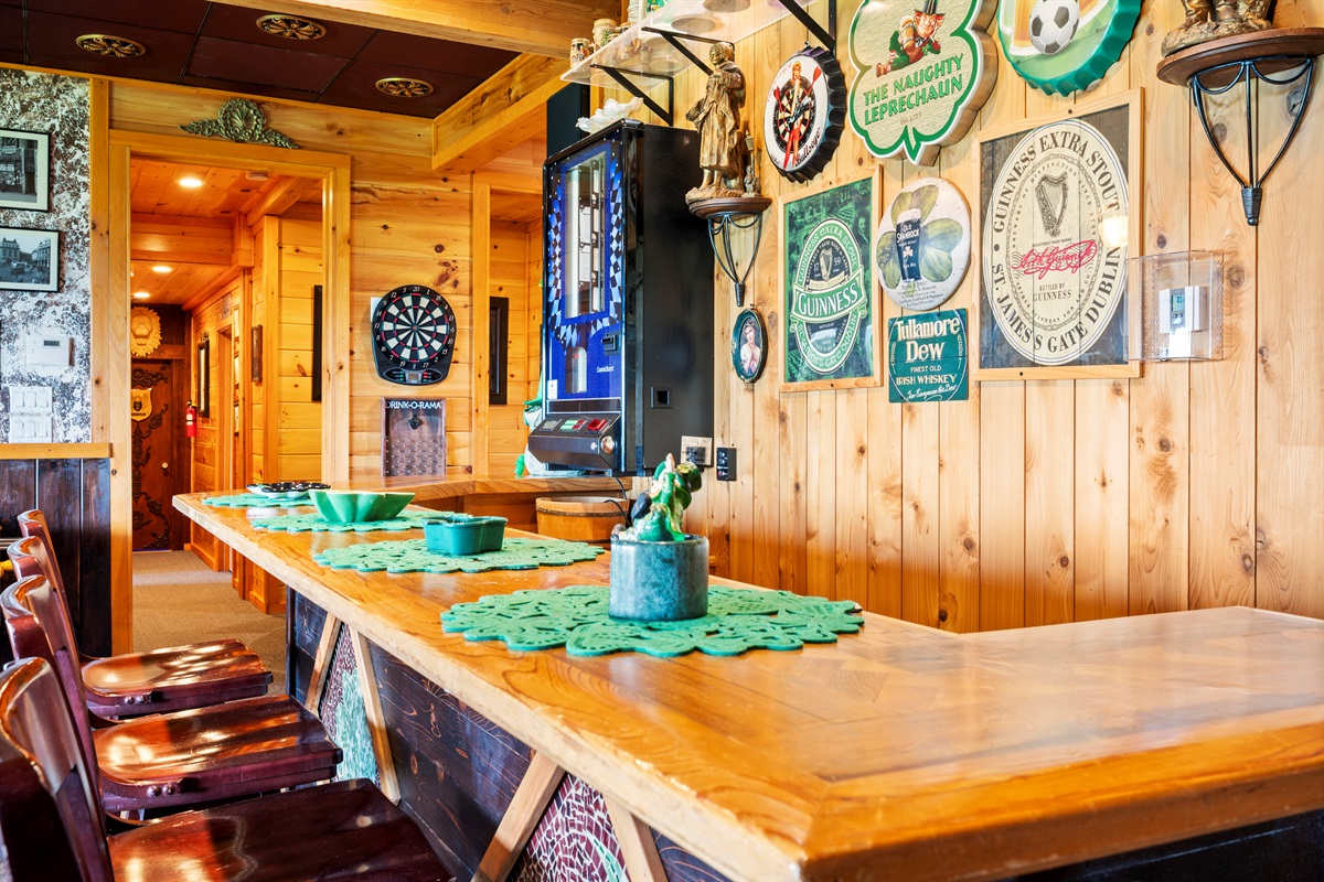 The pub's bar area includes a refrigerator, dishwasher, blender, and all required glassware to host your own St. Patricks Day Party. There is also a jukebox, loaded with all your favorite tunes as well as a wide selection of traditional Irish melodies to sing to!