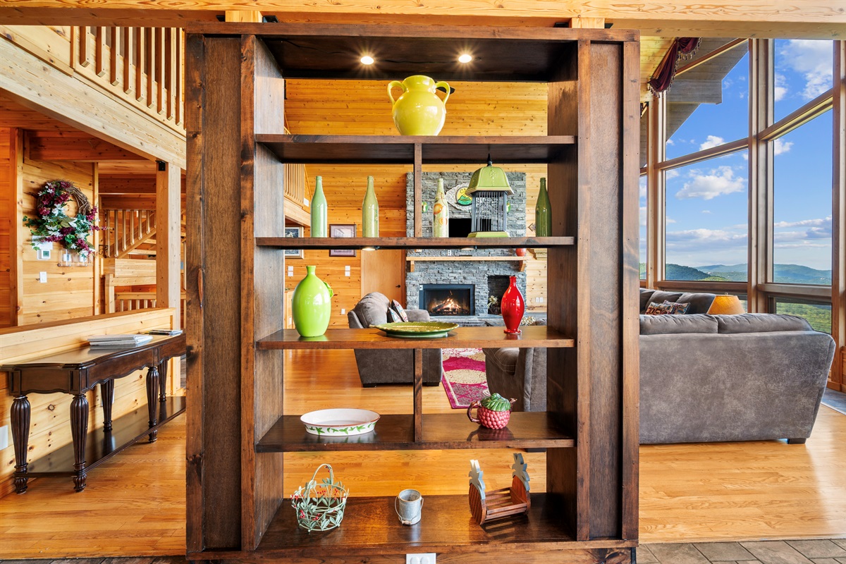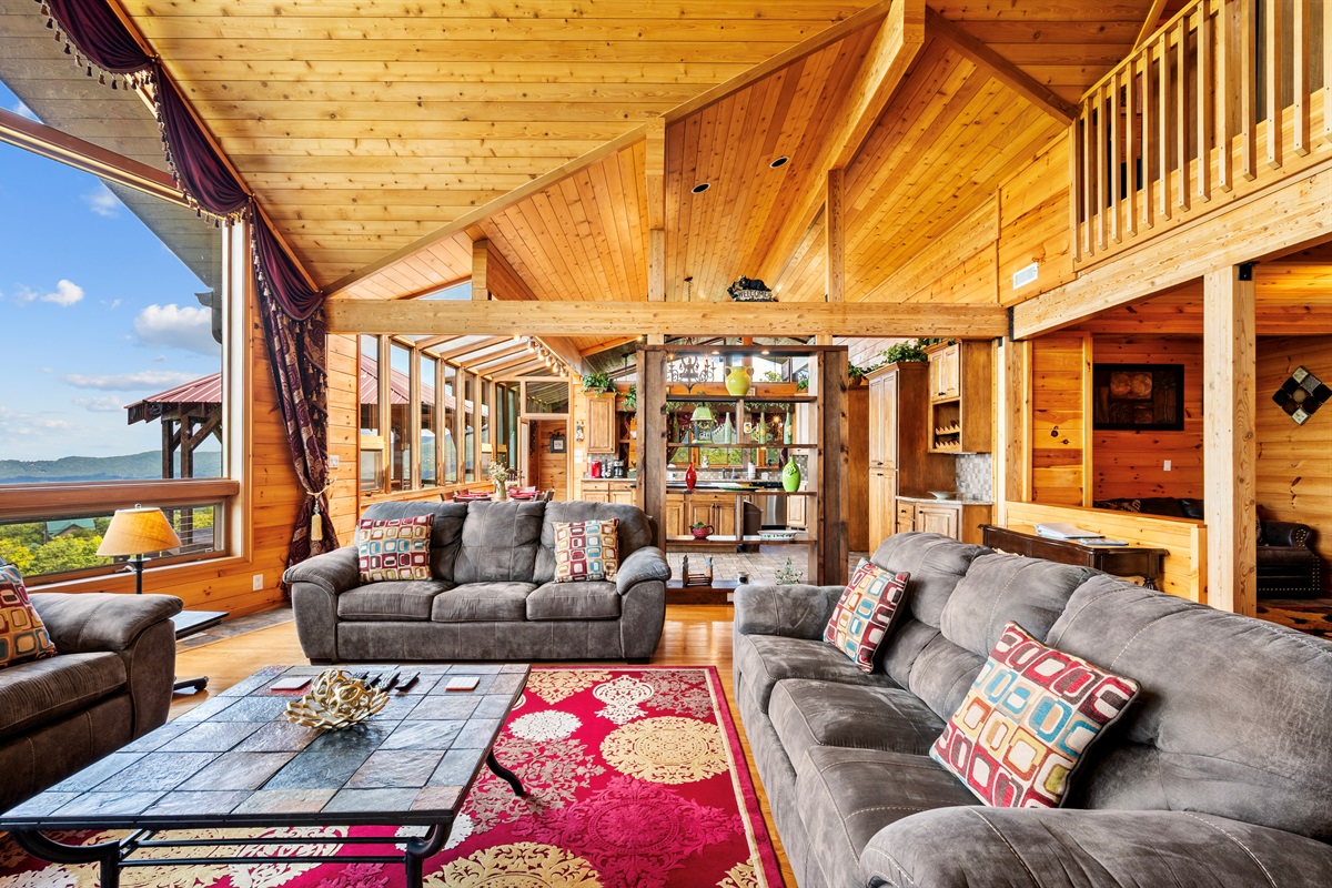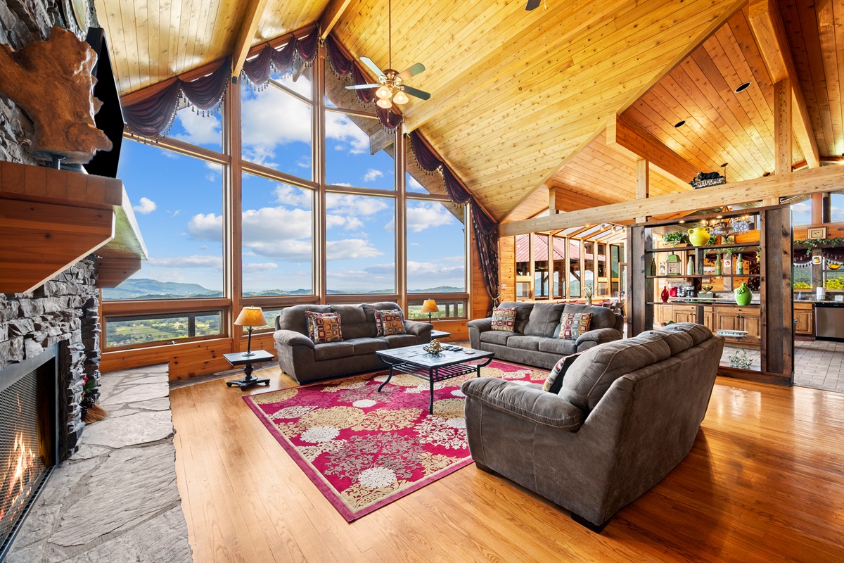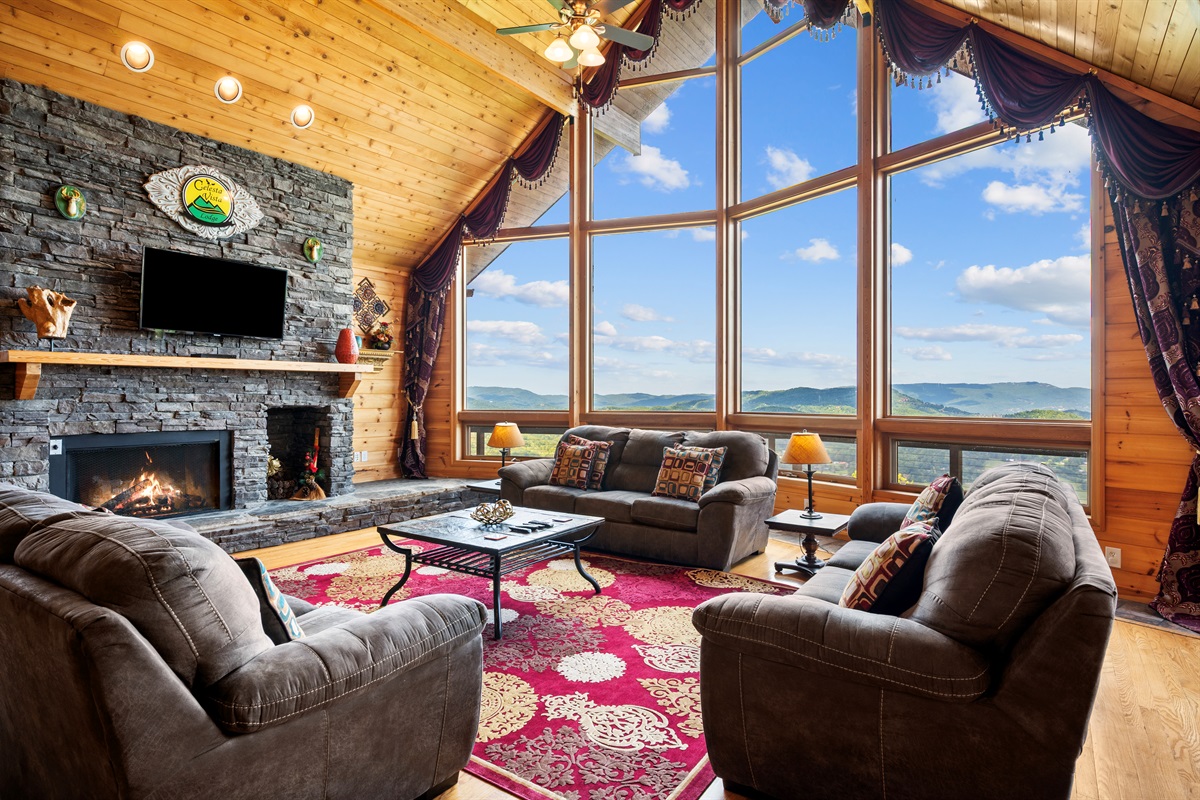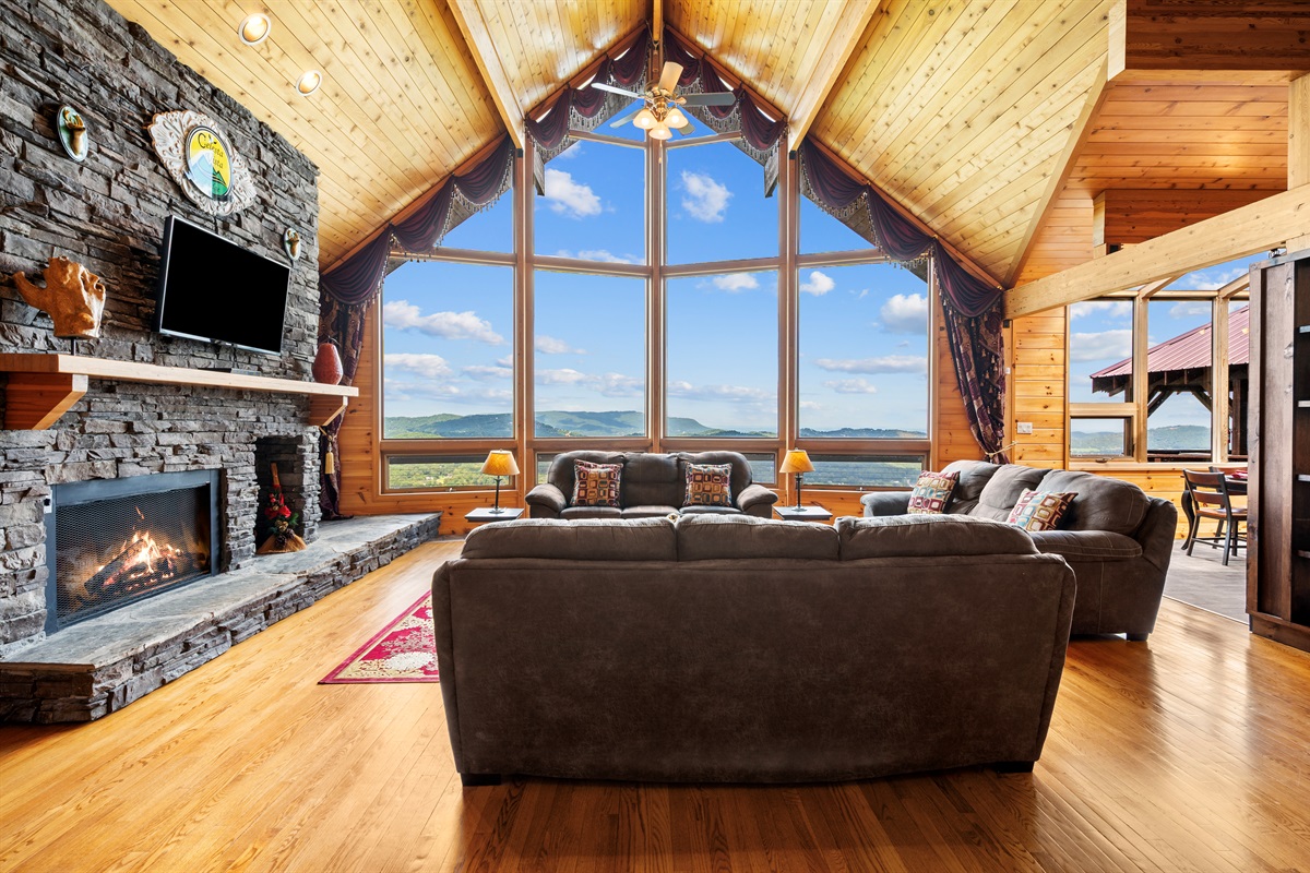 MAIN FLOOR - On the main level of Celesta Vista Lodge is a breath-taking great room, which encapsulates the literal meaning of Celesta Vista. The wall of windows overlooks Wear's Valley and the magnificence of the view can`t be captured in the pictures you are able to view on the website. The main living area features a gas log fireplace and an expansive sitting area with a large 60" flat screen television.
