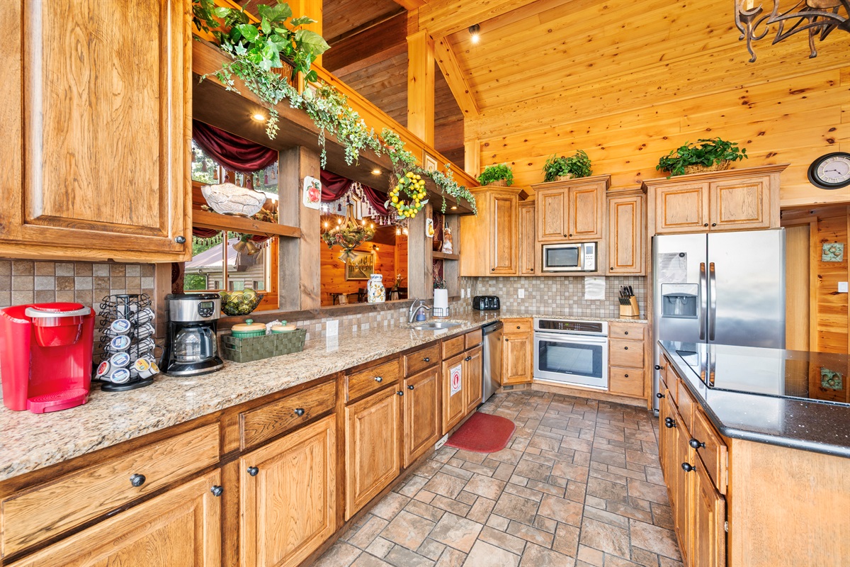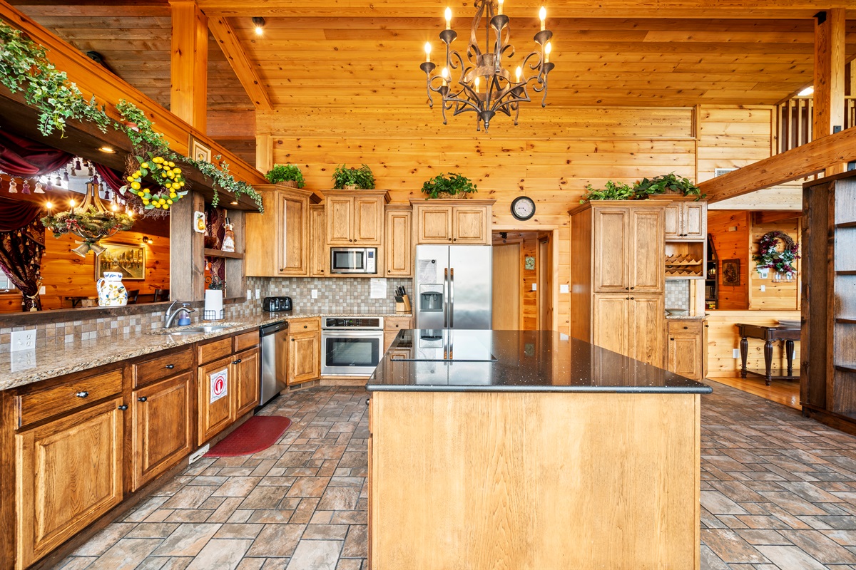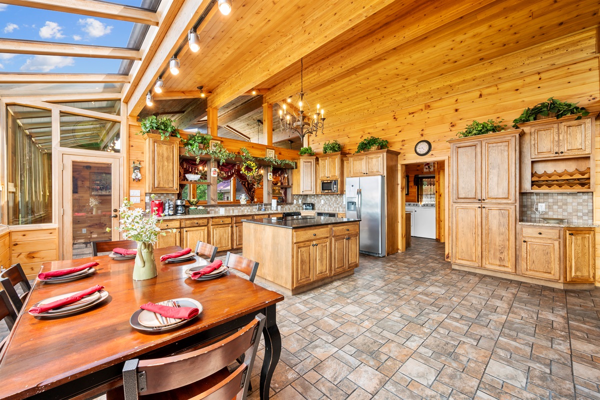 The open-concept room features two interconnected full-service kitchens to make cooking meals for a large gathering easy. All large and small appliances (stove, range, refrigerator, dishwasher, coffee maker, and much more) are available in each kitchen, as well as a full assortment of brand new cookware, dishes, glassware, and cutlery. If you never want to leave the cabin, you are completely set to do so! An over-sized washer and dryer, and half bath are also available on the floor.