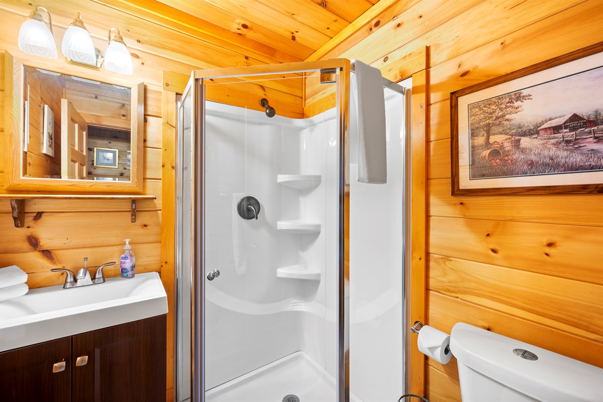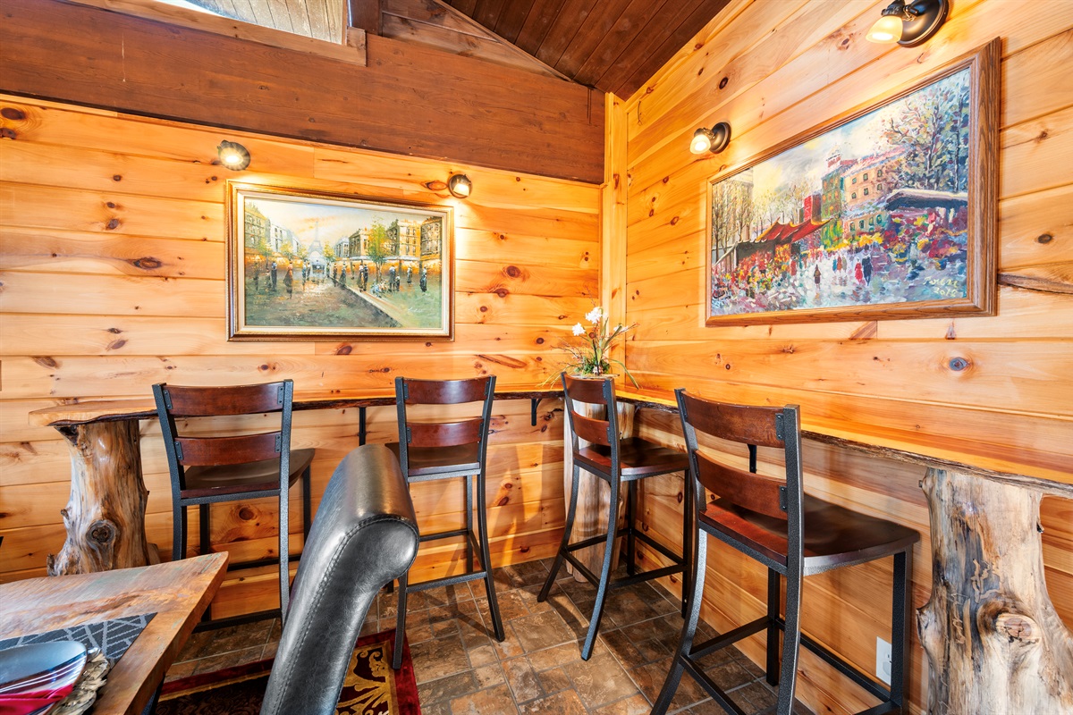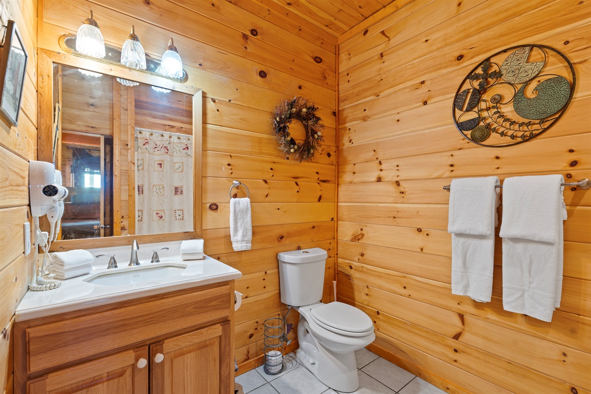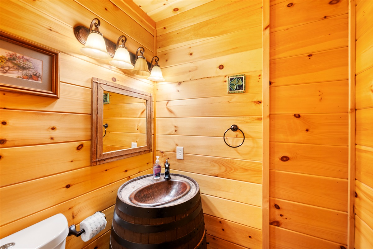 The open-concept room features two interconnected full-service kitchens to make cooking meals for a large gathering easy. All large and small appliances (stove, range, refrigerator, dishwasher, coffee maker, and much more) are available in each kitchen, as well as a full assortment of brand new cookware, dishes, glassware, and cutlery. If you never want to leave the cabin, you are completely set to do so! An over-sized washer and dryer, and half bath are also available on the floor.