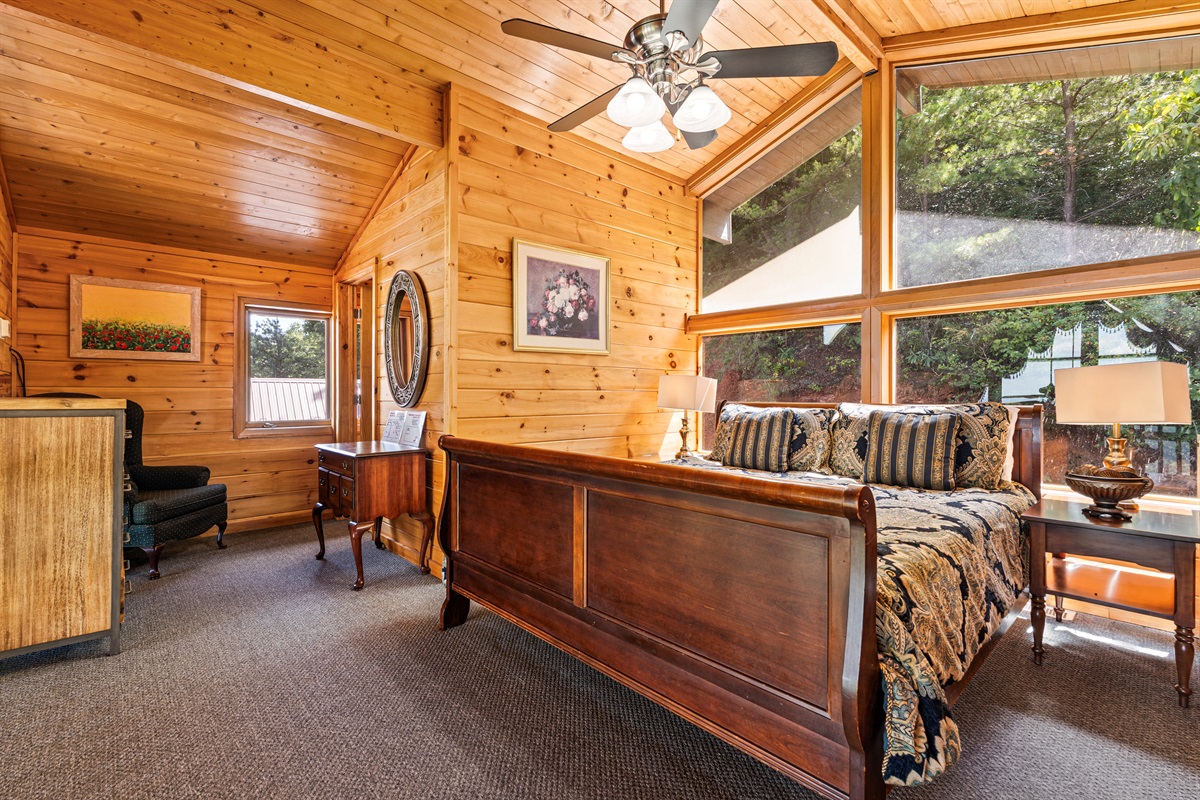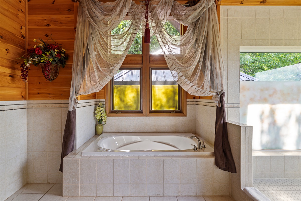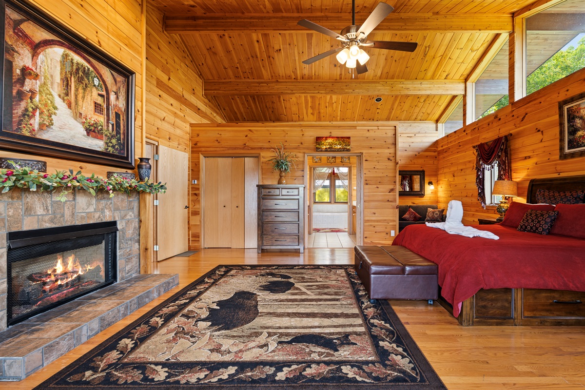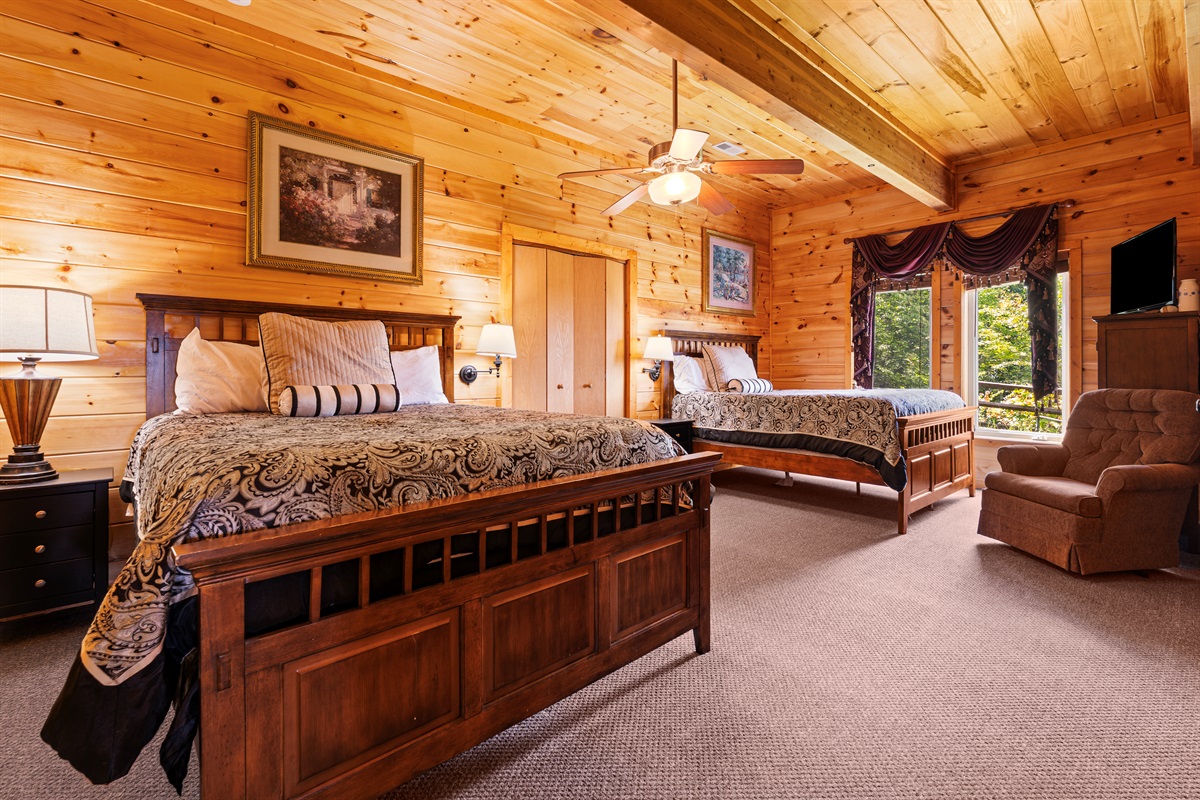 Also off of the great room possibly the largest master bedroom in the Smokies. The bedroom features a King bed, flat-screen television, and DVD player, a large gas fireplace, as well as a chest of drawers, and a walk-in closet. The bedroom also has a private sitting area with a sleeper ottoman. Off the large bedroom is the en-suite bath including an oversized whirlpool tub and a unique, walk-in, dual head shower with floor to ceiling glass windows that looks down into the valley.