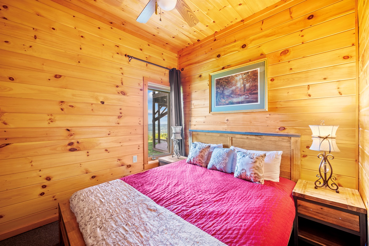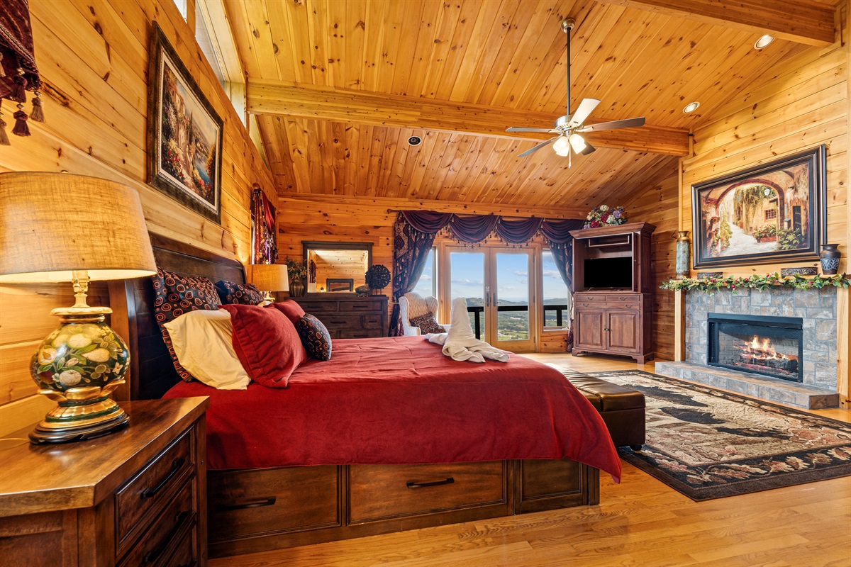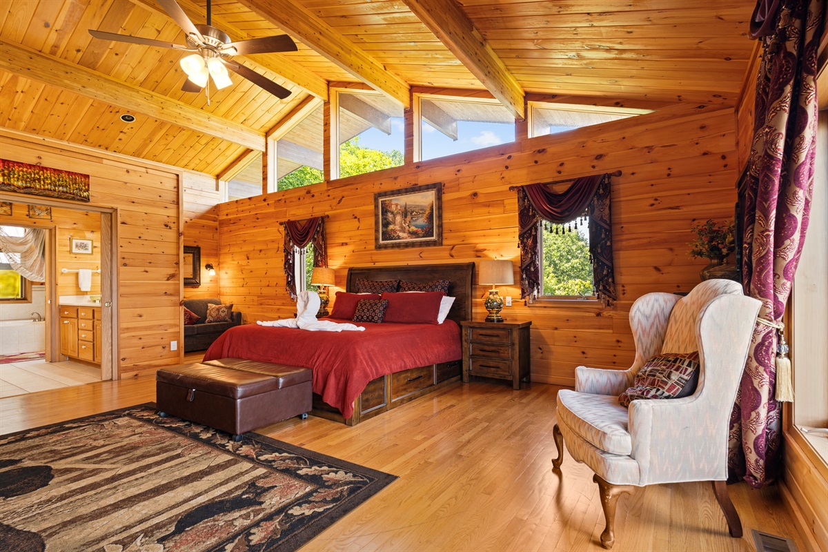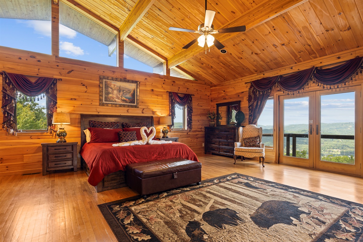 UPSTAIRS LOFT - The upstairs loft is an open-air bedroom that overlooks the Great Room below. The room features a king-sized bed and a full ensuite bathroom. The loft is equipped with a flat-screen television, DVD player, chest of drawers, and a separate closet. The view from the loft to the valley below is truly one of the most impressive views from inside the home.