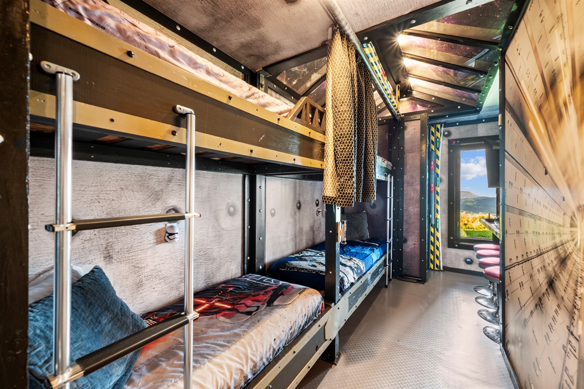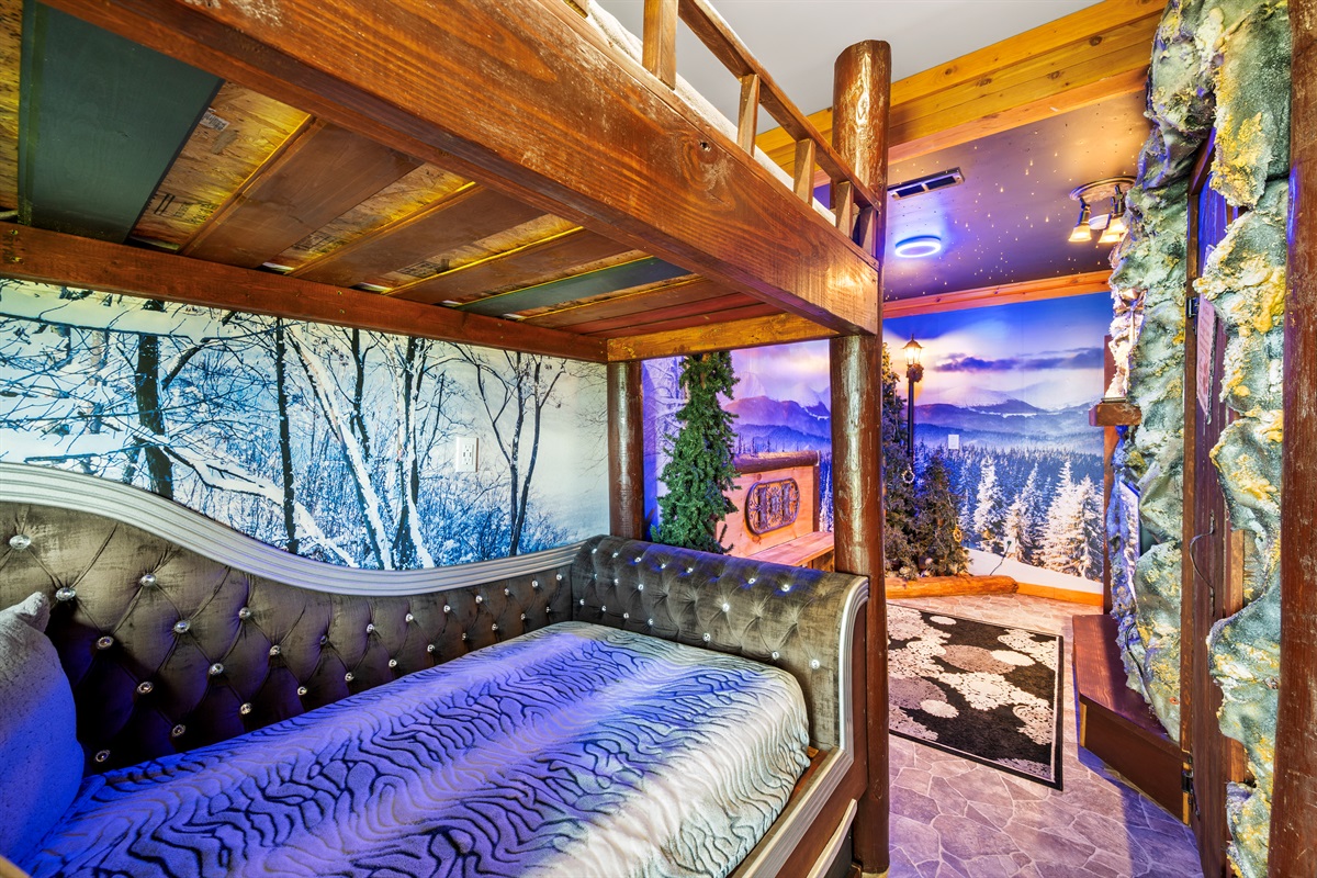 The same hallway with the theater also has 3 additional bedrooms. The first is a queen bedroom with an ensuite bathroom. Further down are the two children's rooms. The “Jedi Academy”, with two sets of spaceship pod (twin)bunk beds (sleeps 4), and “Narnia’s Wardrobe” with two sets of elaborate sleigh (twin)bunk beds (sleeps 4). The Jedi Academy and Naria’s Wardrobe share a full bathroom located in the hallway.