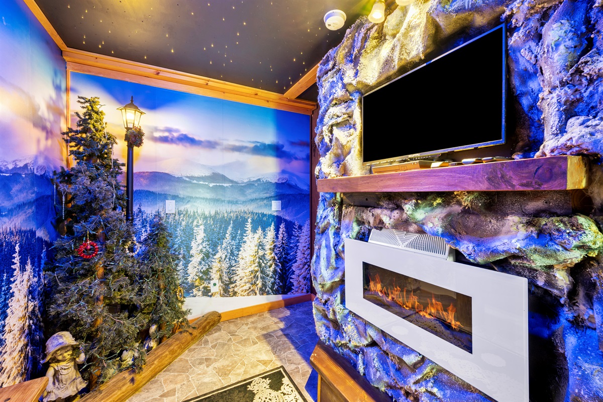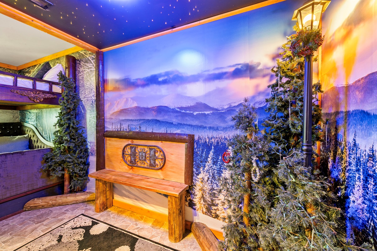 “Narnia’s Wardrobe” is modelled on the land of Narnia and is appropriately accessed through an ornately decorated wardrobe that opens to reveal a magical winter wonderland. When you step into the wardrobe, Narnia awaits with a snow-covered forest, stone mountain walls with an electric fireplace (the entrance to Mr. Tumnus’s home), luxury sleigh beds, a ceiling of stars, and of course the frozen lamppost!!