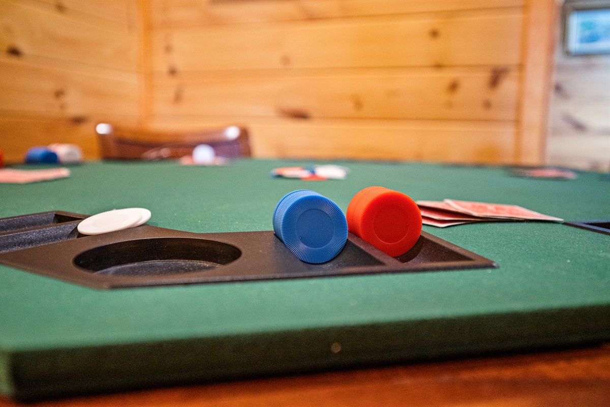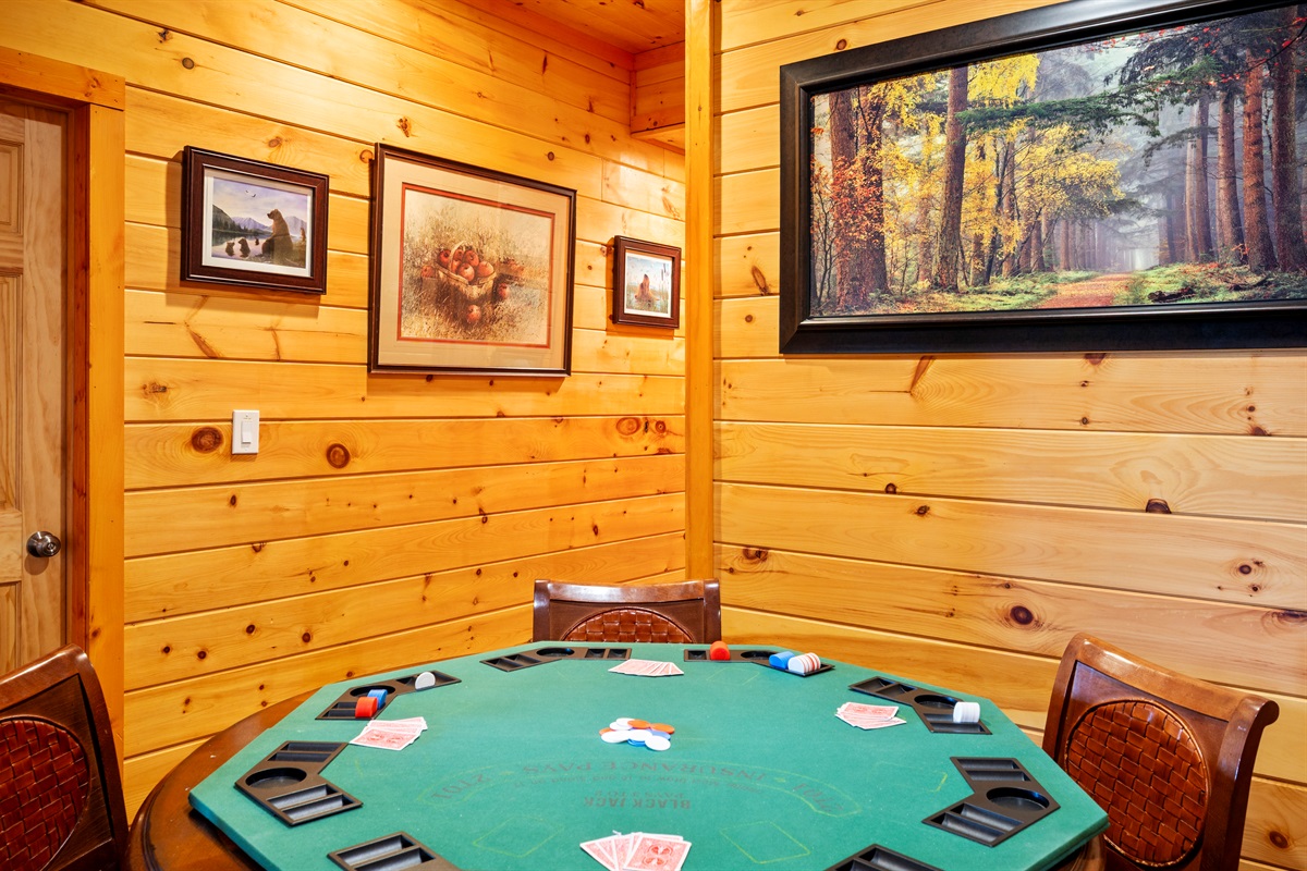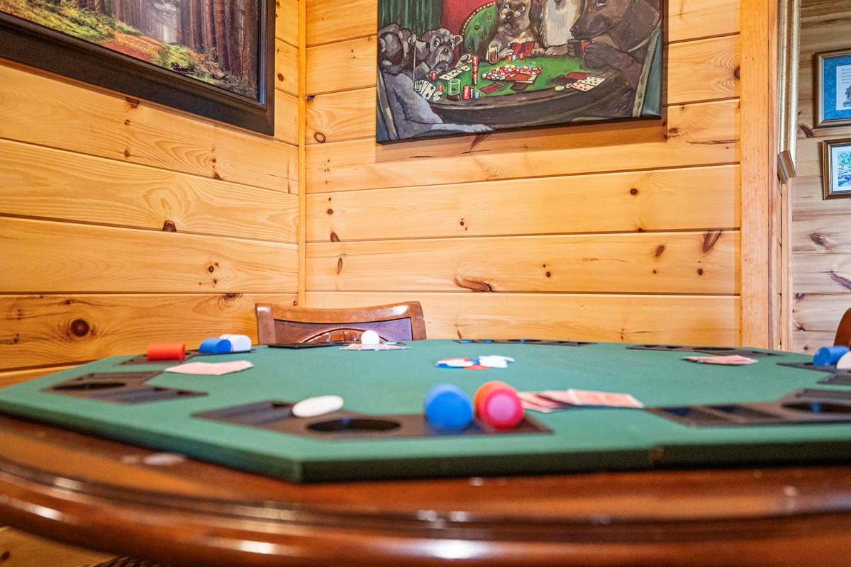 The pub's recreation has a gas fireplace with a 60" flat-screen TV, DVD player, and Xbox-360. The room features a full-sized pool table, dartboard, air hockey table, foosball, poker table, and an upright arcade game featuring 60 free play video games from yesteryear (Pac Man, Ms. Pac Man, Donkey Kong, etc). A wide assortment of your favorite movies and games have also been provided for your enjoyment.