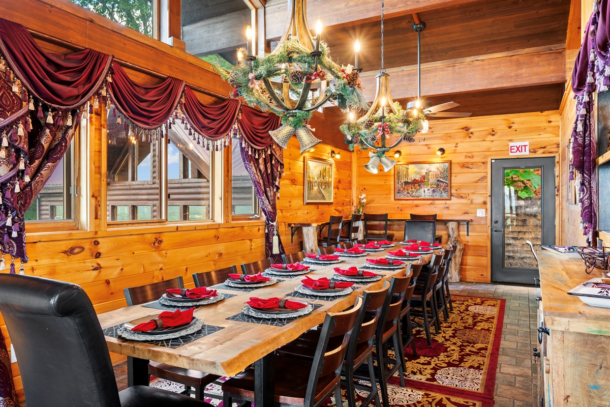 The extended great room features an adjacent, but separate dining area that will accommodate 32 persons. This includes a master dining table which comfortably will seat 20, an elevated bar area with seating for 4, and a separate dining table for 6.