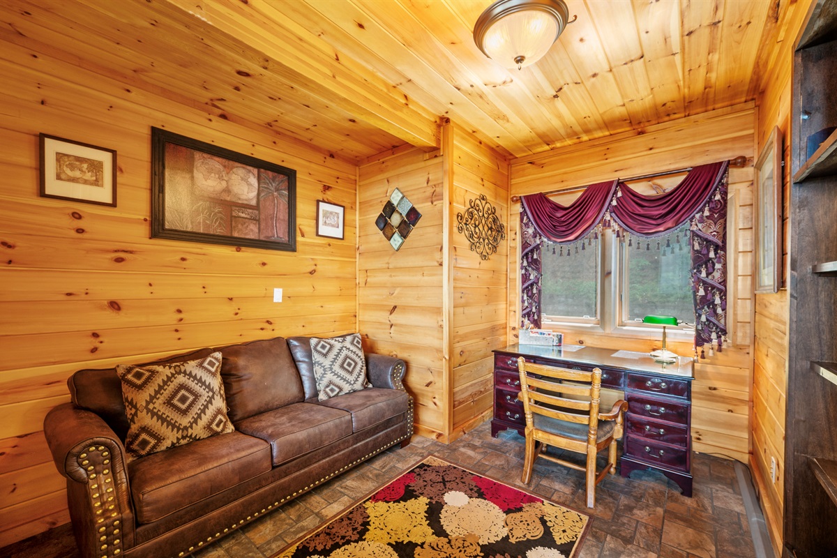 Connected to the great room are a study and business center, offering a space for workaholics or those on a working vacation. The study also has a variety of books and can be used as an area where one can lose yourself in the pages of your favorite novel. The sofa in the study conveniently converts to a queen bed for an additional sleeping area.