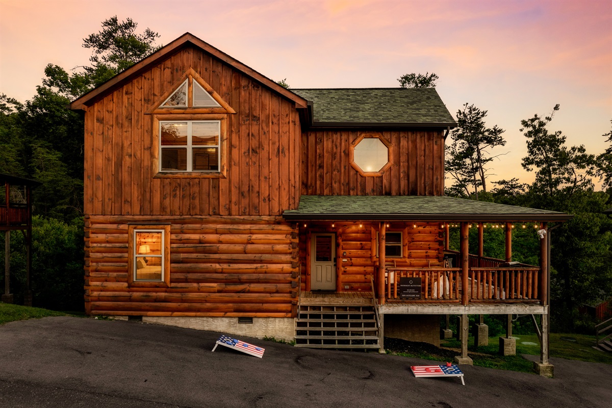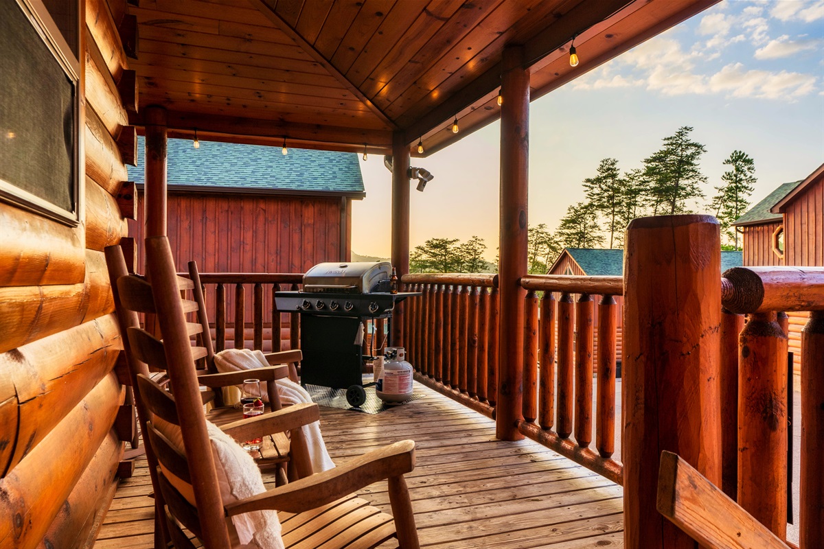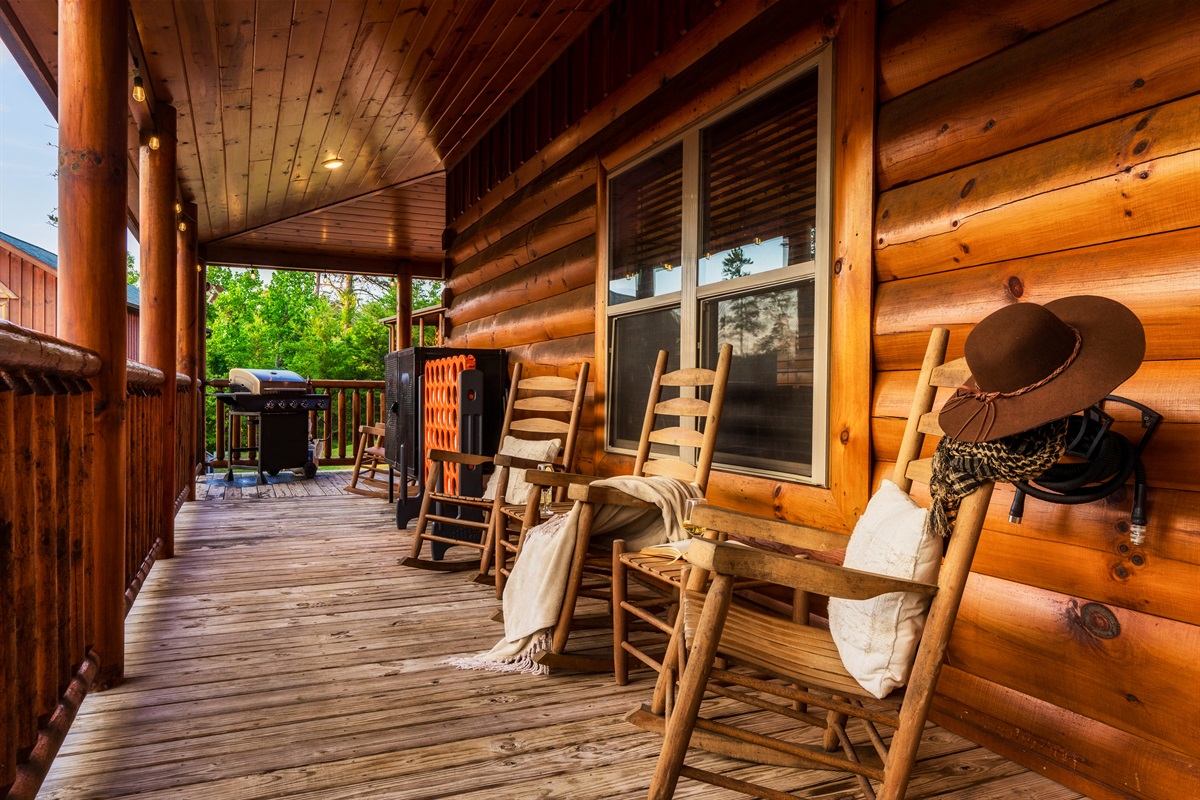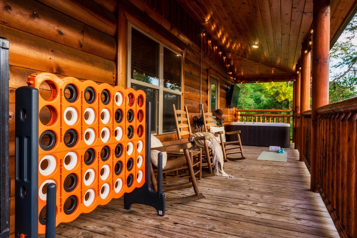 What really makes Flapjack stand out is the experience factor. The private indoor pool gives families a built-in activity no matter the weather, and the outdoor deck keeps the fun going with a hot tub, TV by the hot tub, cornhole, string lights, a new gas grill, and plenty of rocking chairs for relaxing in true cabin style.