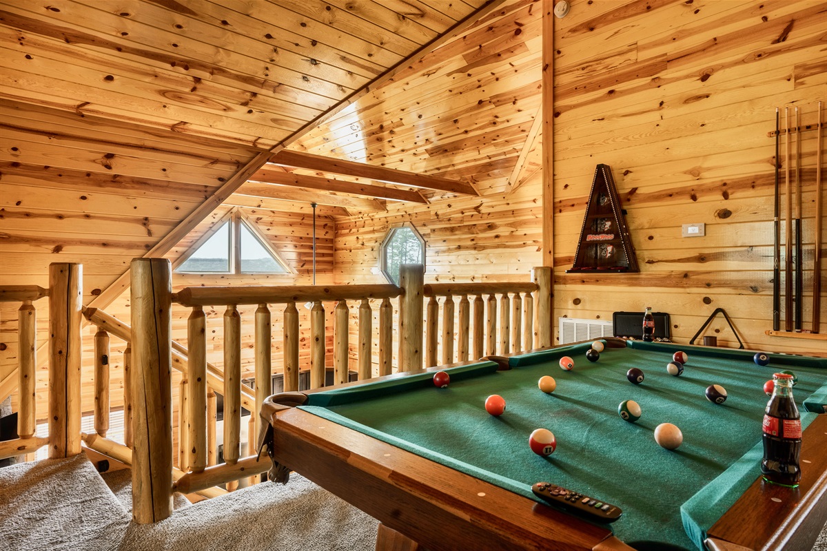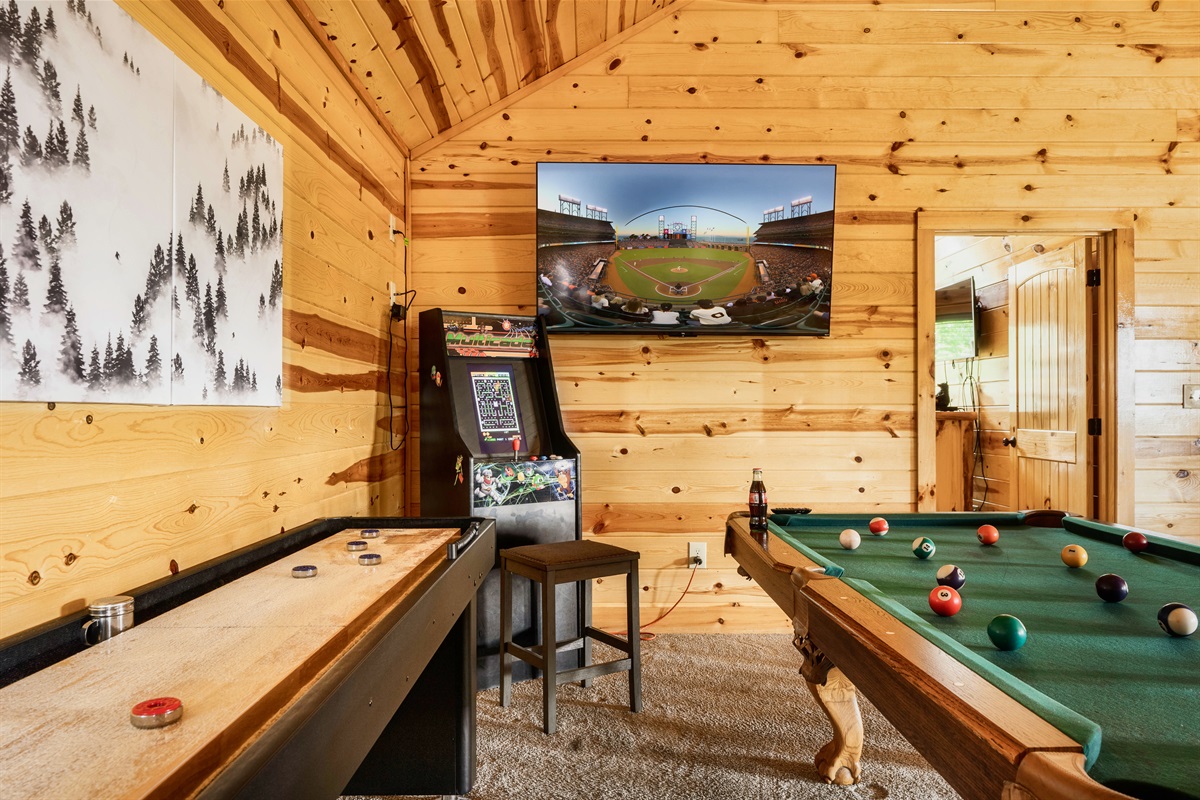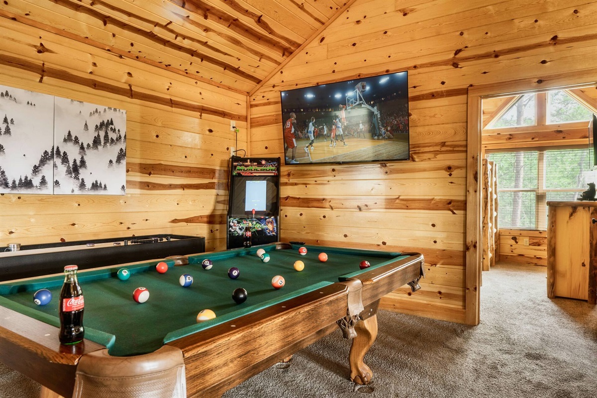 Upstairs, the loft is a full-on entertainment zone with a pool table, shuffleboard, arcade game, and a large TV, giving kids, teens, and adults plenty to do without ever leaving the cabin.