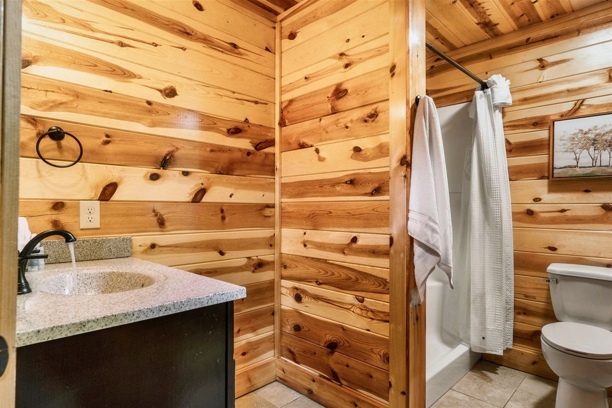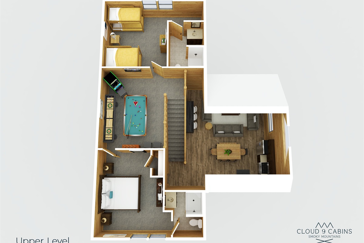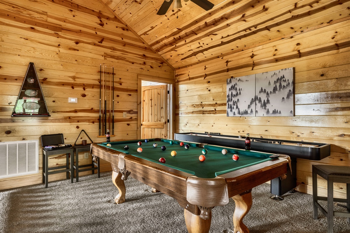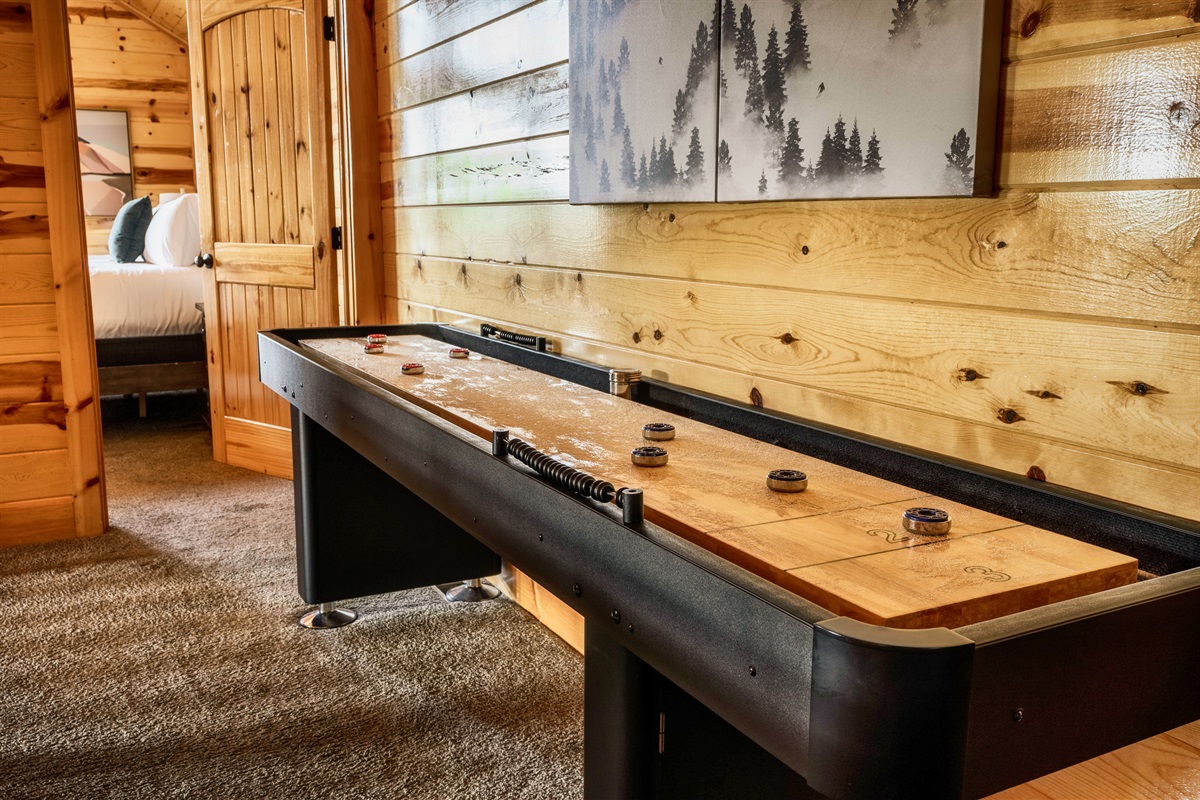 Upstairs, the loft is a full-on entertainment zone with a pool table, shuffleboard, arcade game, and a large TV, giving kids, teens, and adults plenty to do without ever leaving the cabin.