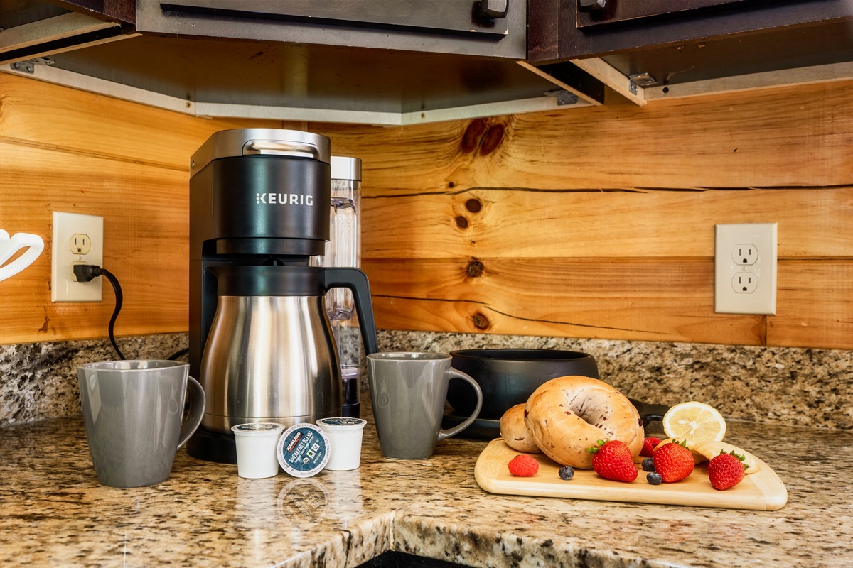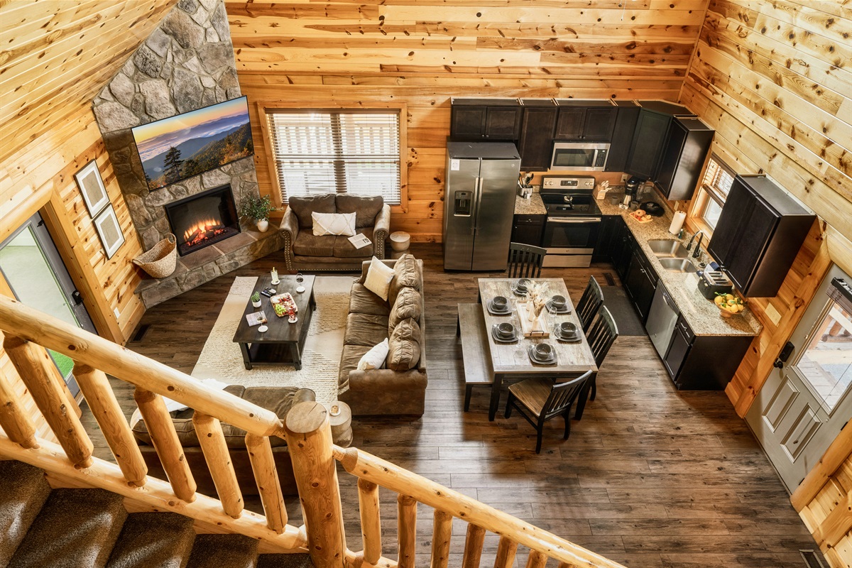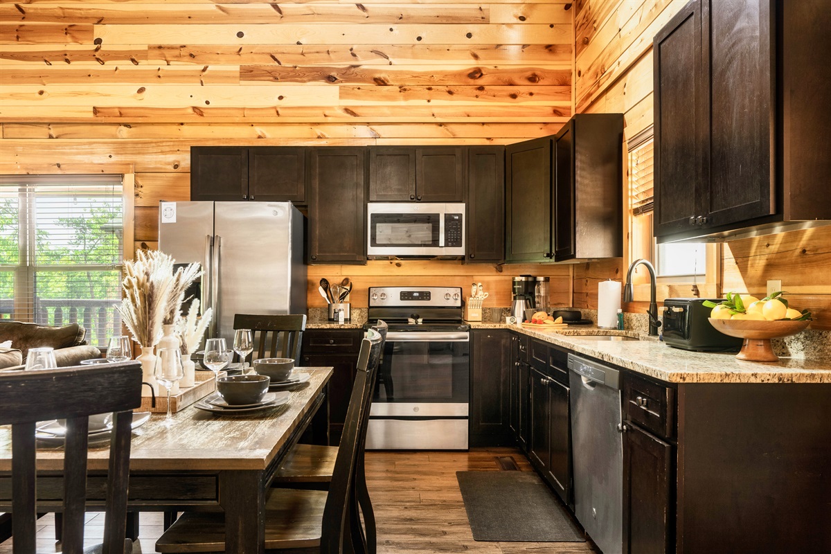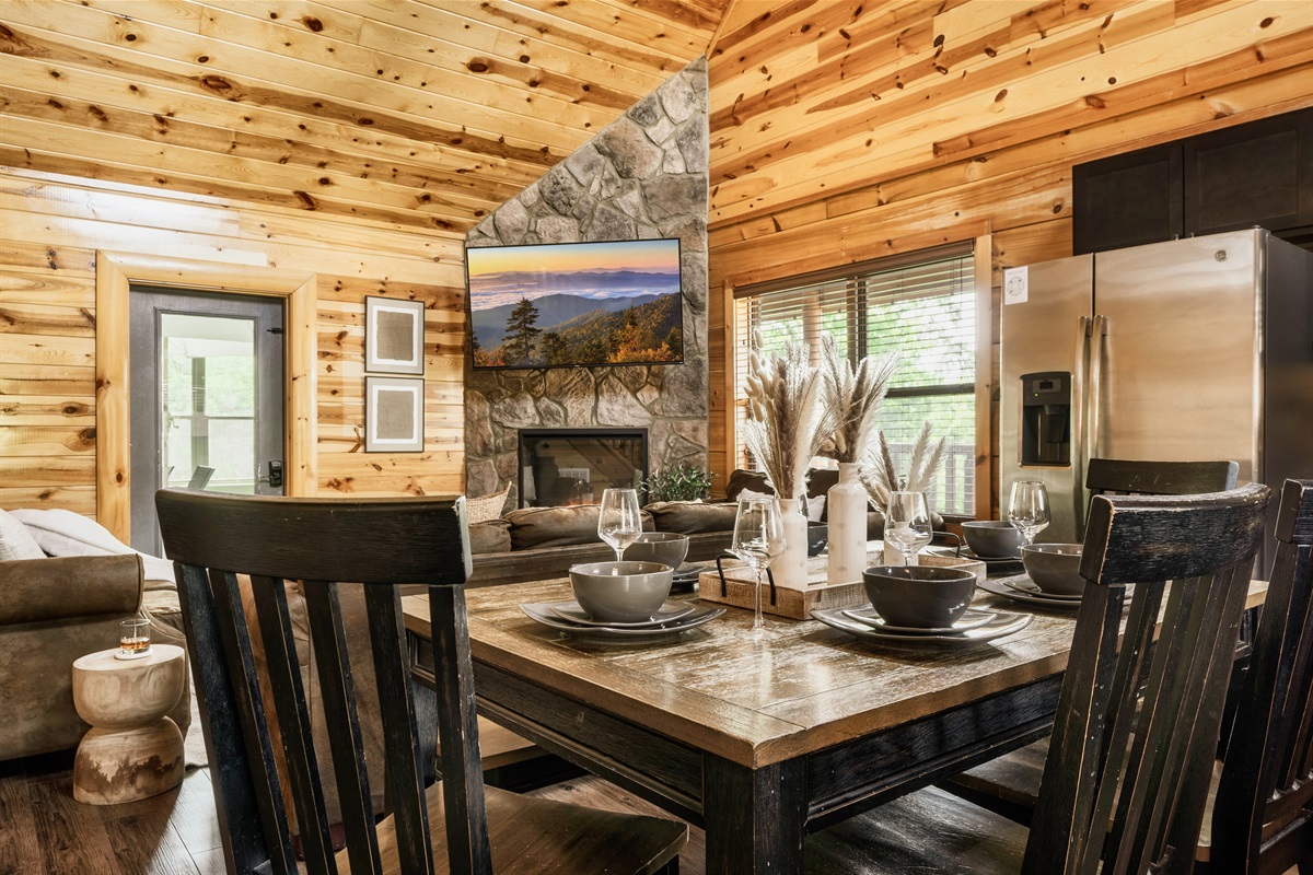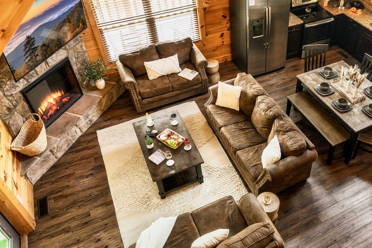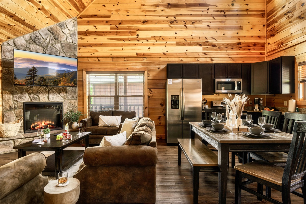 Inside, the cabin feels warm, inviting, and thoughtfully set up for groups. The living room has a cozy electric fireplace, comfortable seating, and a layout that makes it easy for everyone to gather together. The kitchen is well-equipped for meals at the cabin, and there’s additional seating with bar stools so guests have room to spread out at mealtime.