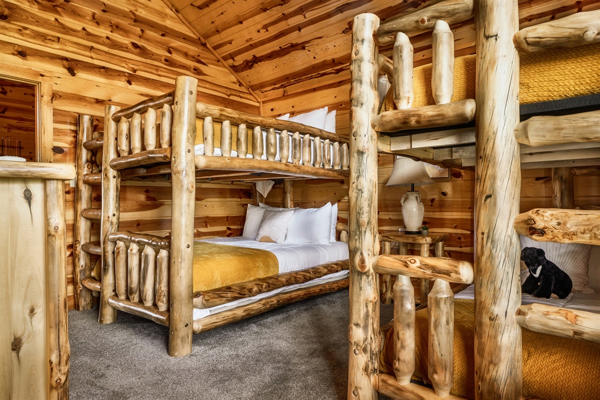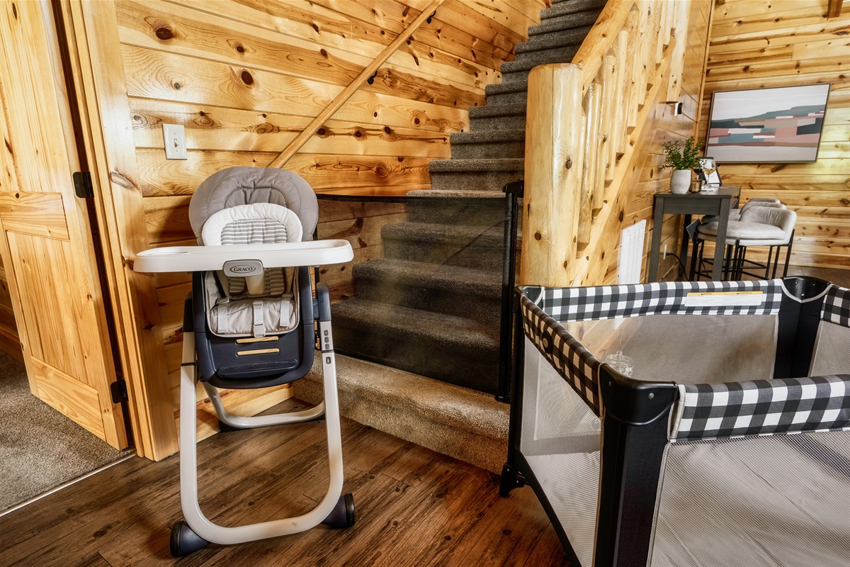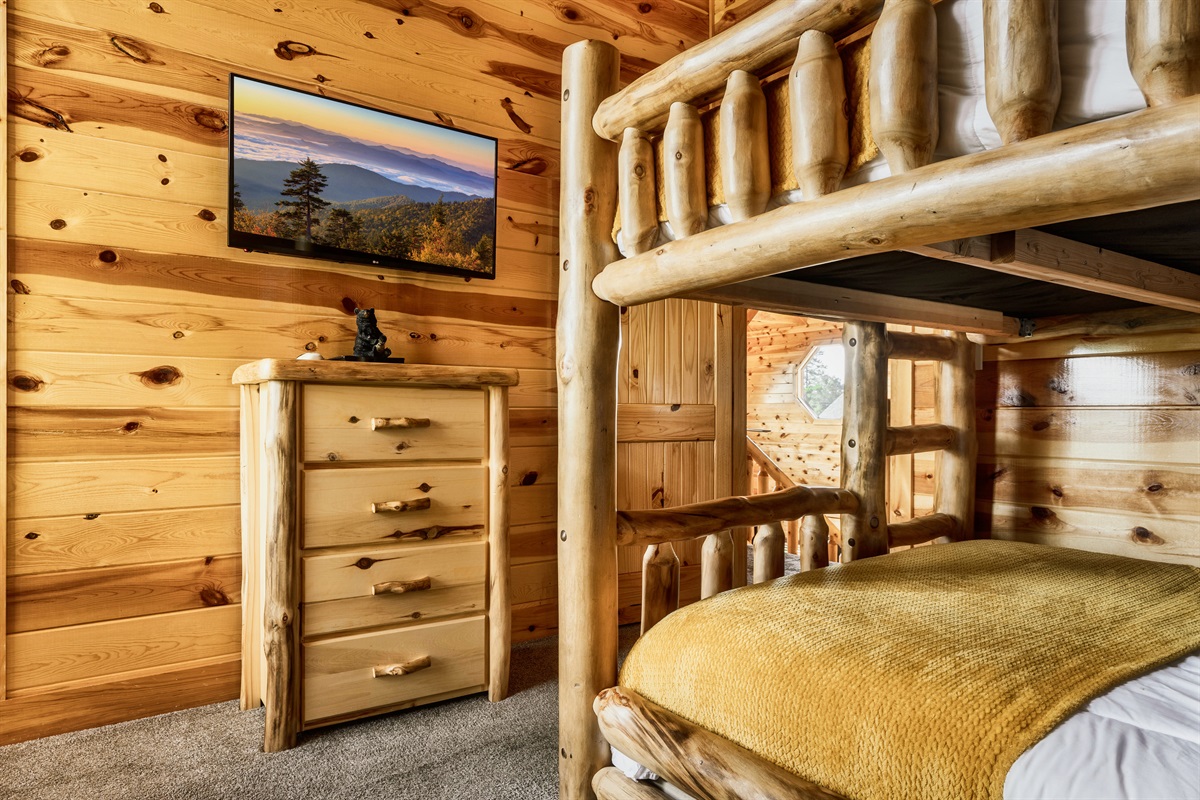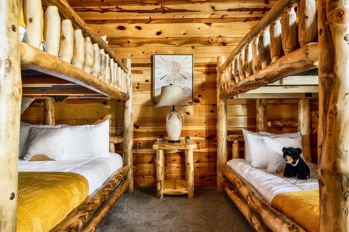 Each bedroom has its own private bathroom, which is a huge plus for group stays. Guests will also appreciate Smart TVs in every bedroom, USB chargers at the nightstands, closets, and clothing storage throughout the cabin. For families traveling with little ones, the cabin also includes a Pack ’n Play and high chair. The bunk room with two sets of bunk beds makes this an especially easy fit for larger families and multi-family trips.
