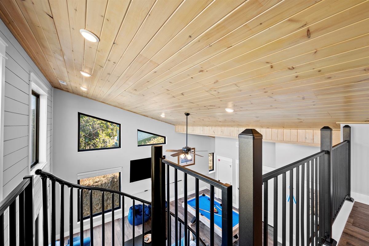 View from the loft overlooking the main living area, highlighting the open layout and thoughtful design of the home.