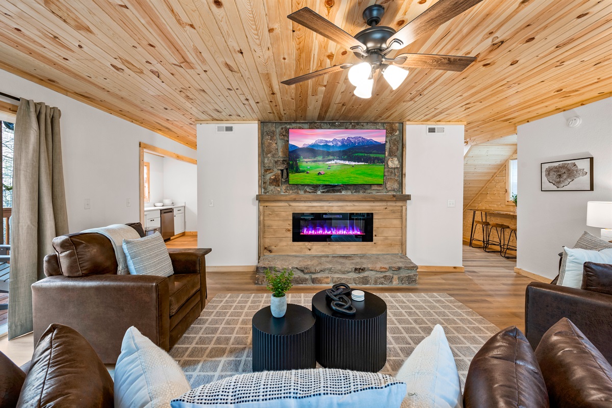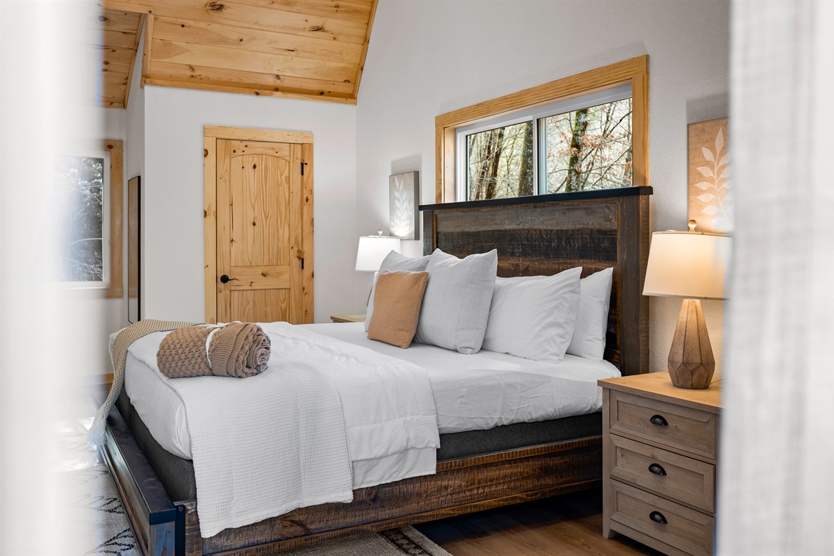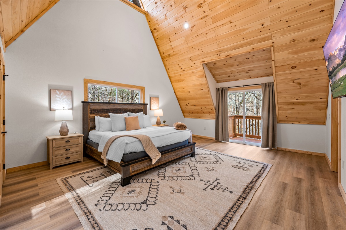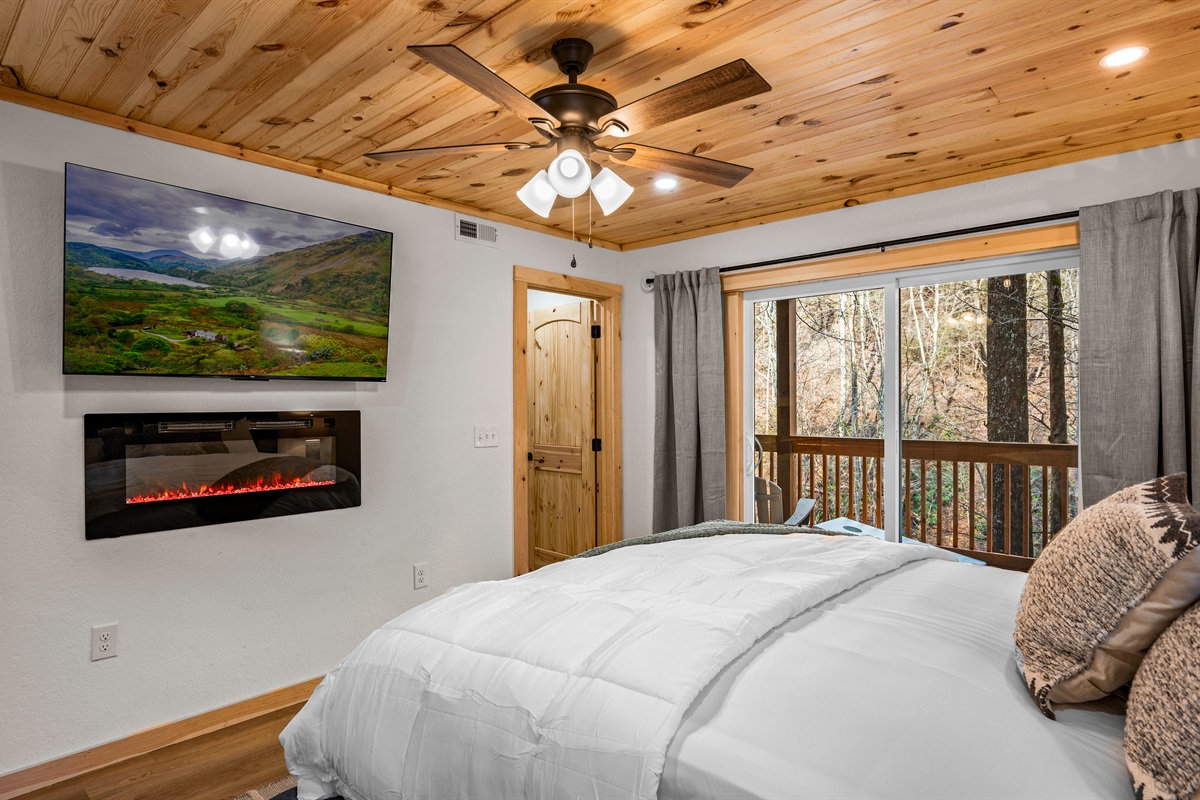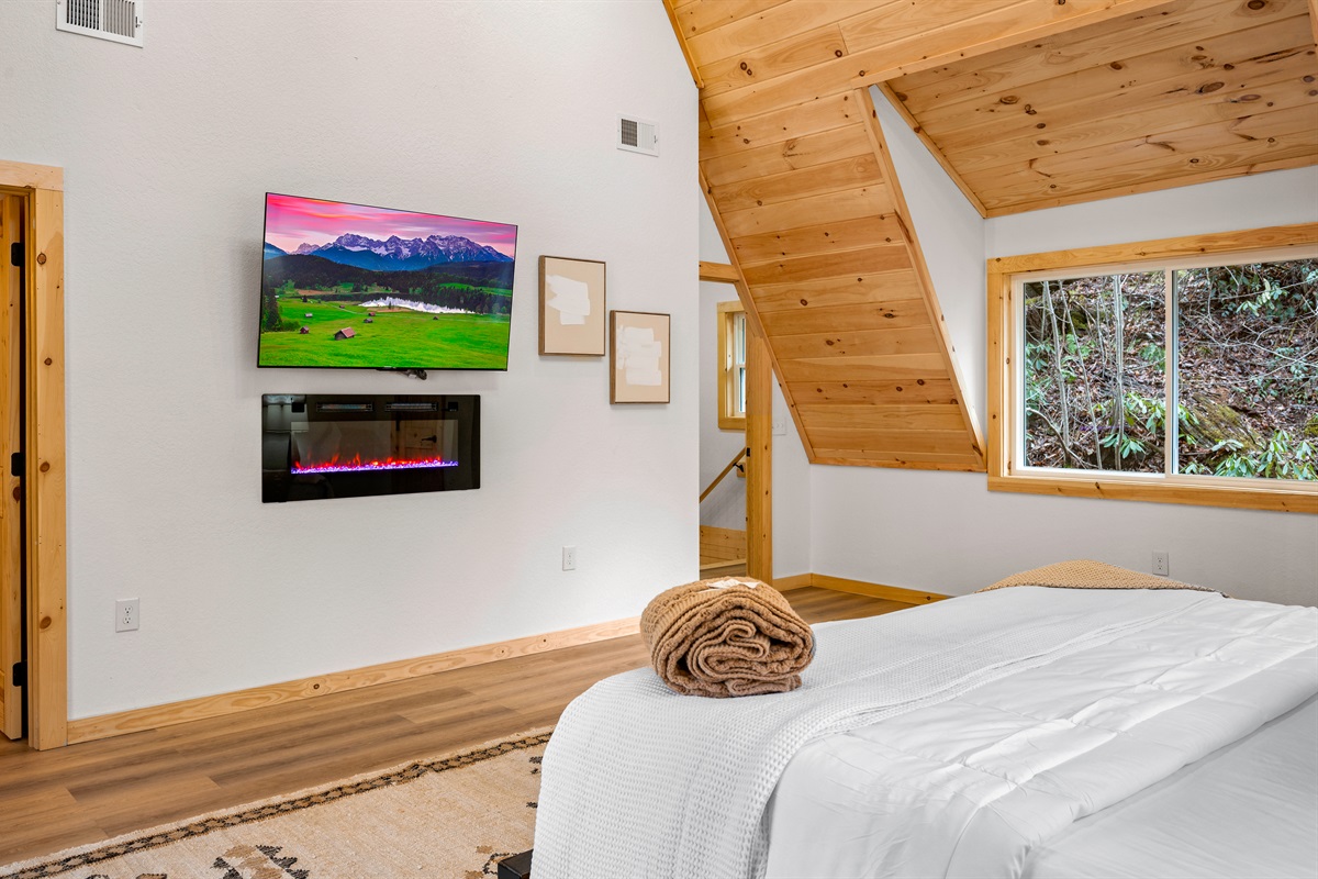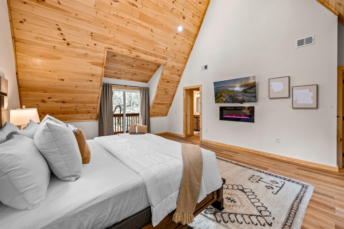 The King suite features high cathedral ceilings and ample space to feel right at home. Enjoy a Roku Smart TV mounted above a sleek, modern electric fireplace to bring cozy mountain vibes right into your bedroom.