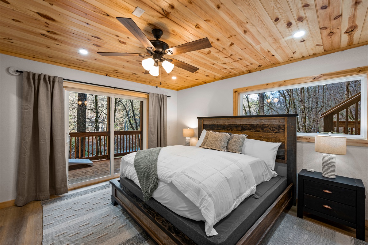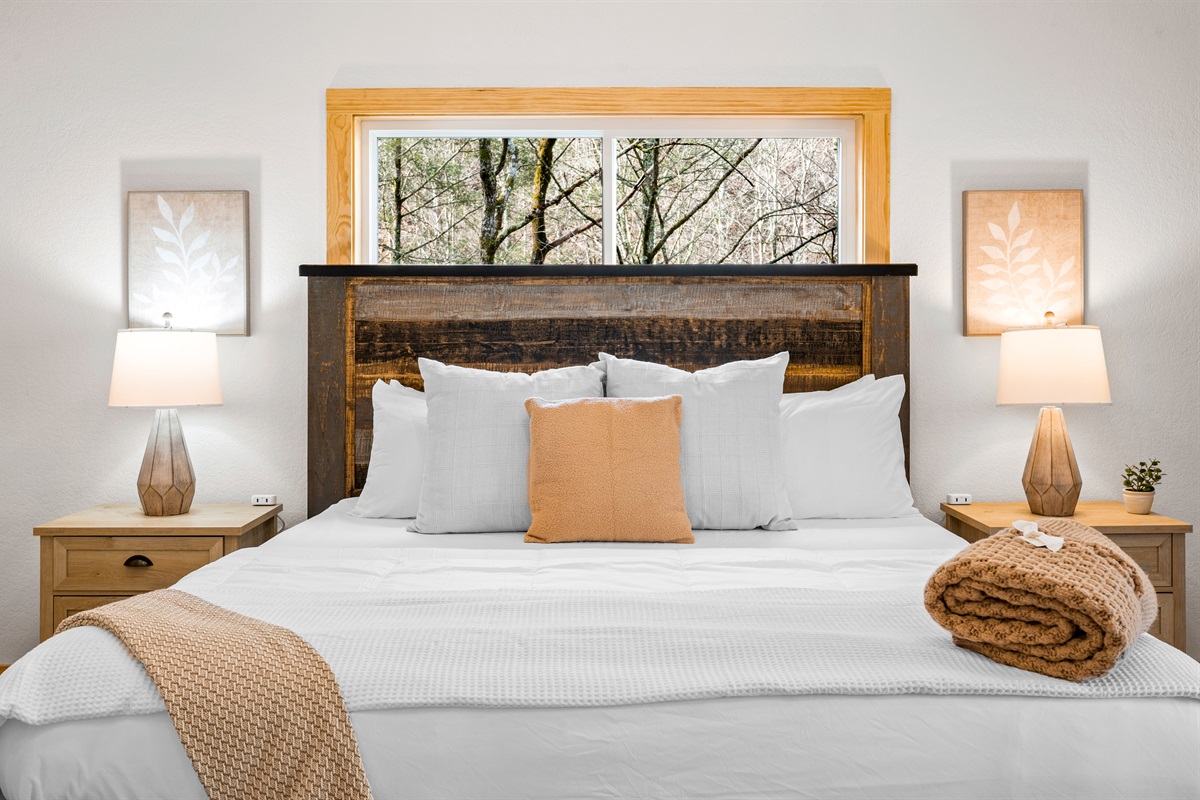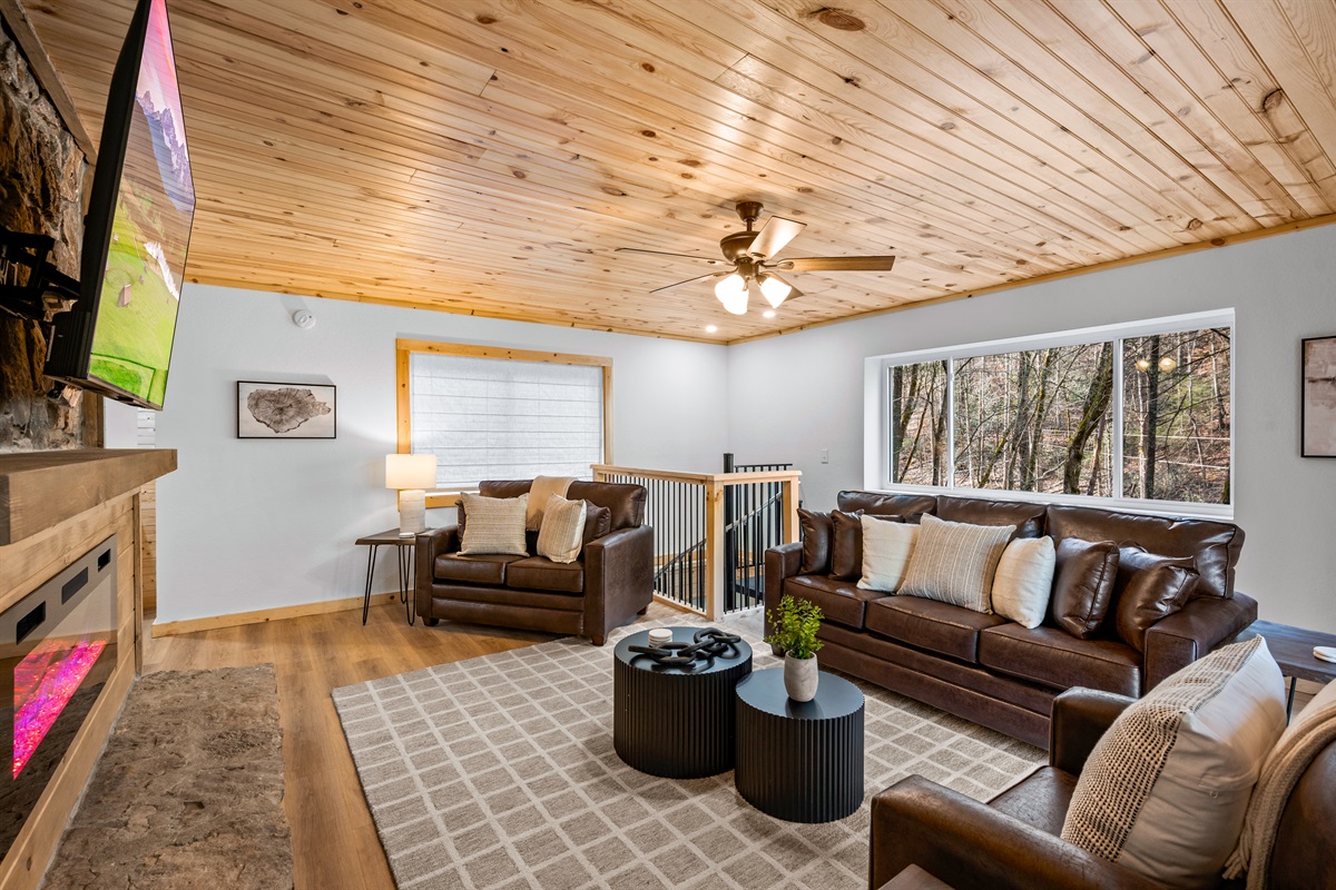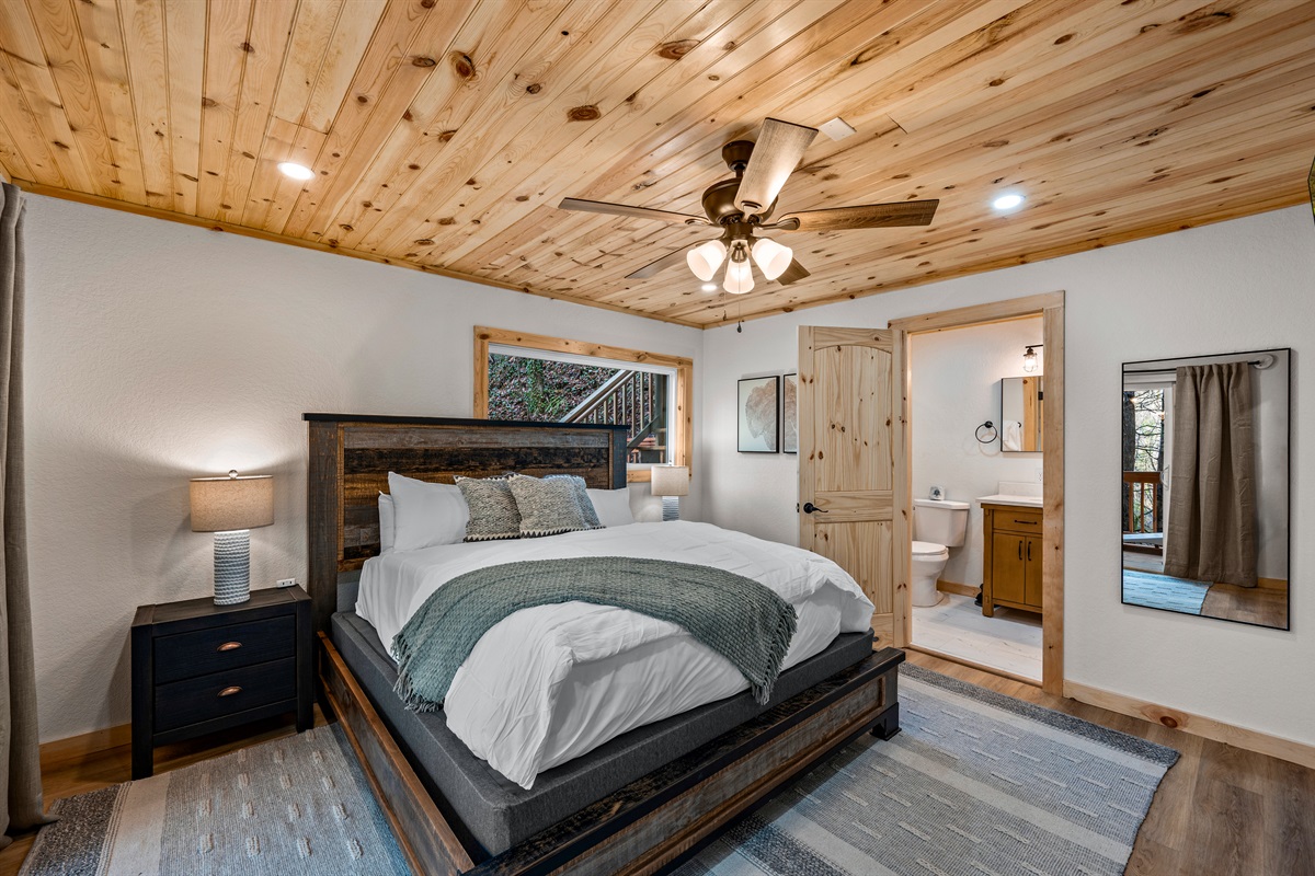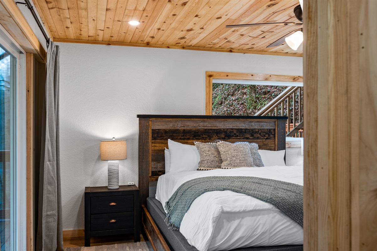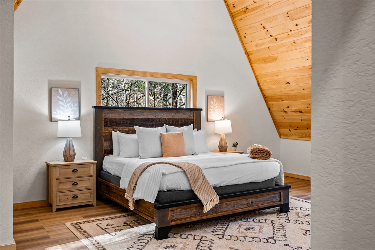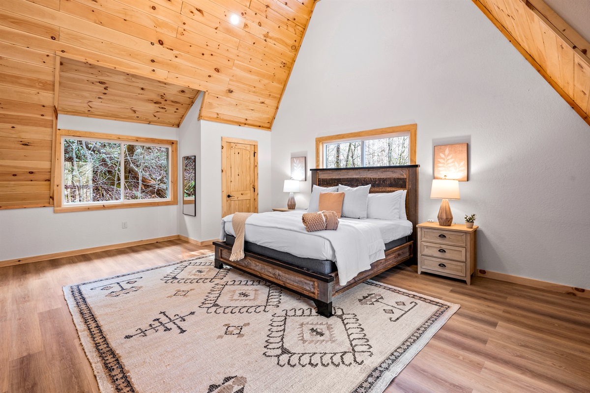 The King suite features high cathedral ceilings and ample space to feel right at home. Enjoy a Roku Smart TV mounted above a sleek, modern electric fireplace to bring cozy mountain vibes right into your bedroom.