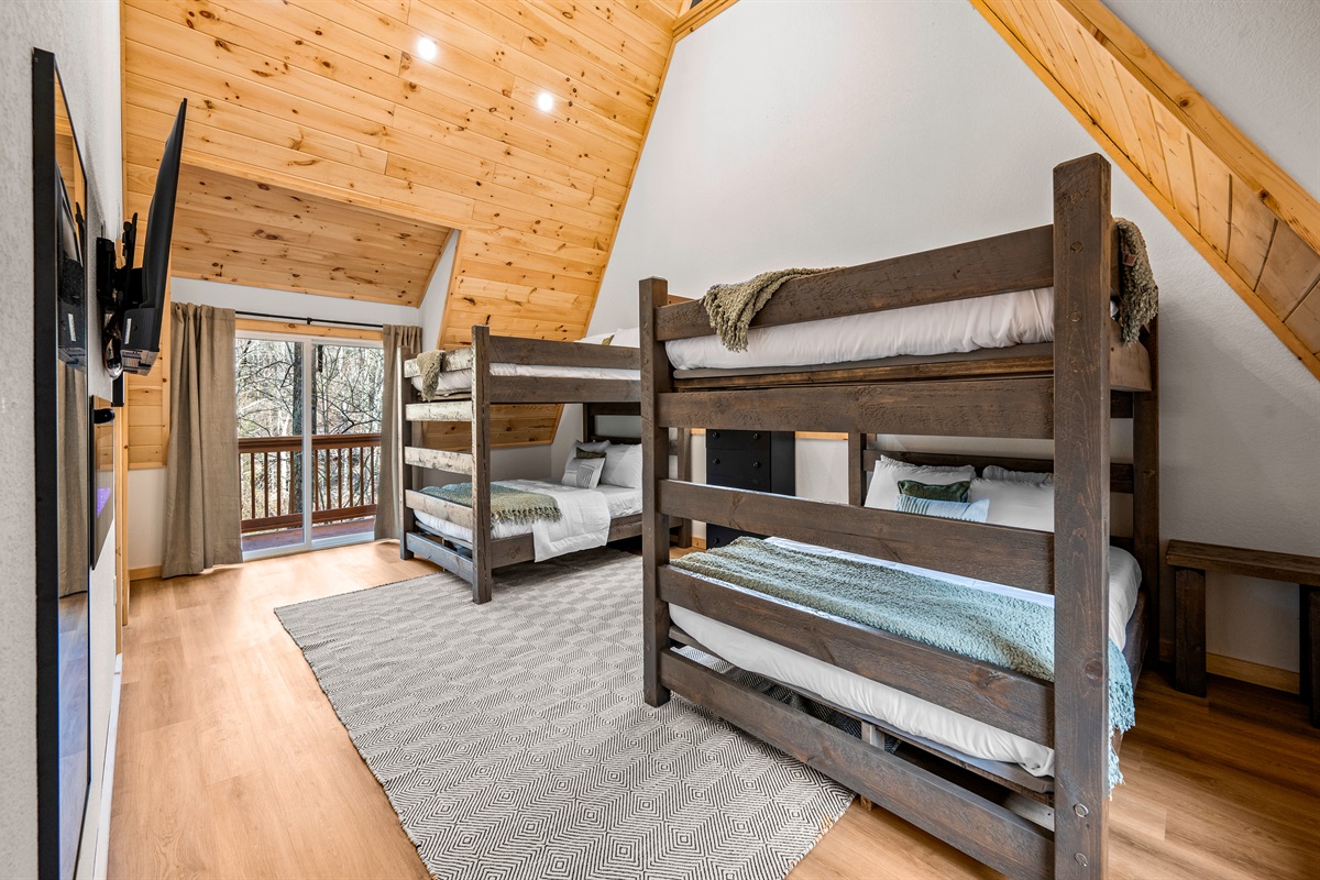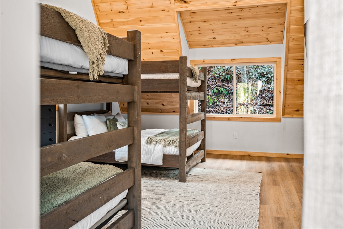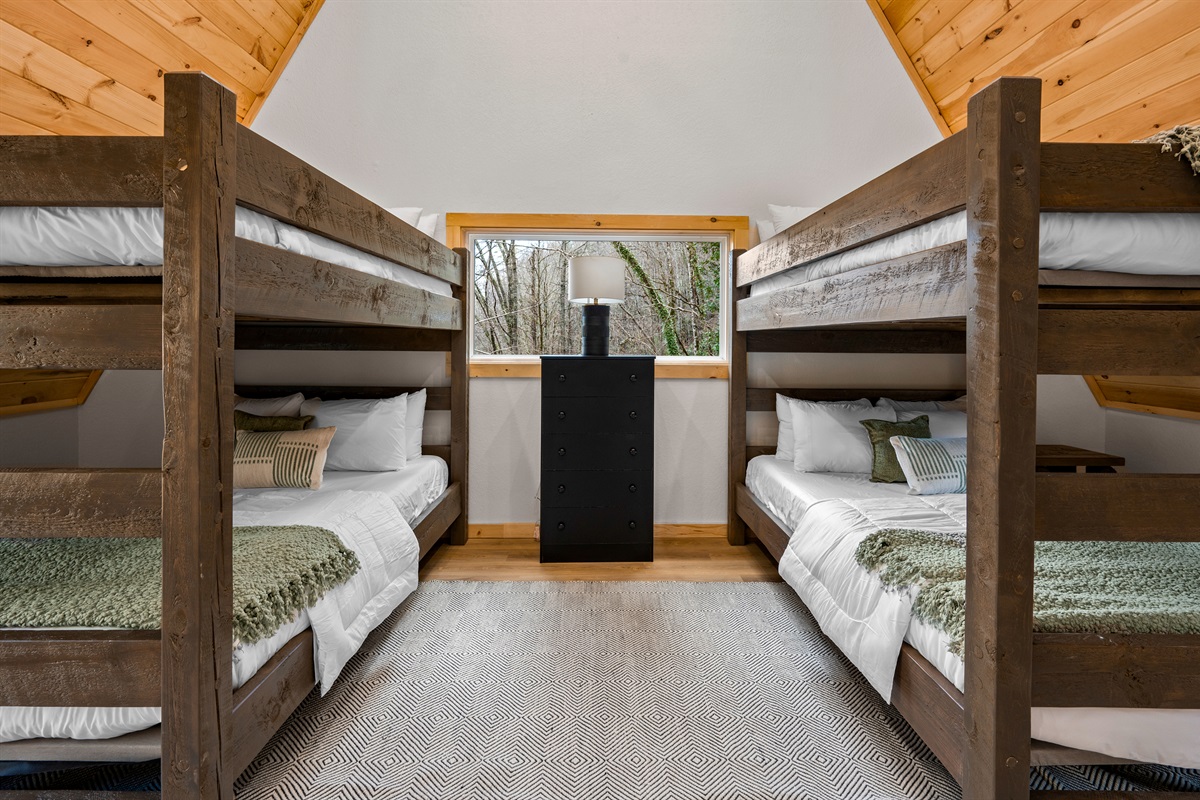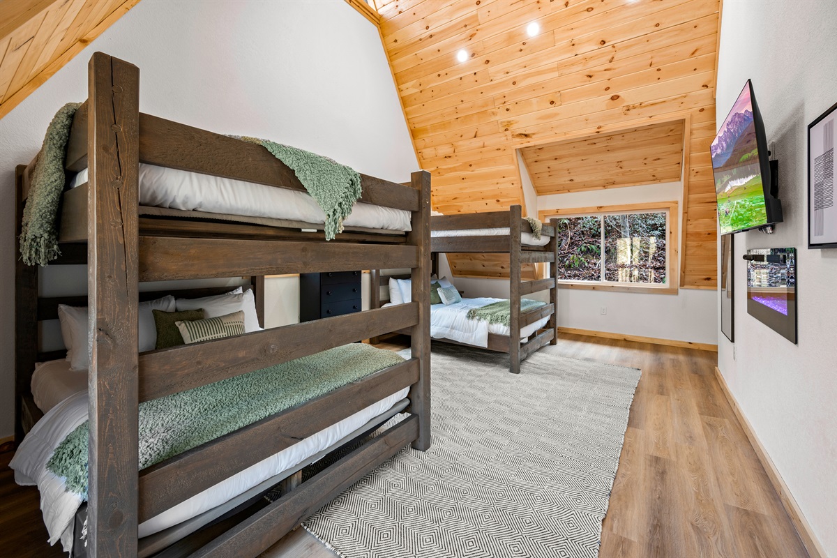 Down the hall, you'll find our Bunk suite, equipped with 2 Queen-over-Queen bunkbeds to comfortably sleep an additional 8 guests. This room also features high cathedral ceilings and offers plenty of space so that those sharing the room do not feel over-crowded. The bunk room also features a Roku Smart TV and additional electric fireplace.