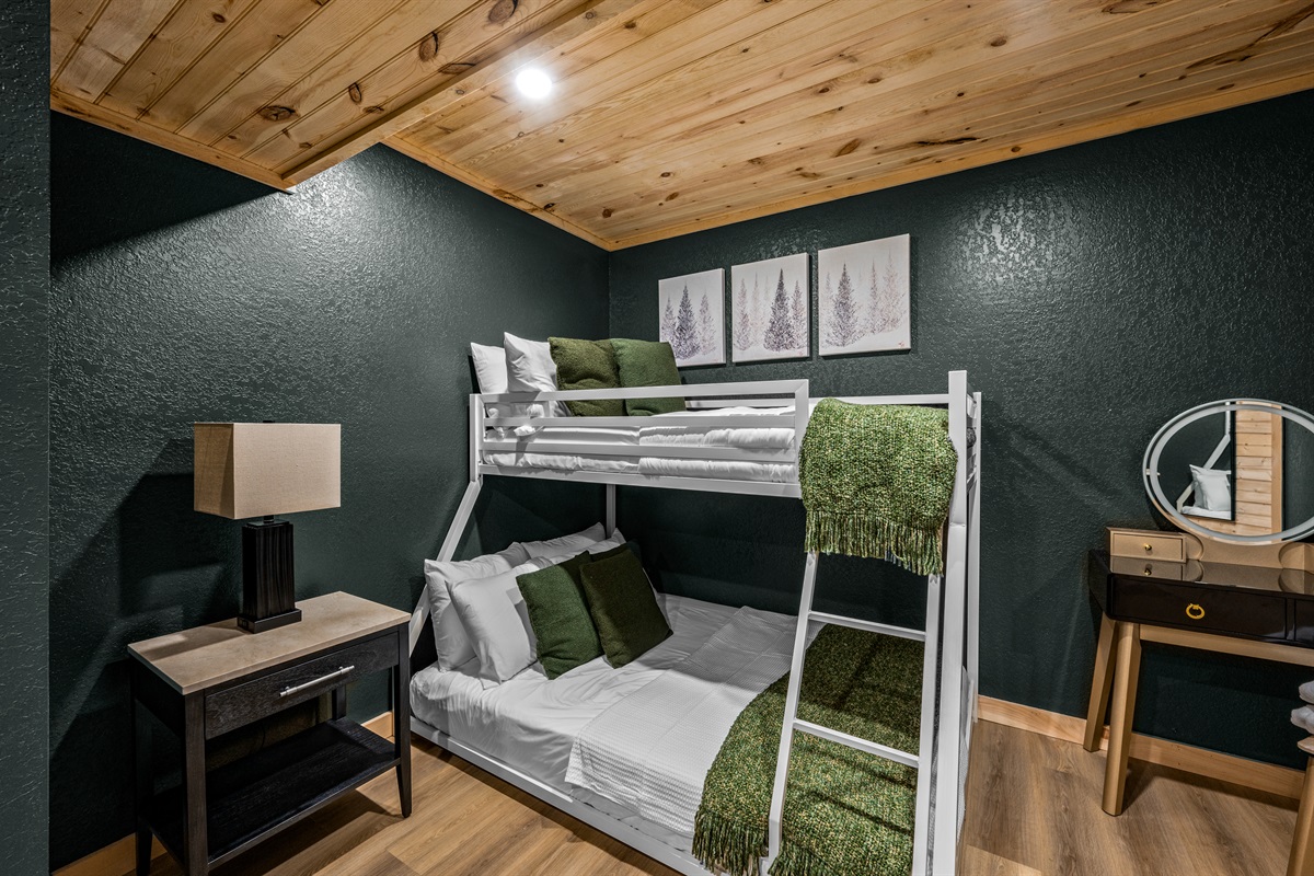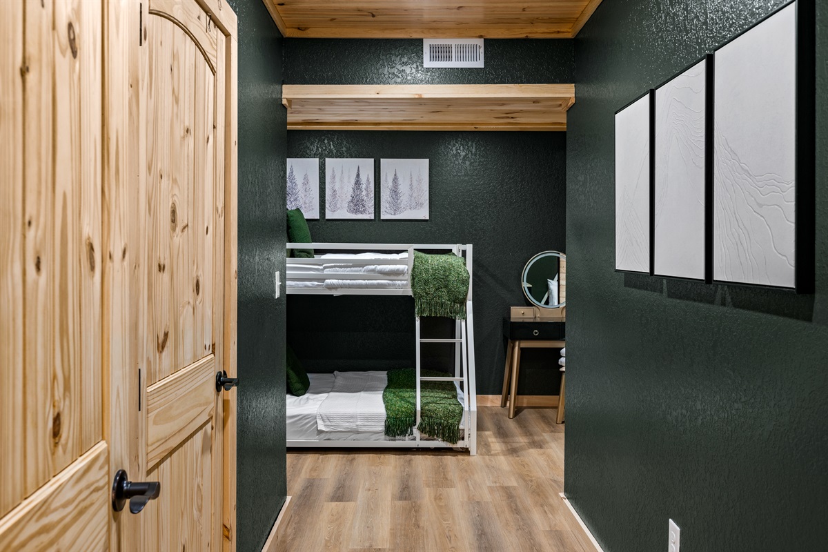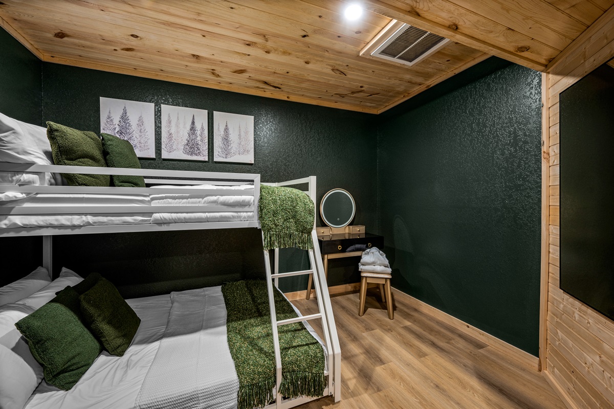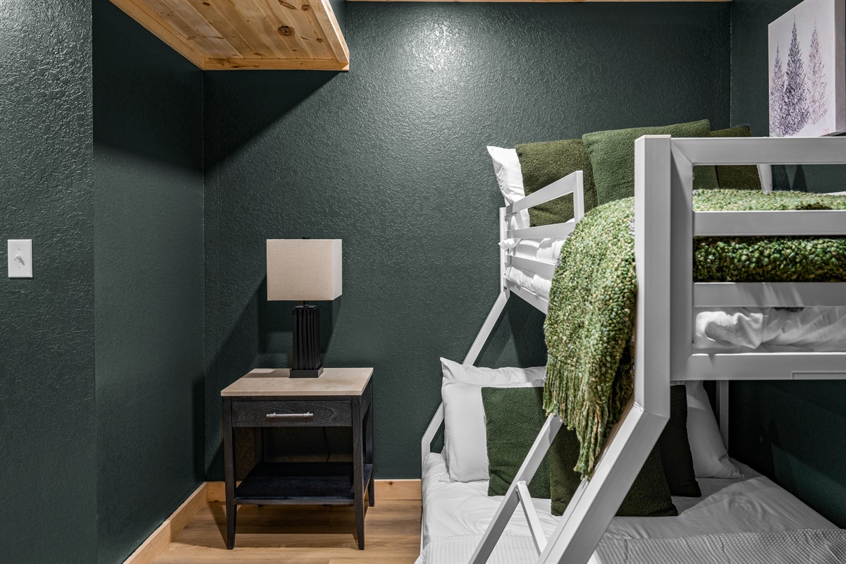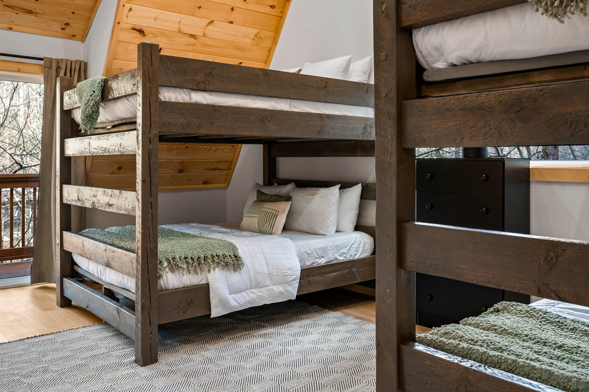 Down the hall, you'll find our Bunk suite, equipped with 2 Queen-over-Queen bunkbeds to comfortably sleep an additional 8 guests. This room also features high cathedral ceilings and offers plenty of space so that those sharing the room do not feel over-crowded. The bunk room also features a Roku Smart TV and additional electric fireplace.