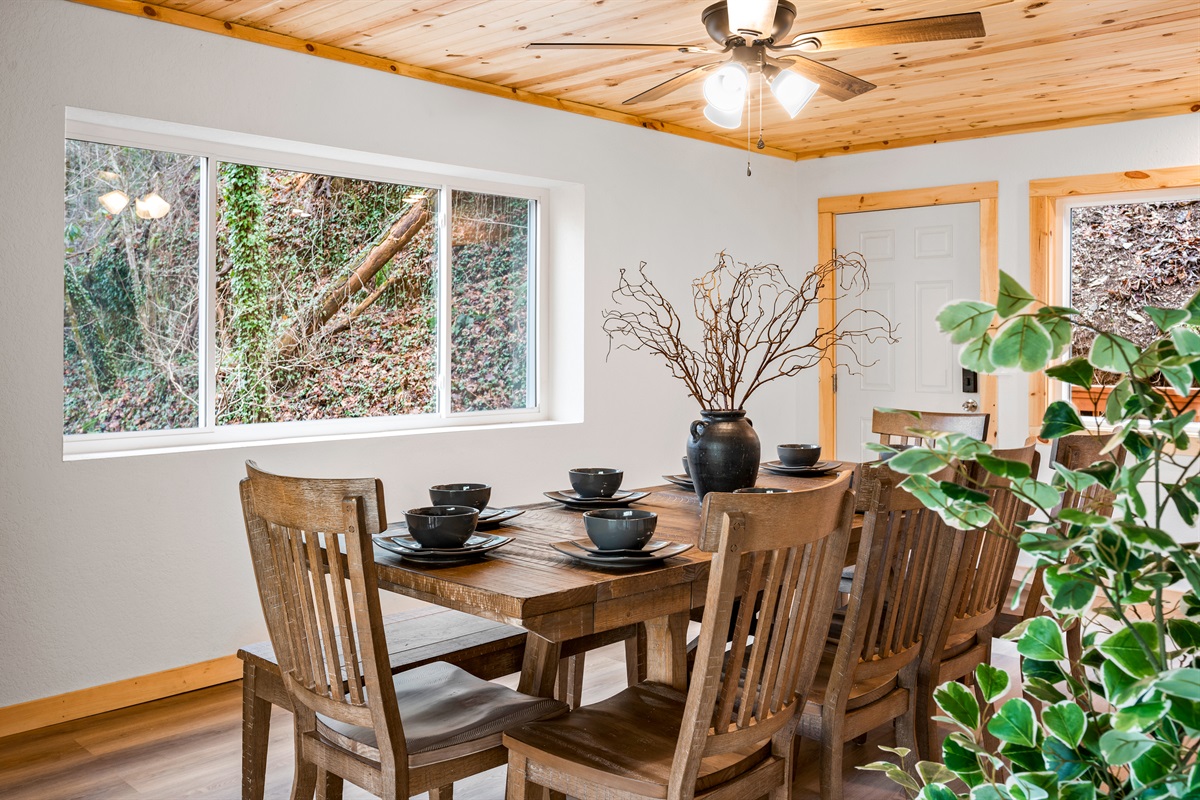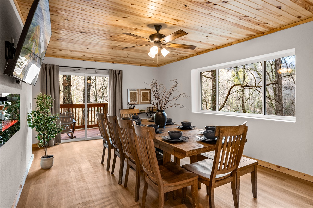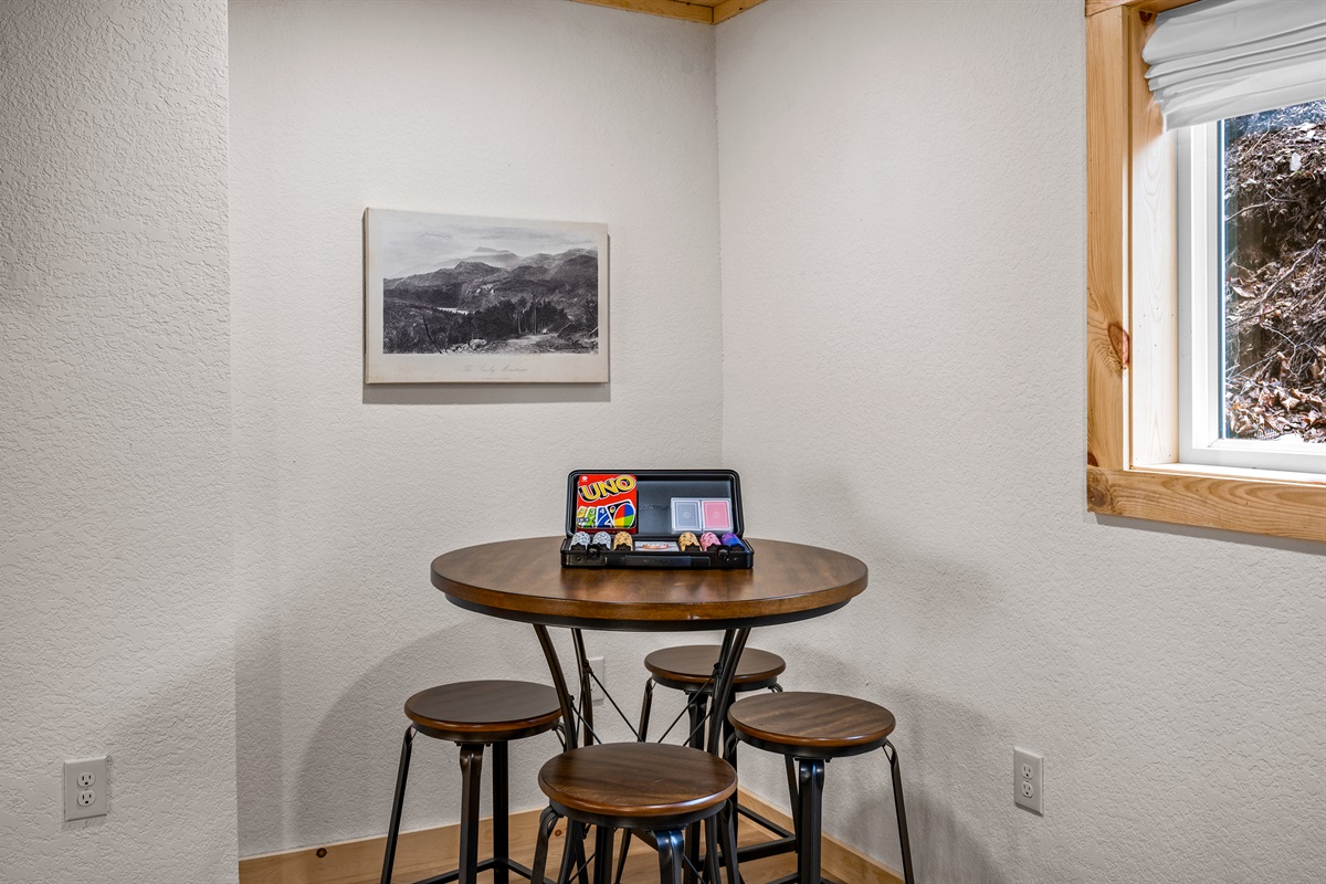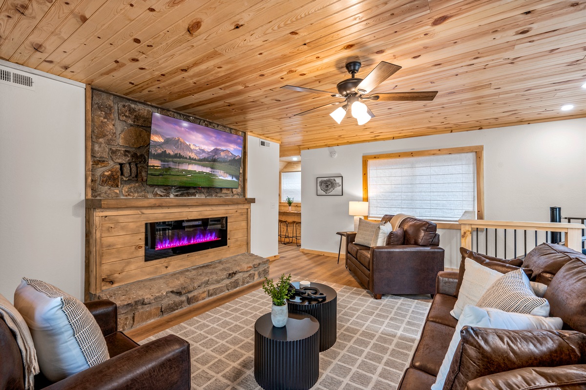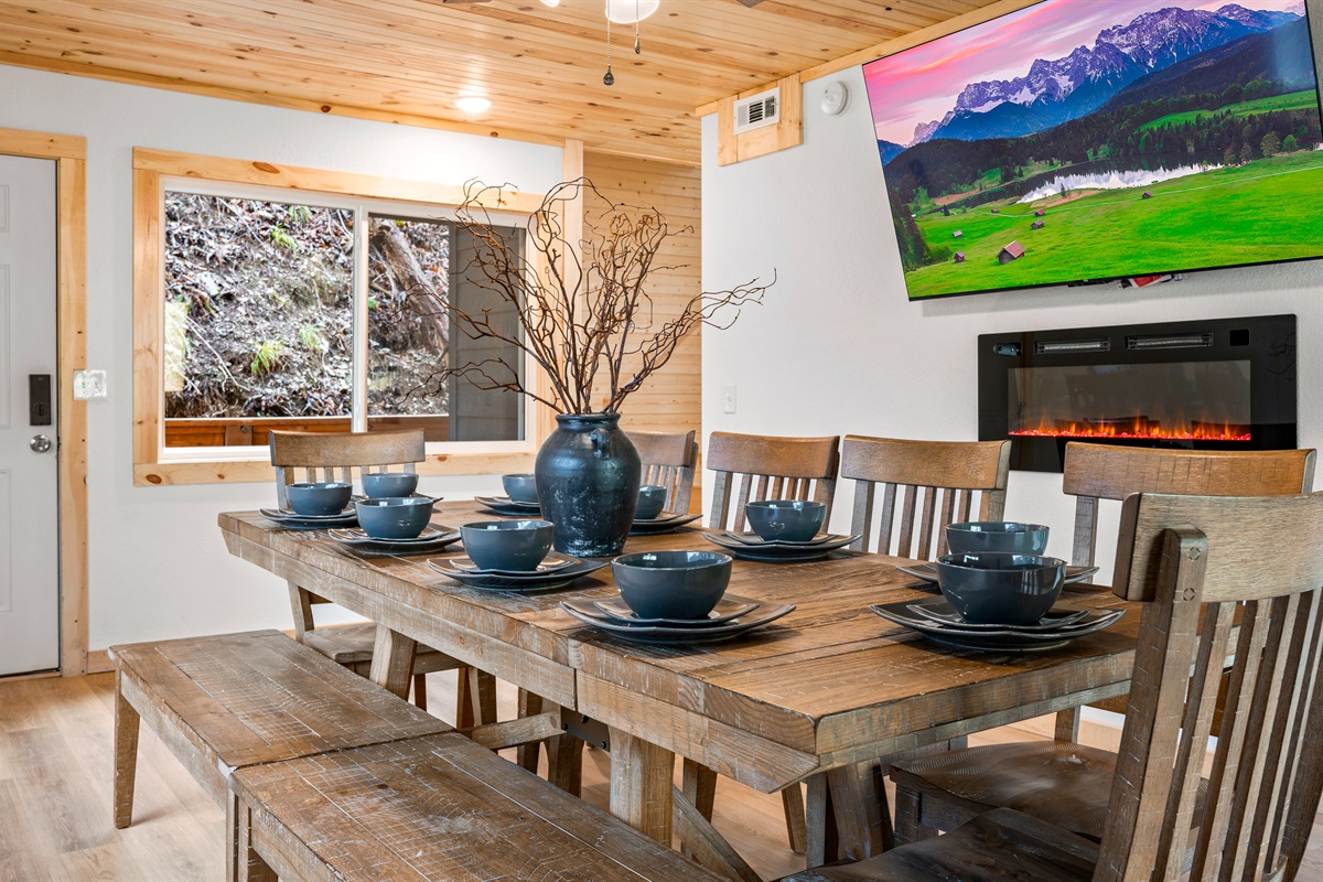 Step foot into the large dining area as you first enter the home. Our large, rustic dining table comfortably fits 10, with additional bar-height seating available in the nook and kitchen. Enjoy a home-cooked meal with the entire group, taking in the ambiance provided by the electric fireplace mounted to the wall. A large Roku Smart TV means you'll never miss a big play as you cheer on your favorite team or catch up on some shows.