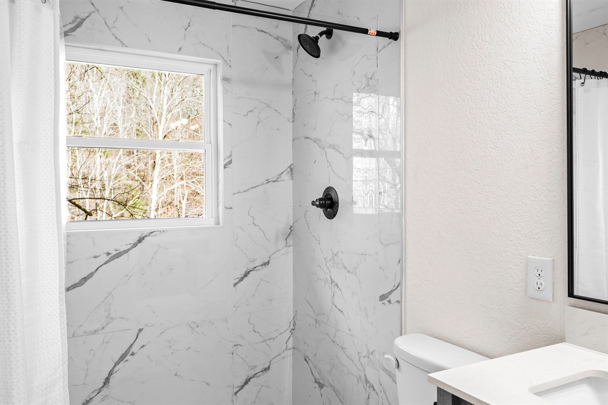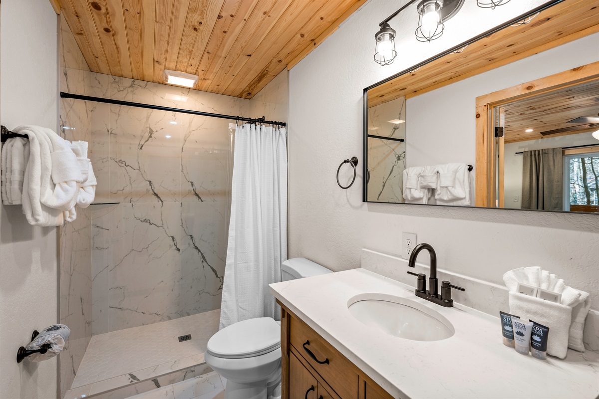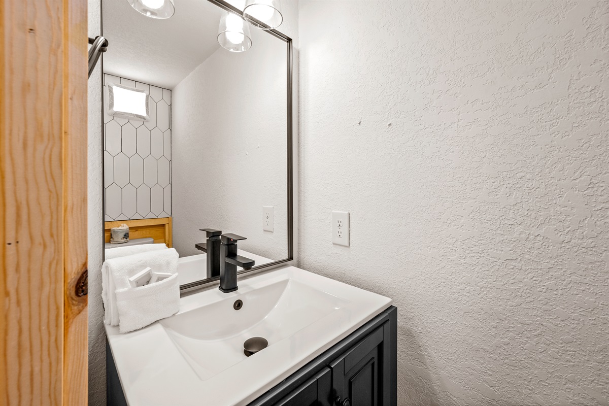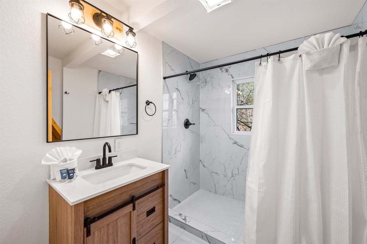The first floor King Suite offers the same cozy vibes captured on the third floor. Catch up on some shows on the Roku Smart TV, and enjoy the ambiance of another electric fireplace. Enjoy your own private full-bathroom with walk-in shower. There is private access to the lower level deck, which spans the entire length of the bottom floor, connecting to the game room entry.