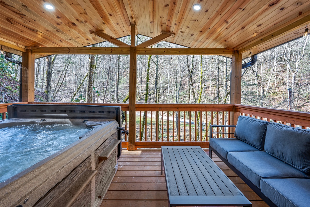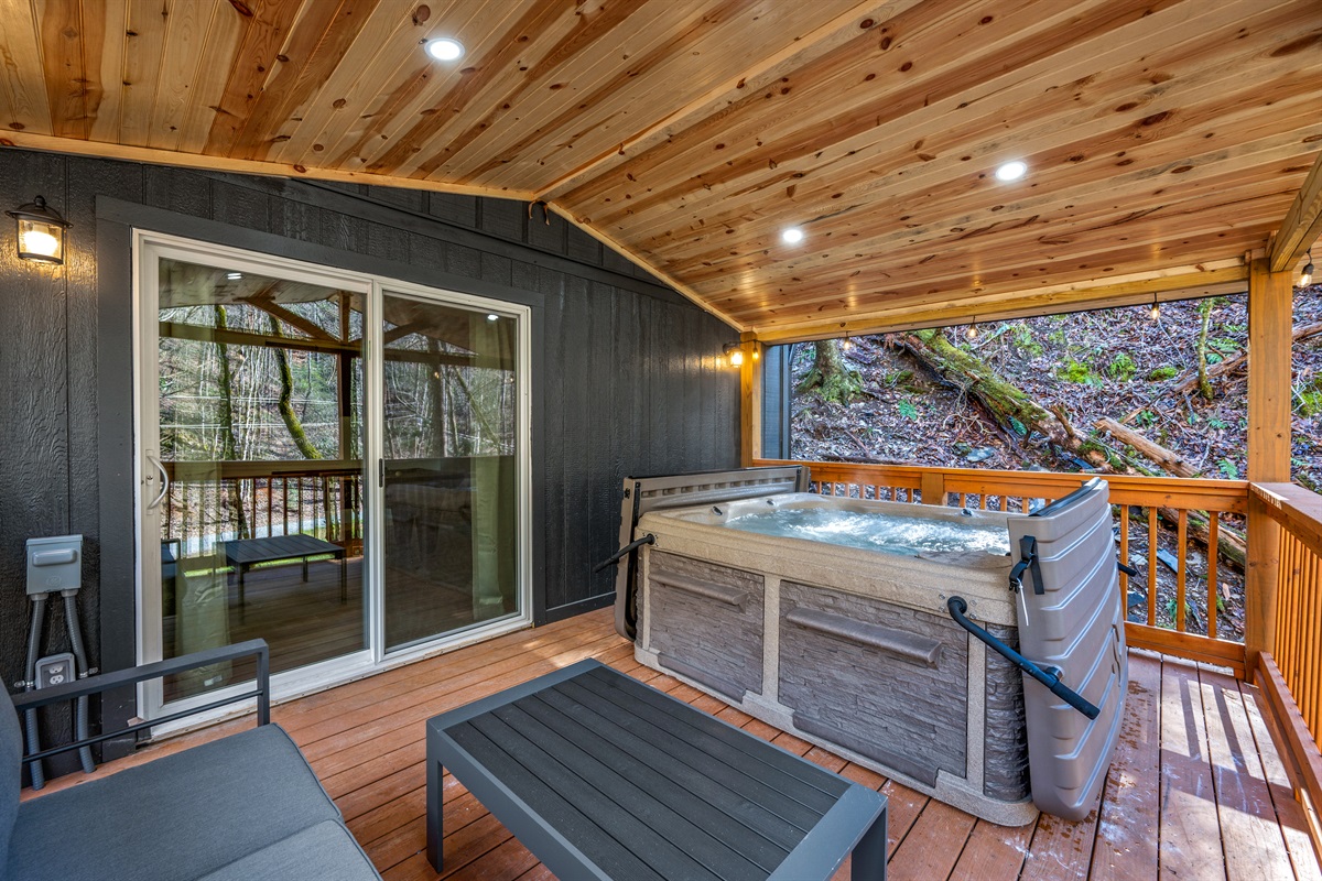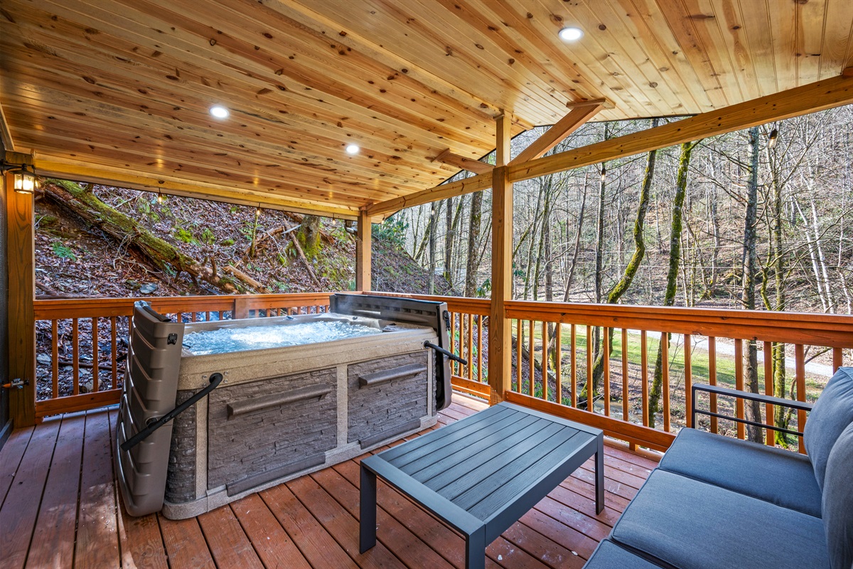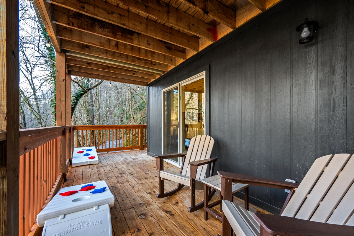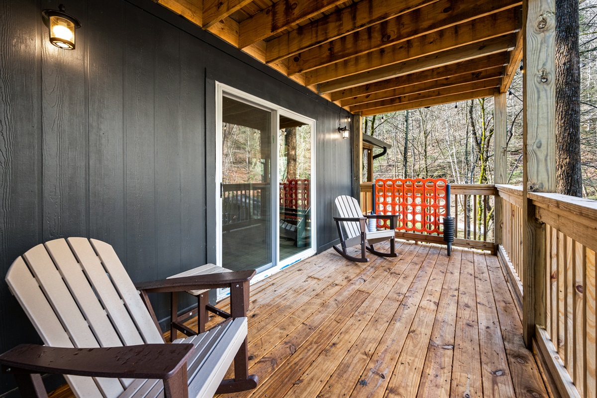 Off of the game room you'll find the side porch, where you can soak in the hot tub under glowing string lights after a long day exploring the Smokies. There is additional outdoor seating, providing the perfect hangout area for catching up with family and friends.