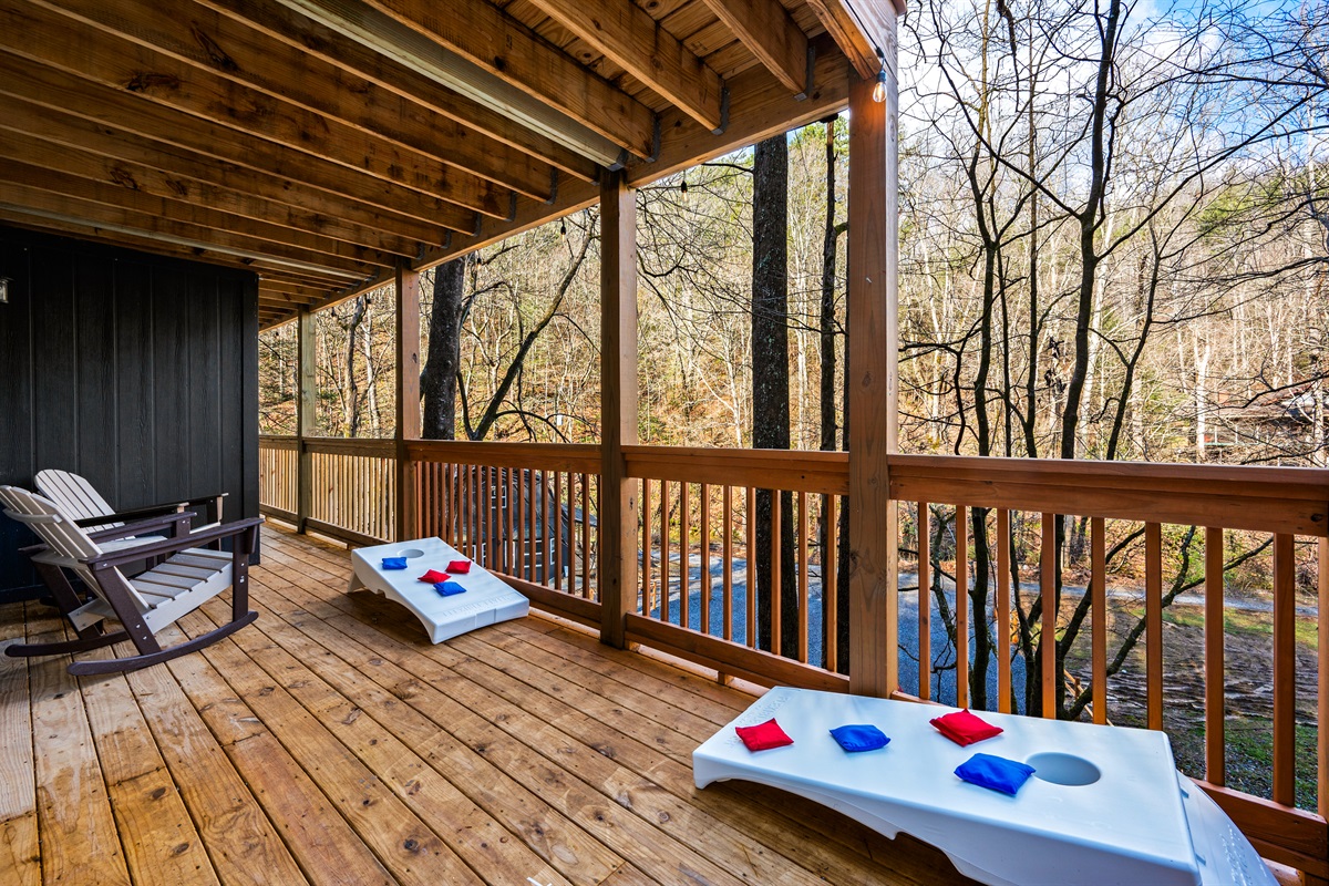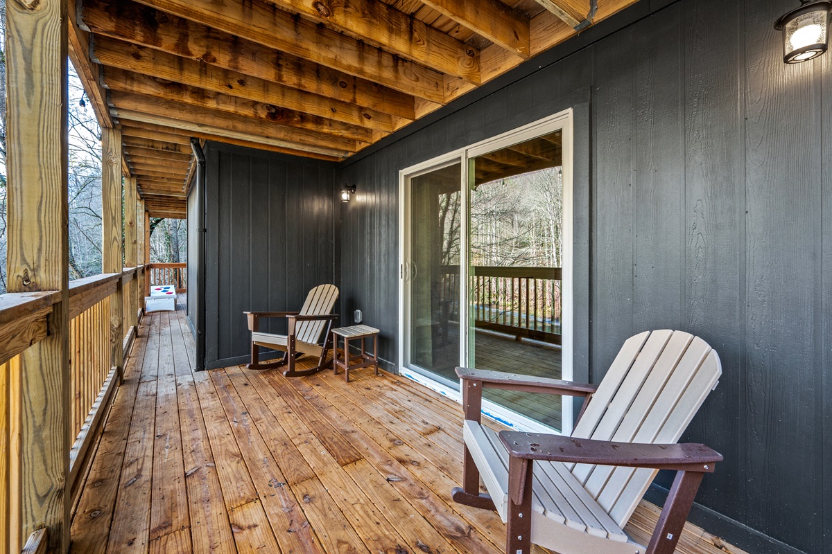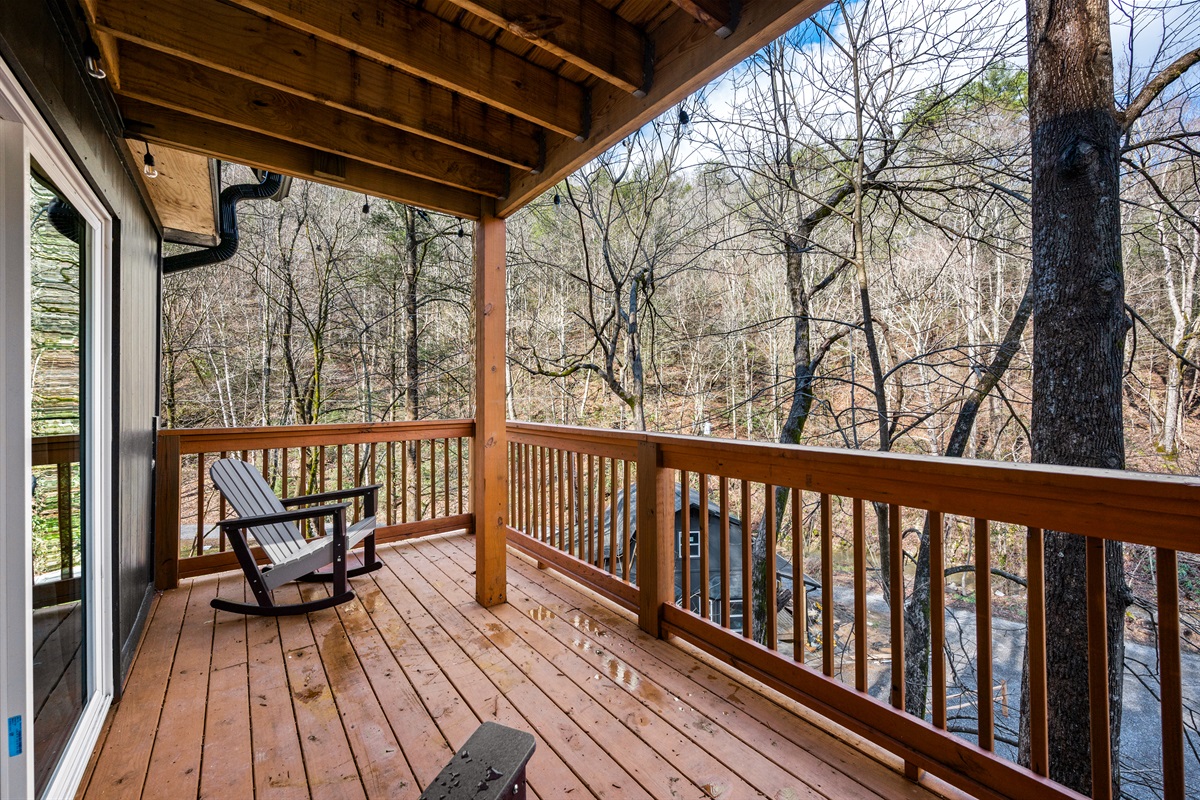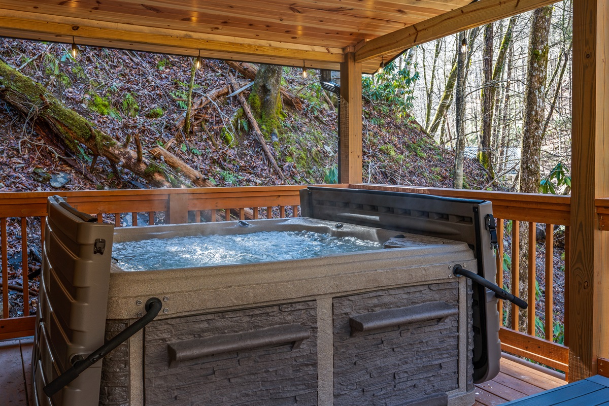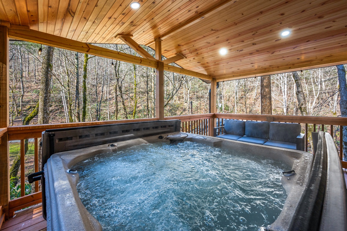 Off of the game room you'll find the side porch, where you can soak in the hot tub under glowing string lights after a long day exploring the Smokies. There is additional outdoor seating, providing the perfect hangout area for catching up with family and friends.
