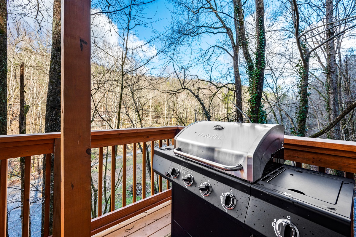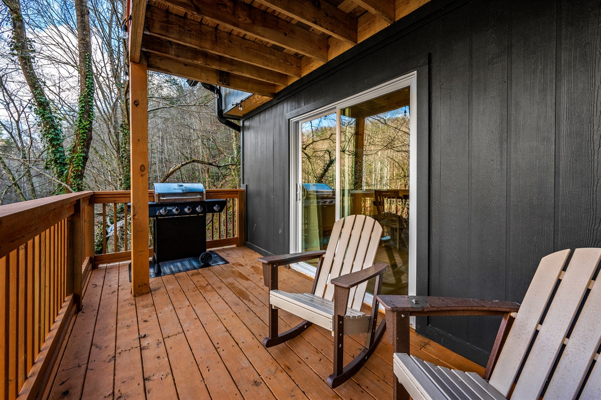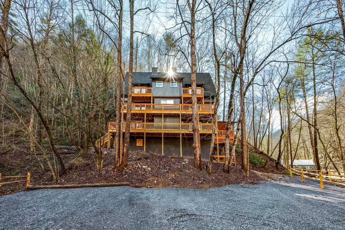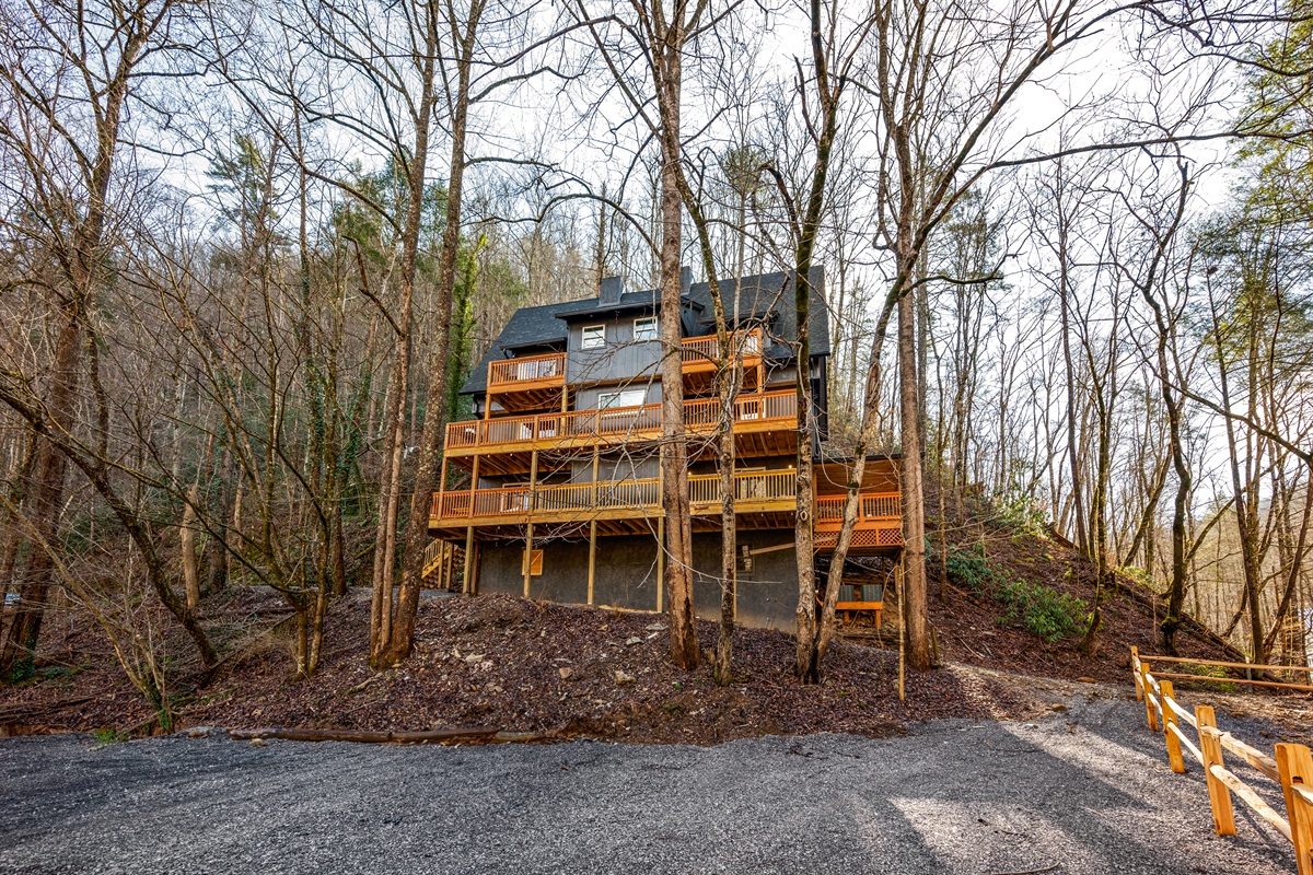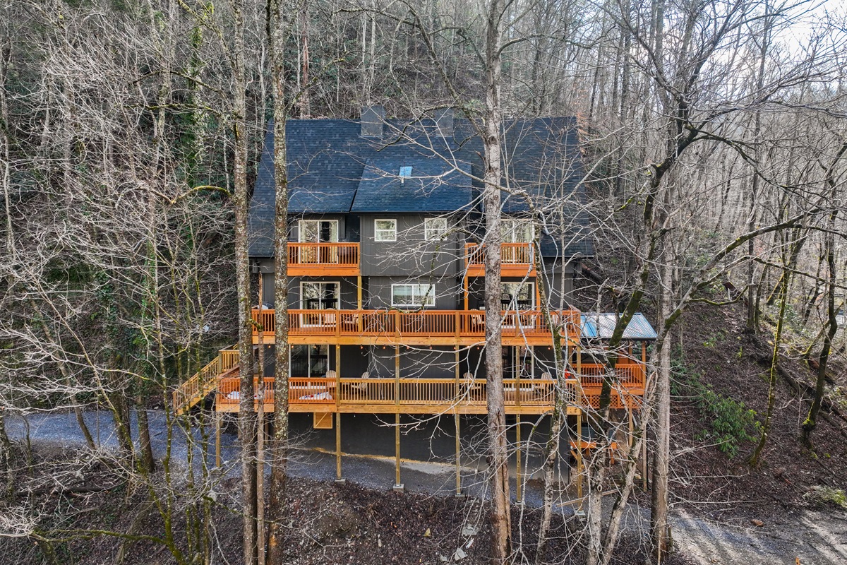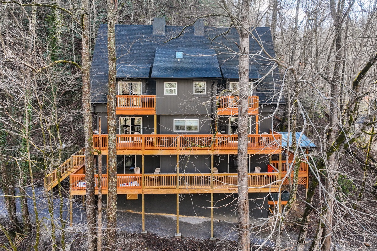 The Lodge features 2 large decks, spanning the entire length of the home, featuring life-size Connect-4, a propane grill, and ample outdoor seating for ultimate relaxation. There are 2 smaller, private balconies attached to each bedroom on the third floor.