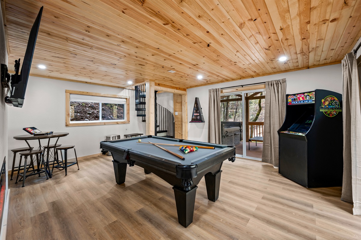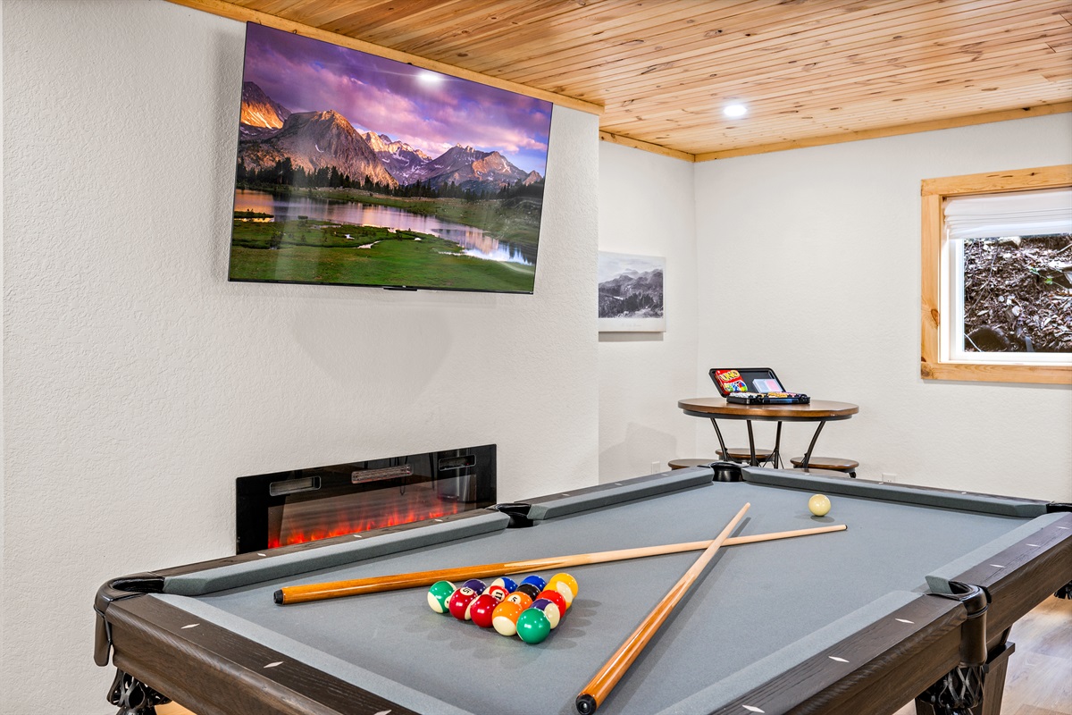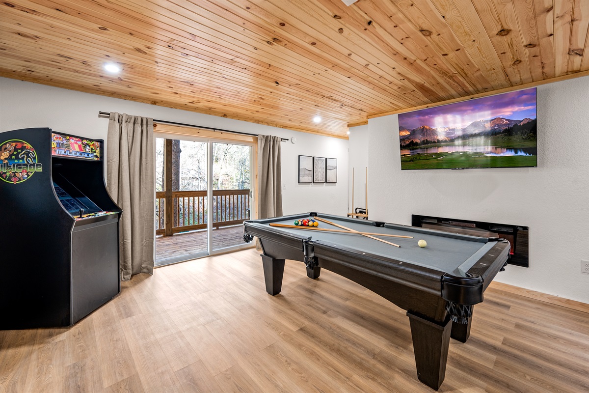The game room is the best room in the house and is also located on the first floor. Our game room features a full-size pool table, multi-game Arcade console, Boss Toss, various board games, a large Roku Smart TV, and electric fireplace. This room is guaranteed to keep your group entertained for hours, as there is something for everyone. Enjoy separate access to the front porch, where you'll find life-size Connect 4 and additional outdoor seating.