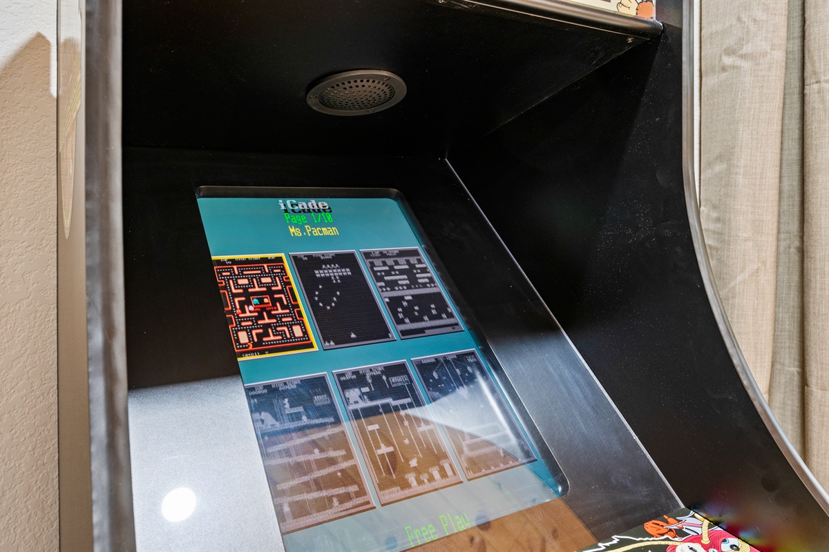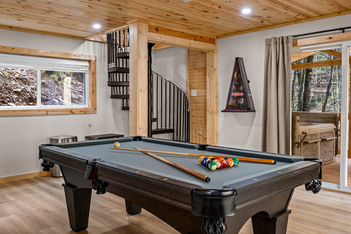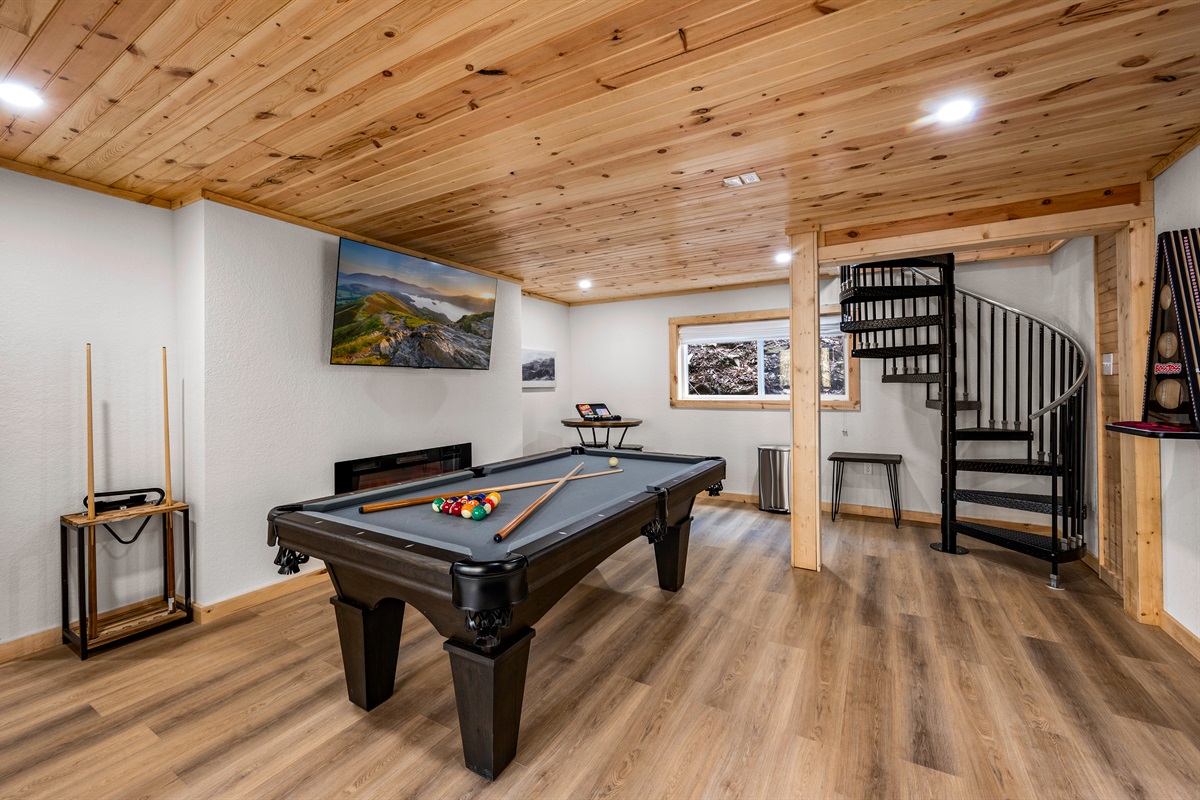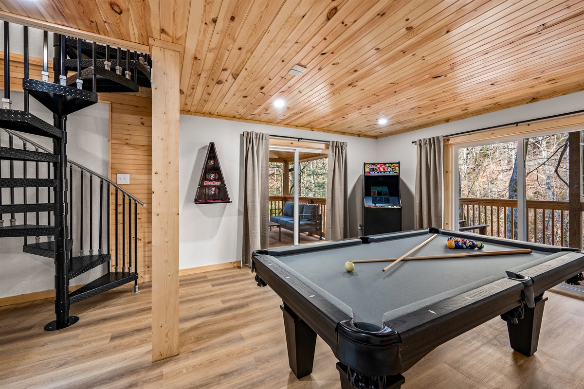 The game room is the best room in the house and is also located on the first floor. Our game room features a full-size pool table, multi-game Arcade console, Boss Toss, various board games, a large Roku Smart TV, and electric fireplace. This room is guaranteed to keep your group entertained for hours, as there is something for everyone. Enjoy separate access to the front porch, where you'll find life-size Connect 4 and additional outdoor seating.