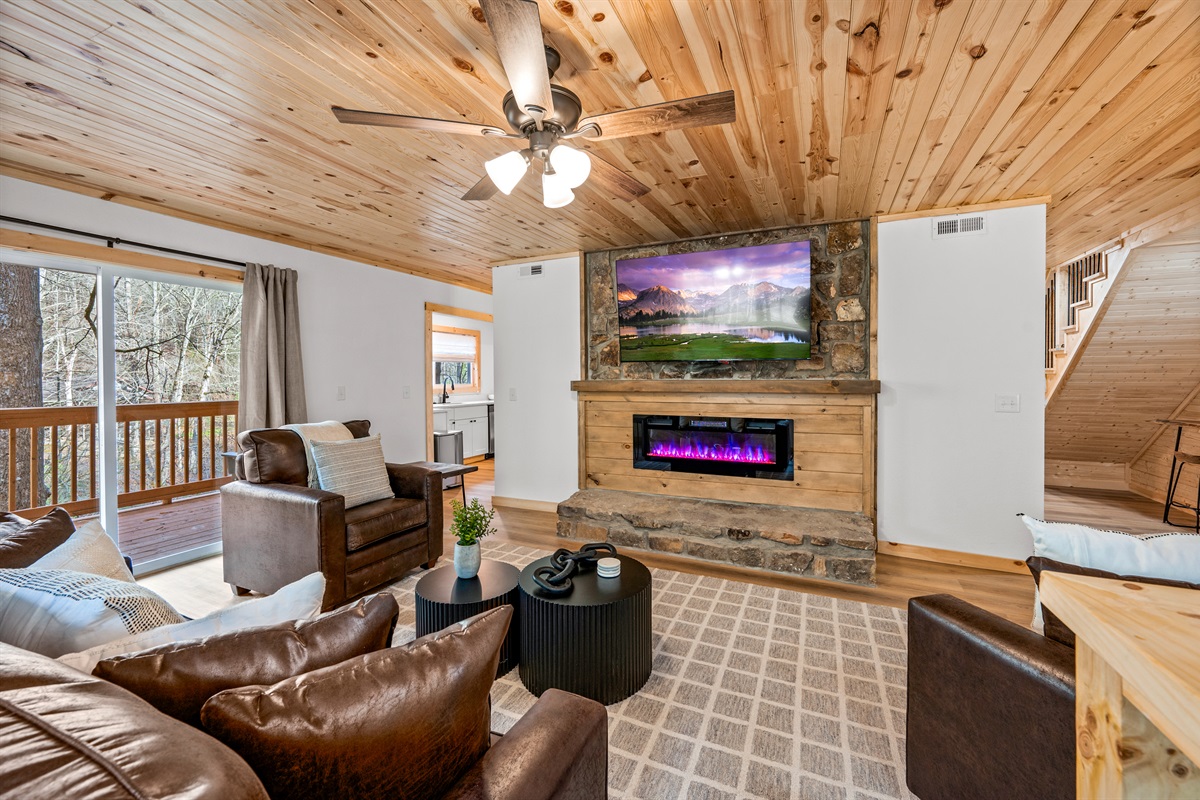 Gather around the fireplace in the with your loved ones- playing games, or watching your favorite shows. The Roku Smart TV is set to Guest Mode, so you can stream on your favorite apps throughout your stay and be automatically logged-out on the day you depart. The couch doubles as a pullout sleeper sofa, providing an extra sleeping area for your group.