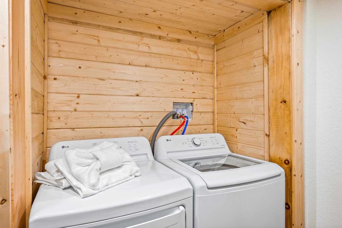 Laundry includes a full size washer & dryer in the first floor bunk room closet, and starter laundry soap. Iron and ironing board should be hanging in the laundry closet.