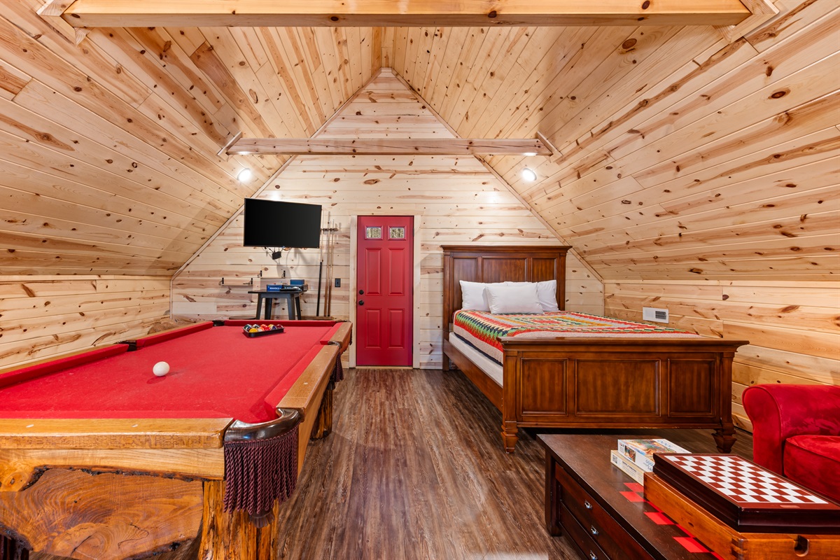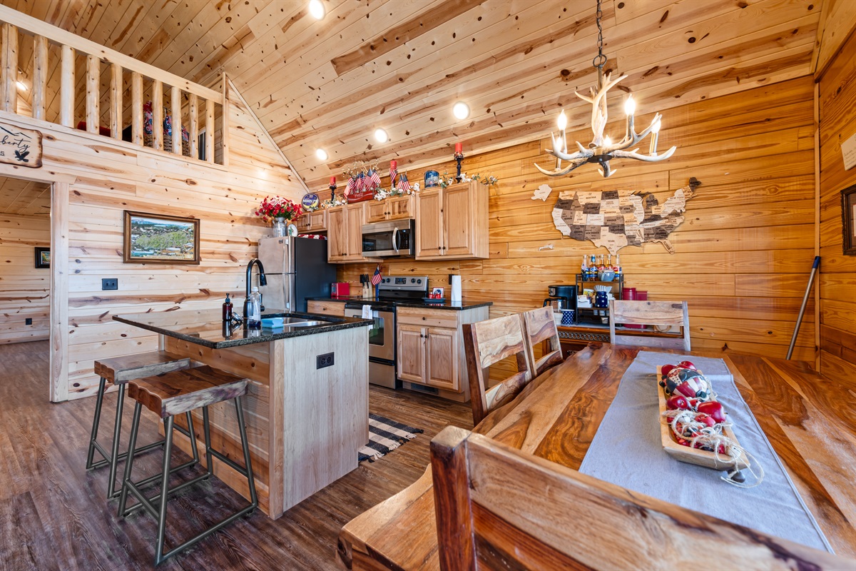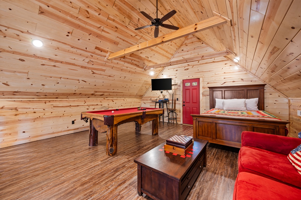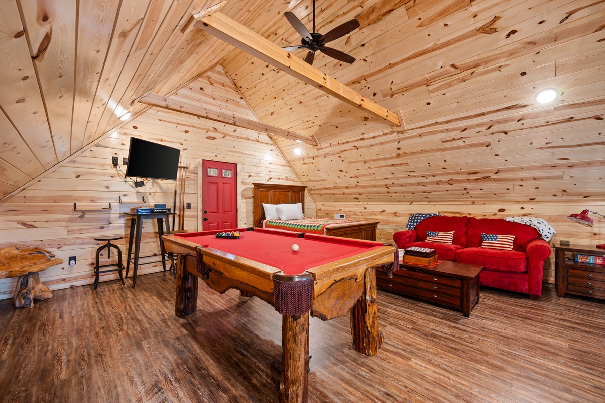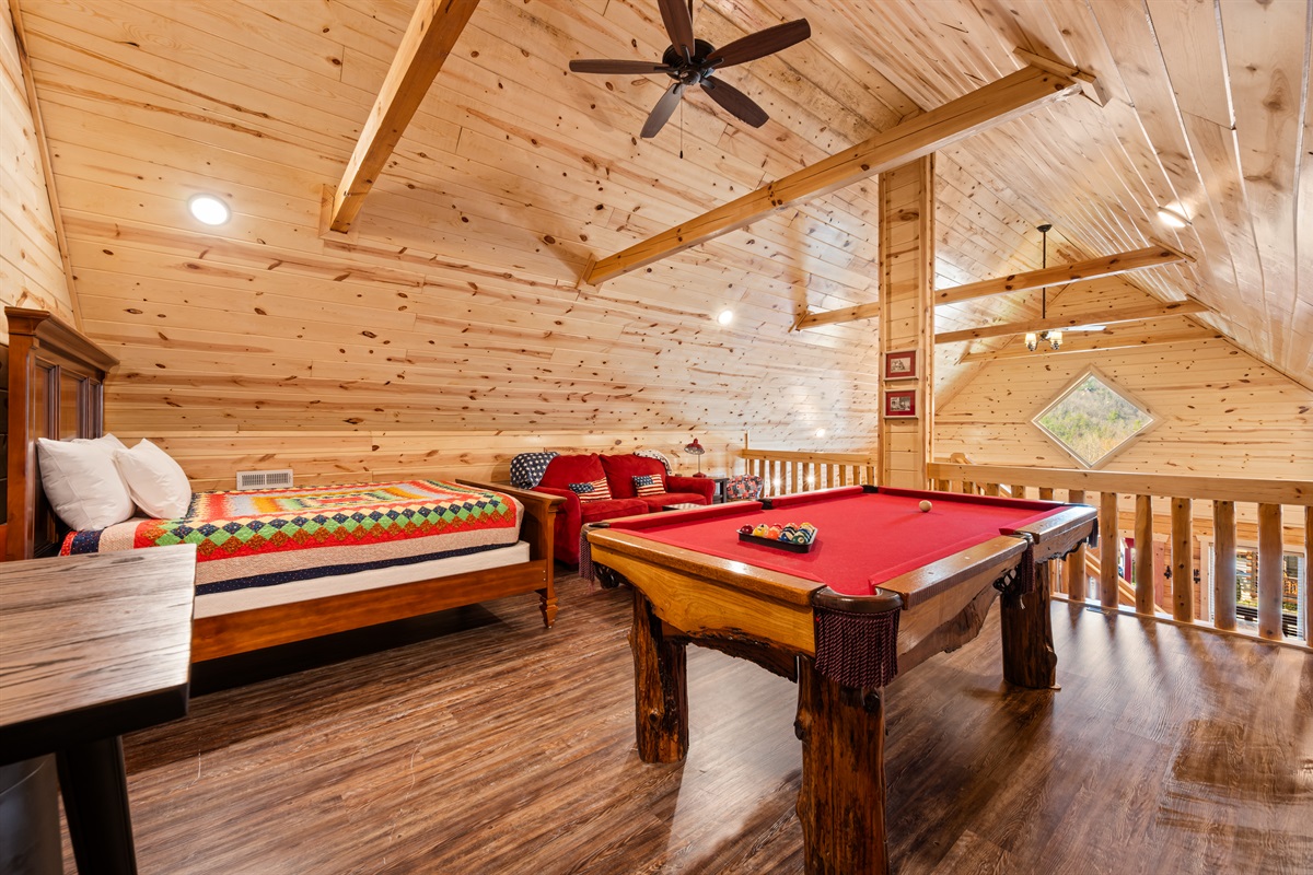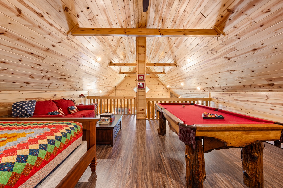 Welcome to Sweet Liberty. This property backs right up to the Great Smoky Mountains National Park! Your back deck makes you feel like you're surrounded by nature, but in the comfort of a resort. Unwind in the hot tub after a long day of hiking and exploring the town. You have two bedrooms on the main level, and an open loft with a futon. Up in the loft enjoy a friendly game of pool. At the main clubhouse, there is a season outdoor pool, and fitness center! Snuggle around the gas fireplace in the colder months, it's operational from Oct. - Mar.! Enjoy the communal gas grills located in front of the cabin!