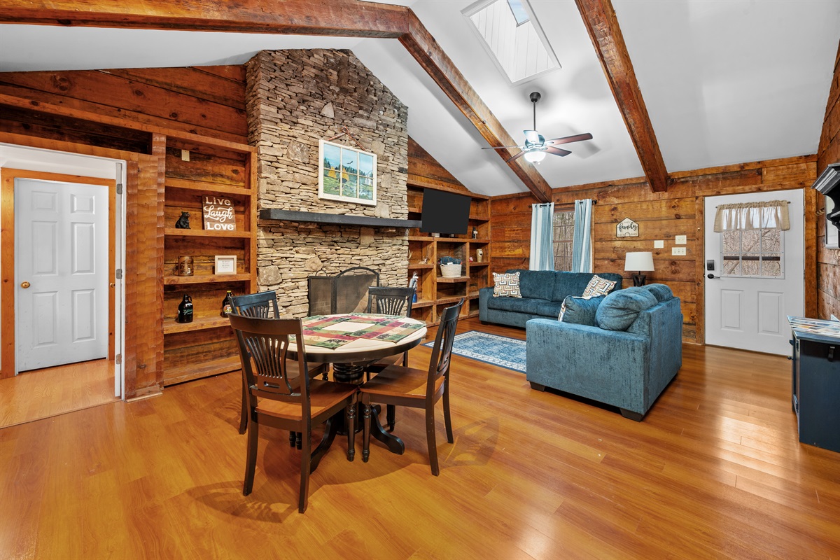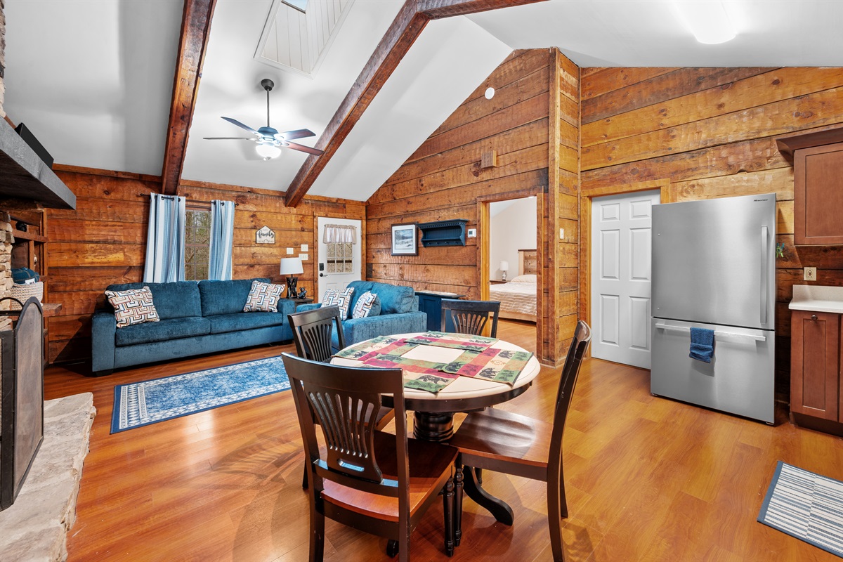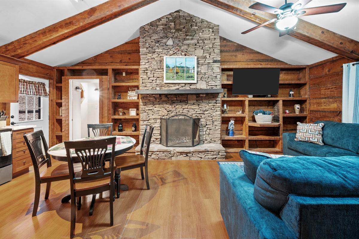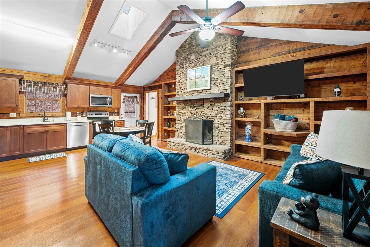 The open-concept living area features a cozy fireplace, Smart TV, and comfortable seating, making it a great place to relax after a full day of adventure. The kitchen and dining area provide everything needed to prepare simple meals during your stay.